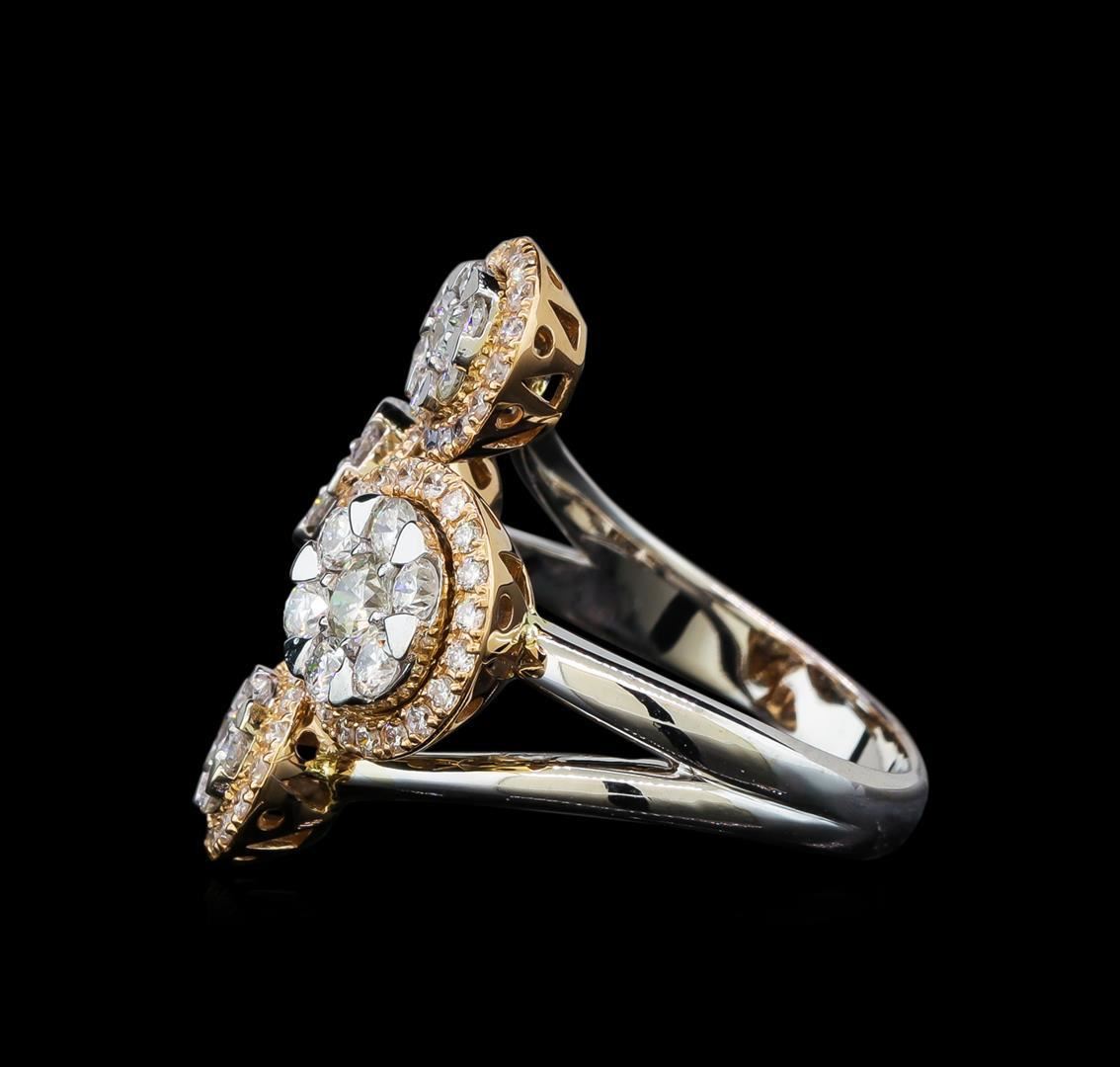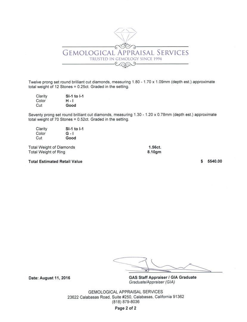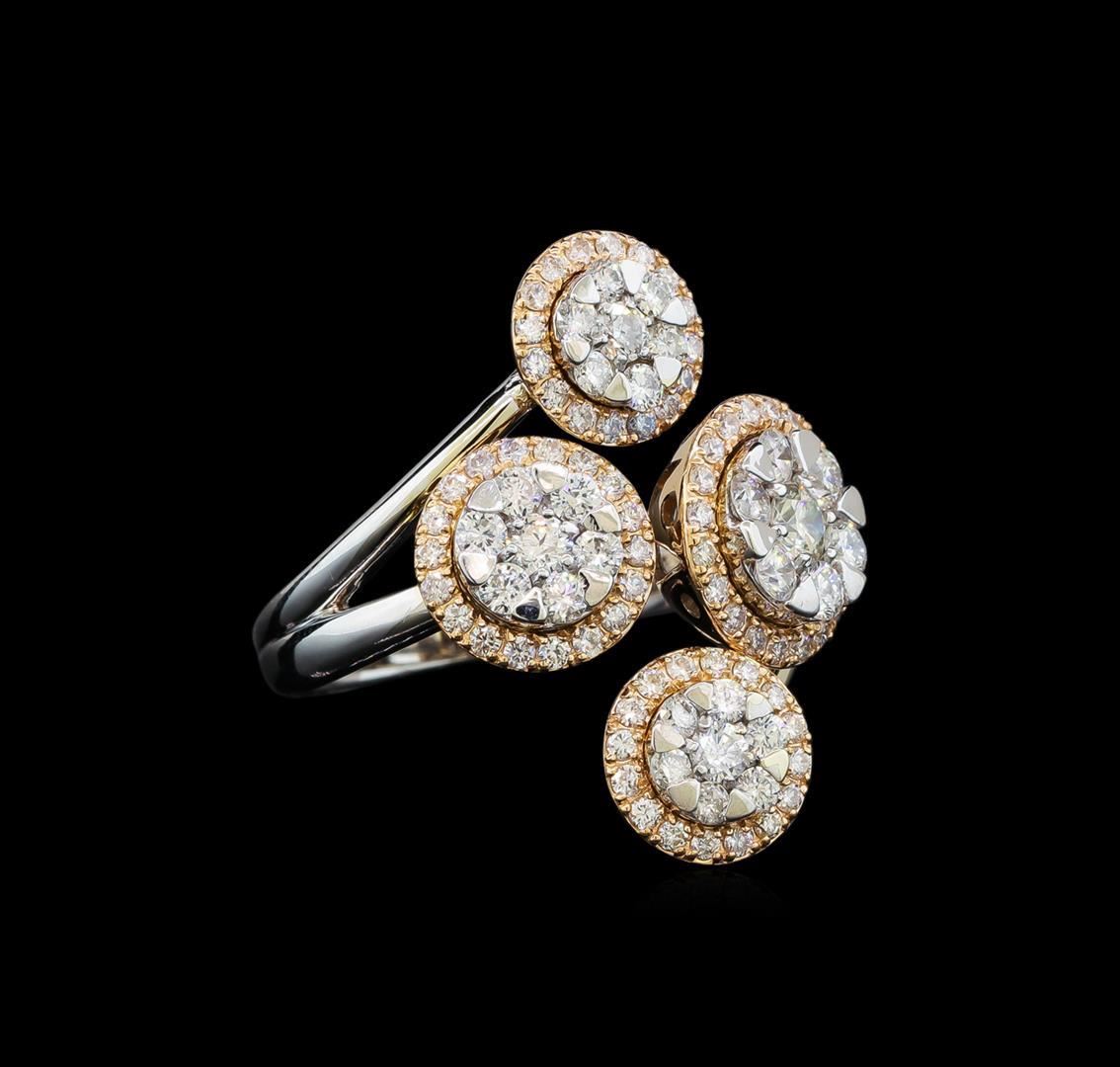 One electronically tested 14KT rose and white gold lady's combination cast & assembled fashion ring with a split shank with a bright polish finish. The featured lady's ring has four circular diamond clusters and a shank measuring 3.02 millimeters wide. Identified with markings of '585'. Condition is new, good workmanship. Containing: One prong set round brilliant cut diamond, measuring 3.45 - 3.40 x 2.13mm (depth est.) approximate weight of 0.15ct. Graded in the setting. Clarity SI-1. Color: J - K Cut Good Eight prong set round brilliant cut diamonds, measuring 2.40 - 2.35 x 1.45mm (depth est.) approximate total weight of 8 Stones = 0.40ct. Graded in the setting. Clarity SI-1 to SI-2. Color: H - I Cut Good One prong set round brilliant cut diamond, measuring 2.70 - 2.65 x 1.61mm (depth est.) approximate weight of 0.07ct. Graded in the setting. Clarity I-1. Color: H Cut Good Six prong set round brilliant cut diamonds, measuring 2.00 - 1.90 x 1.21mm (depth est.) approximate total weight of 6 Stones = 0.17ct. Graded in the setting. Clarity SI-1 to SI-2. Color: H - I Cut Good Twelve prong set round brilliant cut diamonds, measuring 1.80 - 1.70 x 1.09mm (depth est.) approximate total weight of 12 Stones = 0.25ct. Graded in the setting. Clarity SI-1 to I-1. Color: H - I Cut Good Seventy prong set round brilliant cut diamonds, measuring 1.30 - 1.20 x 0.78mm (depth est.) approximate total weight of 70 Stones = 0.52ct. Graded in the setting. Clarity SI-1 to I-1. Color: G - I Cut Good. Total Weight of Diamonds 1.56ct.. Total Weight of Ring 8.10gm. GAS Appraised.