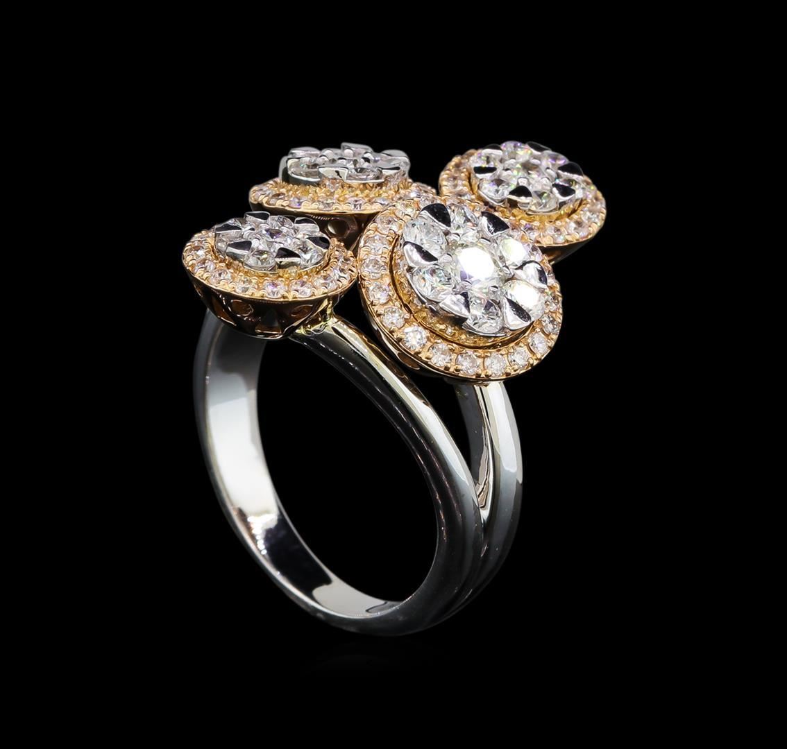 One electronically tested 14KT rose and white gold lady's combination cast & assembled fashion ring with a split shank with a bright polish finish. The featured lady's ring has four circular diamond clusters and a shank measuring 3.02 millimeters wide. Identified with markings of '585'. Condition is new, good workmanship. Containing: One prong set round brilliant cut diamond, measuring 3.45 - 3.40 x 2.13mm (depth est.) approximate weight of 0.15ct. Graded in the setting. Clarity SI-1. Color: J - K Cut Good Eight prong set round brilliant cut diamonds, measuring 2.40 - 2.35 x 1.45mm (depth est.) approximate total weight of 8 Stones = 0.40ct. Graded in the setting. Clarity SI-1 to SI-2. Color: H - I Cut Good One prong set round brilliant cut diamond, measuring 2.70 - 2.65 x 1.61mm (depth est.) approximate weight of 0.07ct. Graded in the setting. Clarity I-1. Color: H Cut Good Six prong set round brilliant cut diamonds, measuring 2.00 - 1.90 x 1.21mm (depth est.) approximate total weight of 6 Stones = 0.17ct. Graded in the setting. Clarity SI-1 to SI-2. Color: H - I Cut Good Twelve prong set round brilliant cut diamonds, measuring 1.80 - 1.70 x 1.09mm (depth est.) approximate total weight of 12 Stones = 0.25ct. Graded in the setting. Clarity SI-1 to I-1. Color: H - I Cut Good Seventy prong set round brilliant cut diamonds, measuring 1.30 - 1.20 x 0.78mm (depth est.) approximate total weight of 70 Stones = 0.52ct. Graded in the setting. Clarity SI-1 to I-1. Color: G - I Cut Good. Total Weight of Diamonds 1.56ct.. Total Weight of Ring 8.10gm. GAS Appraised.