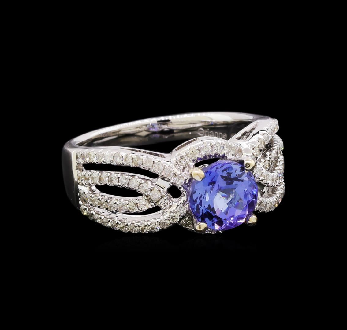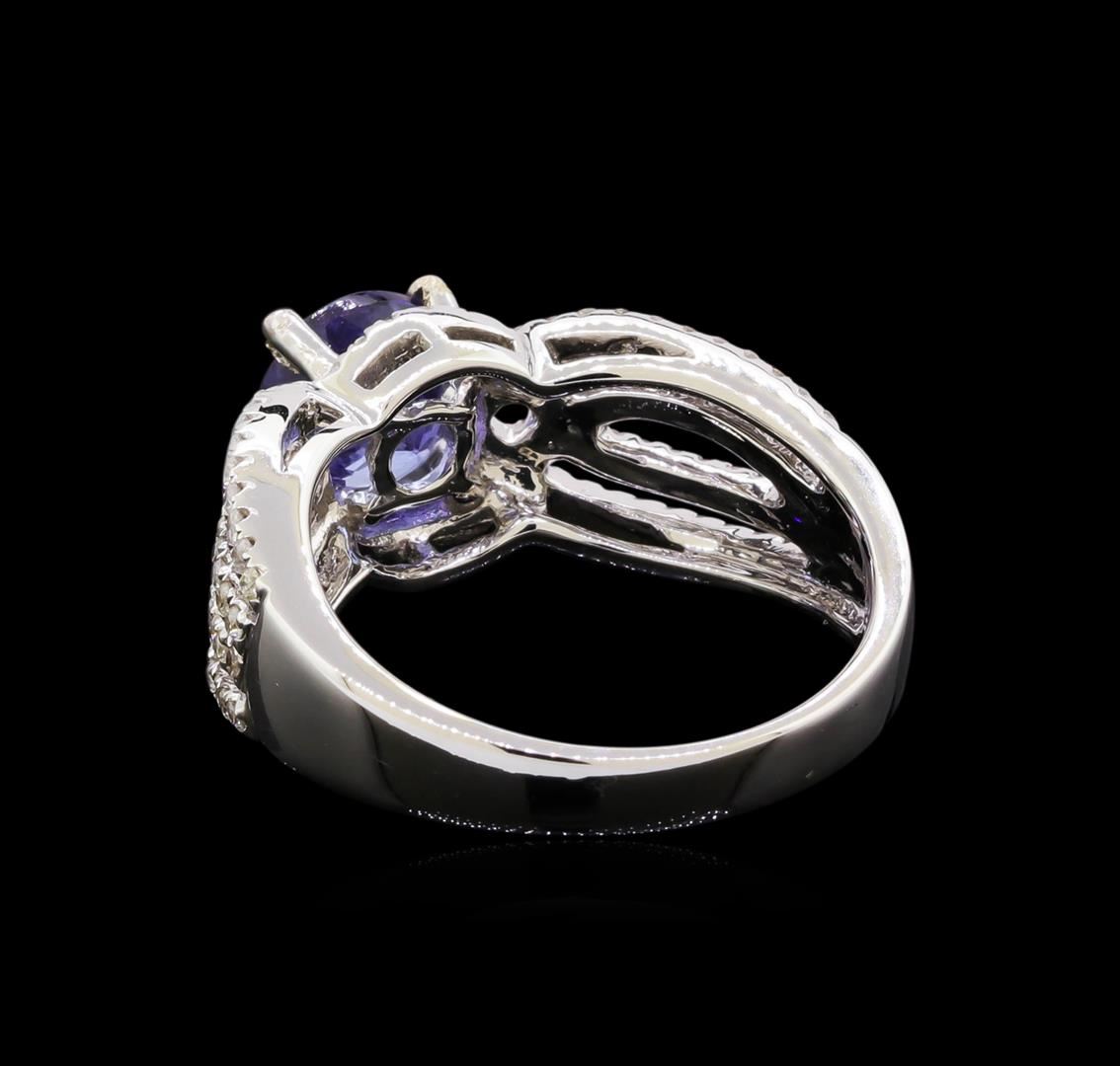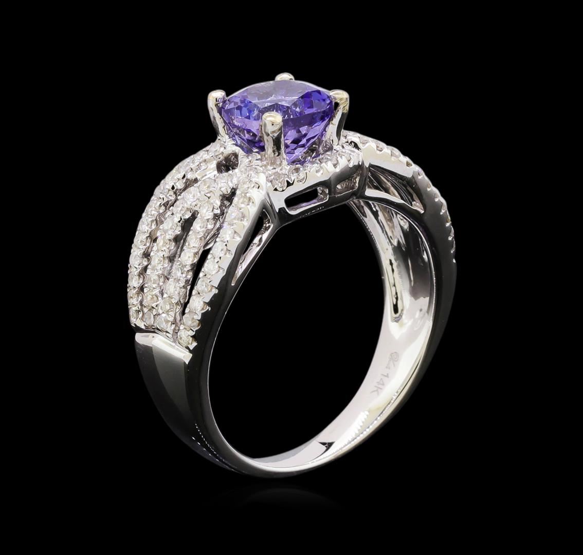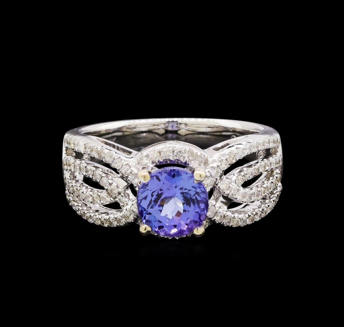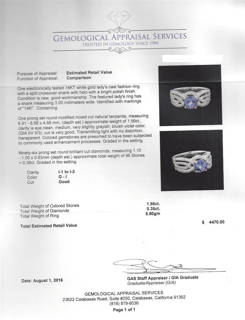 One electronically tested 14KT white gold lady's cast fashion ring with a split crossover shank with halo with a bright polish finish. Condition is new, good workmanship. The featured lady's ring has a shank measuring 3.00 millimeters wide. Identified with markings of 14K. Containing: One prong set round modified mixed cut natural tanzanite, measuring 6.91 - 6.88 x 4.88 mm (depth est.) approximate weight of 1.56ct., clarity is eye clean, medium, very slightly grayish, bluish violet color, (GIA bV 5/3), cut is very good. Transmitting light with no distortion, transparent. Colored gemstones are presumed to have been subjected to commonly used enhancement processes. Graded in the setting. Ninety-six prong set round brilliant cut diamonds, measuring 1.10 - 1.00 x 0.63 mm (depth est.) approximate total weight of 96 Stones = 0.38ct. Graded in the setting. Clarity: I-1 to I-2. Color: G - I. Cut: Good. Total Weight of Colored Stones 1.56ct. Total Weight of Diamonds 0.38ct. Total Weight of Ring 5.80 grams. GAS Appraised at $4,470.00.