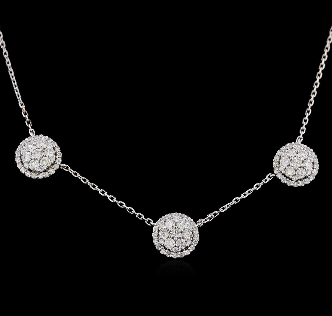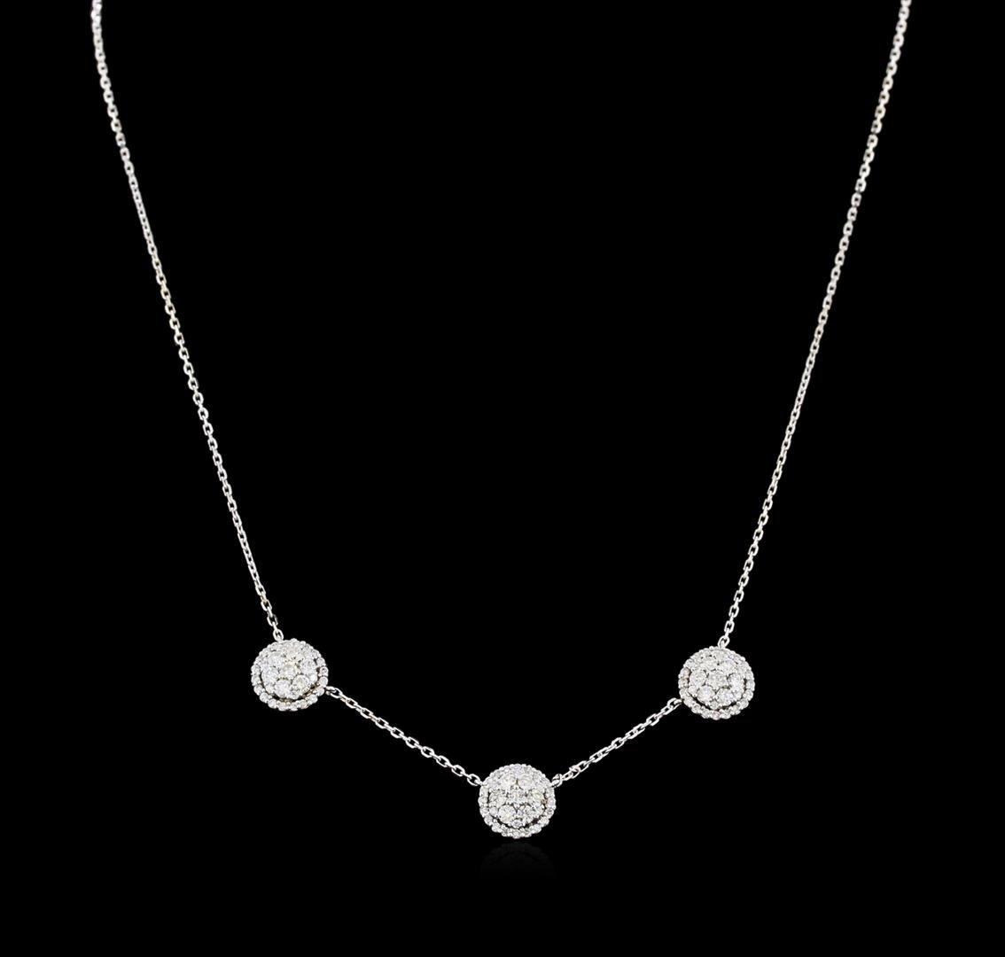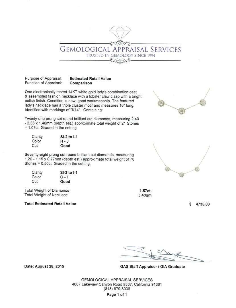 One electronically tested 14KT white gold lady's combination cast & assembled fashion necklace with a lobster claw clasp with a bright polish finish. The featured lady's necklace has a triple cluster motif and measures 16" long. Identified with markings of "K14". Condition is new, good workmanship. Containing: Twenty-One prong set round brilliant cut diamonds, measuring 2.40 - 2.35 x 1.48mm (depth est.) approximate total weight of 21 Stones = 1.07ct. Graded in the setting. Clarity: SI-2 to I-1. Color: H - Good Seventy-Eight prong set round brilliant cut diamonds, measuring 1.20 - 1.15 x 0.77mm (depth est.) approximate total weight of 78 Stones = 0.50ct. Graded in the setting. Clarity: SI-2 to I-1. Color: G - I. Cut Good. Total Weight of Diamonds 1.57ct. Total Weight of Necklace 5.40gm. GAS Appraised at $4,735.00.