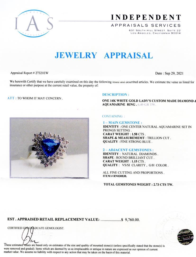 1.58ct Aquamarine and 1.15ctw Diamond 14K White Gold Ring. ONE 14K WHITE GOLD LADY'S CUSTOM MADE DIAMOND 6 AQUAMARINE RING. 6.40 GR TW CONTAINING: 1 â€" MAIN GEMSTONE : IDENTITY : ONE CENTER NATURAL AQUAMARINE SET IN PRONGS SETTING. CARAT WEIGHT : 1.58 CT. SHAPE & MEASUREMEMT : TRILLION CUT. QUALITY : FINE STRONG BLUE. 2 â€" ADJACENT GEMSTONES : IDENTITY : NATURAL DIAMONDS. SHAPE : ROUND BRILLIANT CUT. CARAT WEIGHT : 1.15 CTW. QUALITY : VS/SI CLARITY , G/H COLOR. ALL FINE CUTTING AND PROPORTIONS. TOTAL GEMSTONES WEIGHT : 2.73 CTW.