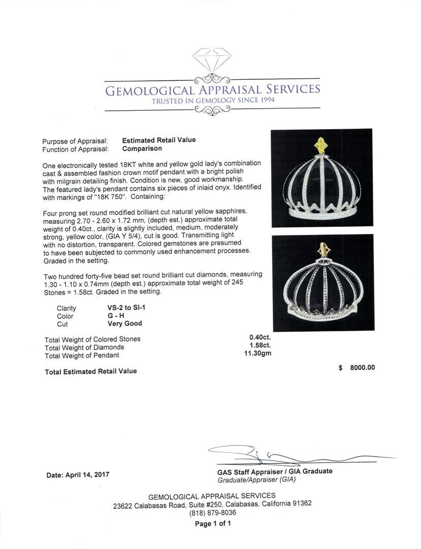 One electronically tested 18KT white and yellow gold lady's combination cast & assembled fashion crown motif pendant with a bright polish with milgrain detailing finish. The featured lady's pendant contains six pieces of inlaid onyx. Identified with markings of '18K 750'. Condition is new, good workmanship. Containing: Four prong set round modified brilliant cut natural yellow sapphires, measuring 2.70 - 2.60 x 1.72 mm, (depth est.) approximate total weight of 0.40ct., clarity is slightly included, medium, moderately strong, yellow color, (GIA Y 5/4), cut is good. Transmitting light with no distortion, transparent. Colored gemstones are presumed to have been subjected to commonly used enhancement processes. Graded in the setting. Two Hundred Forty-Five bead set round brilliant cut diamonds, measuring 1.30 - 1.10 x 0.74mm (depth est.) approximate total weight of 245 Stones = 1.58ct. Graded in the setting. Color G - H Clarity VS-2 to SI-1 Cut Very Good. Total Weight of Colored Stones 0.40ct.. Total Weight of Diamonds 1.58ct.. Total Weight of Pendant 11.30gm GAS Appraised at $8000.00. GAS Appraised.