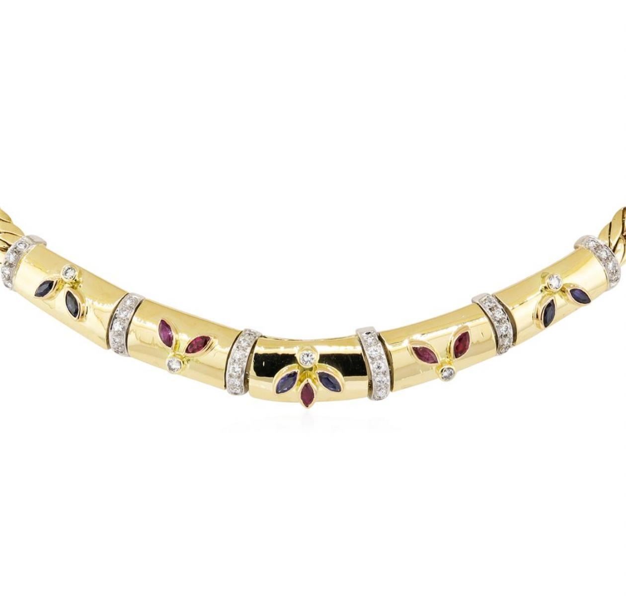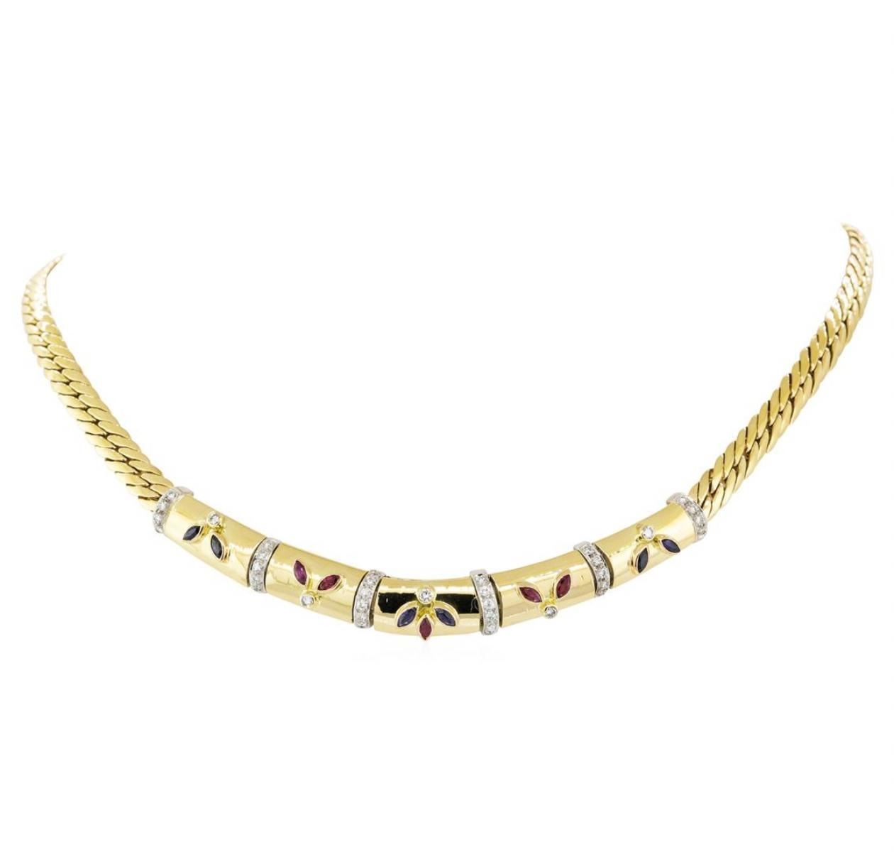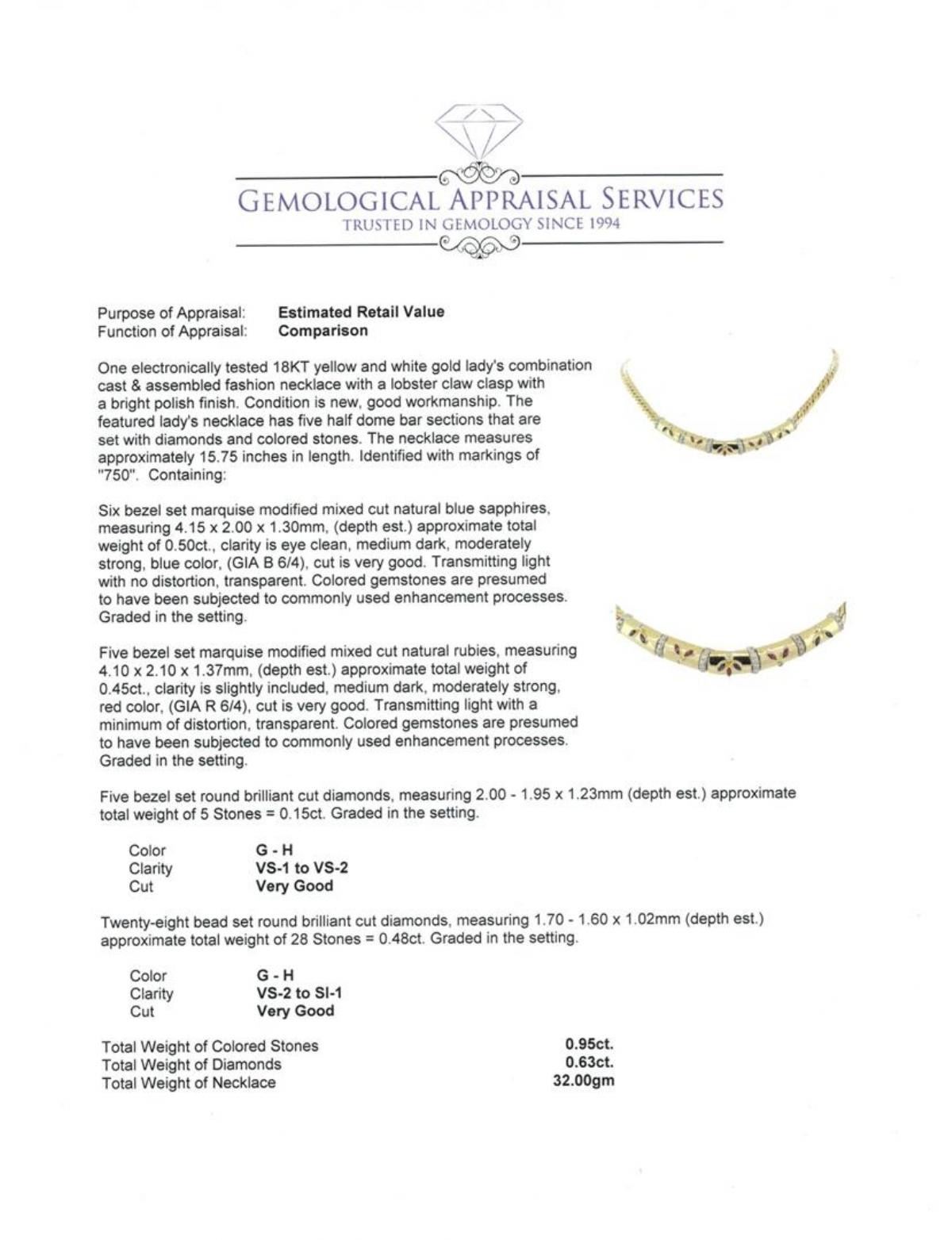 One electronically tested 18KT yellow and white gold lady's combination cast & assembled fashion necklace with a lobster claw clasp with a bright polish finish. The featured lady's necklace has five half dome bar sections that are set with diamonds and colored stones. The necklace measures approximately 15.75 inches in length. Identified with markings of '750'. Condition is new, good workmanship. Containing: Six bezel set marquise modified mixed cut natural blue sapphires, measuring 4.15 x 2.00 x 1.30mm, (depth est.) approximate total weight of 0.50ct., clarity is eye clean, medium dark, moderately strong, blue color, (GIA B 6/4), cut is very good. Transmitting light with no distortion, transparent. Colored gemstones are presumed to have been subjected to commonly used enhancement processes. Graded in the setting. Five bezel set marquise modified mixed cut natural rubies, measuring 4.10 x 2.10 x 1.37mm, (depth est.) approximate total weight of 0.45ct., clarity is slightly included, medium dark, moderately strong, red color, (GIA R 6/4), cut is very good. Transmitting light with a minimum of distortion, transparent. Colored gemstones are presumed to have been subjected to commonly used enhancement processes. Graded in the setting. Five bezel set round brilliant cut diamonds, measuring 2.00 - 1.95 x 1.23mm (depth est.) approximate total weight of 5 Stones = 0.15ct. Graded in the setting. Color G - H Clarity VS-1 to VS-2 Cut Very Good Twenty-Eight bead set round brilliant cut diamonds, measuring 1.70 - 1.60 x 1.02mm (depth est.) approximate total weight of 28 Stones = 0.48ct. Graded in the setting. Color G - H Clarity VS-2 to SI-1 Cut Very Good. Total Weight of Colored Stones 0.95ct.. Total Weight of Diamonds 0.63ct.. Total Weight of Necklace 32.00gm GAS Appraised at $9085.00. GAS Appraised at $9,085.00.