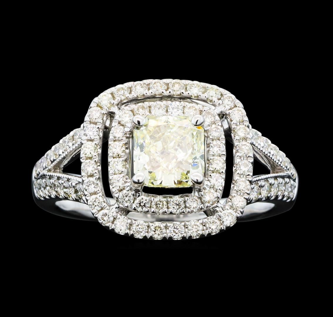 One electronically tested 14KT white gold lady's cast wedding ring with a split shank double halo with a bright polish with milgrain detailing finish. The featured lady's ring has a shank measuring 1.82 millimeters wide. Identified with markings of '14K'. Condition is new, good workmanship. Containing: One prong set cushion cut diamond, measuring 5.47 x 5.38 x 3.75mm (depth est.) , 10.00.%. GTCF approximate weight of 1.03ct. Graded in the setting. Clarity SI-3. Color: L - M Cut Very Good Seventy-Two prong set round brilliant cut diamonds, measuring 1.30 - 1.25 x 0.79mm (depth est.) approximate total weight of 72 Stones = 0.56ct. Graded in the setting. Clarity SI-1 to SI-2. Color: H - I Cut Very Good. Total Weight of Diamonds 1.59ct.. Total Weight of Ring 3.80gm. GAS Appraised.