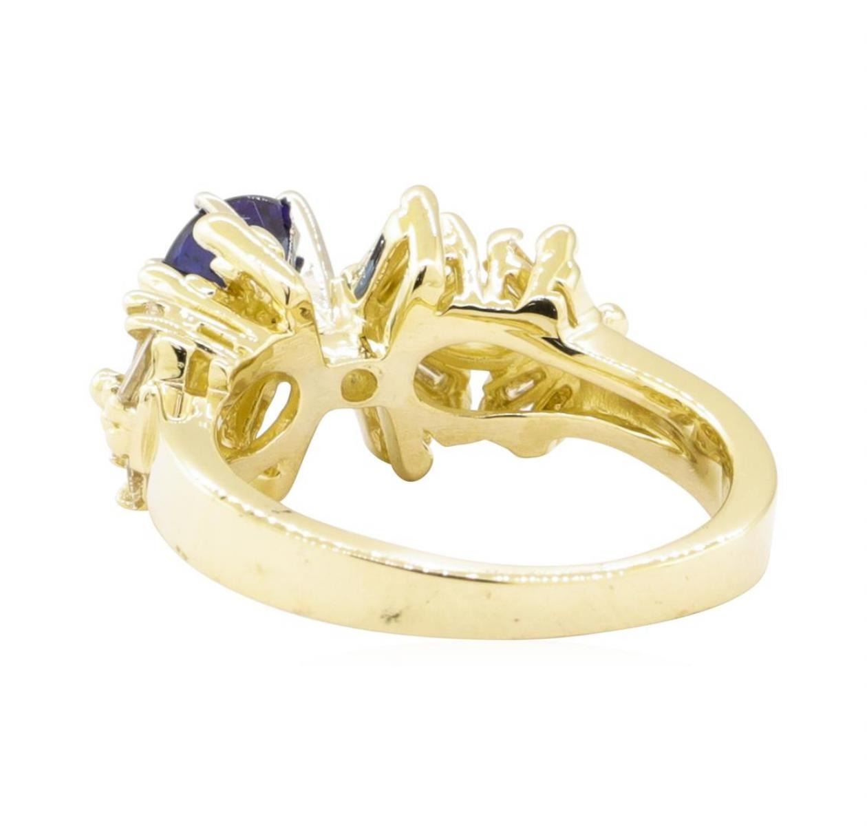 One electronically tested 14KT yellow gold lady's combination cast & assembled fashion ring with a starburst motif with a bright polish finish. The featured lady's ring has a shank measuring 2.20 millimeters wide. Identified with markings of '14K'. Condition is new, good workmanship. Containing: One prong set round modified mixed cut natural blue sapphire, measuring 5.58 - 5.52 x 3.80 mm, (depth est.) approximate weight of 0.97ct., clarity is slightly included, medium, moderately strong, violetish blue color, (GIA vB 5/4), cut is good. Transmitting light with a minimum of distortion, transparent. Colored gemstones are presumed to have been subjected to commonly used enhancement processes. Graded in the setting. Sixteen prong set baguette cut diamonds, measuring from 2.50 x 1.00 x 0.85mm (depth est.) to 3.00 x 1.20 x 1.02mm (depth est.) approximate total weight of 16 Stones = 0.48ct. Graded in the setting. Color I - K Clarity VS-1 to VS-2 Cut Very Good Two prong set marquise shaped cut diamonds, measuring 3.90 x 2.20 x 1.39mm (depth est.) approximate total weight of 2 Stones = 0.15ct. Graded in the setting. Color I - J Clarity SI-1 to SI-2 Cut Good. Total Weight of Colored Stones 0.97ct.. Total Weight of Diamonds 0.63ct.. Total Weight of Ring 5.30gm GAS Appraised at $3110.00. GAS Appraised.