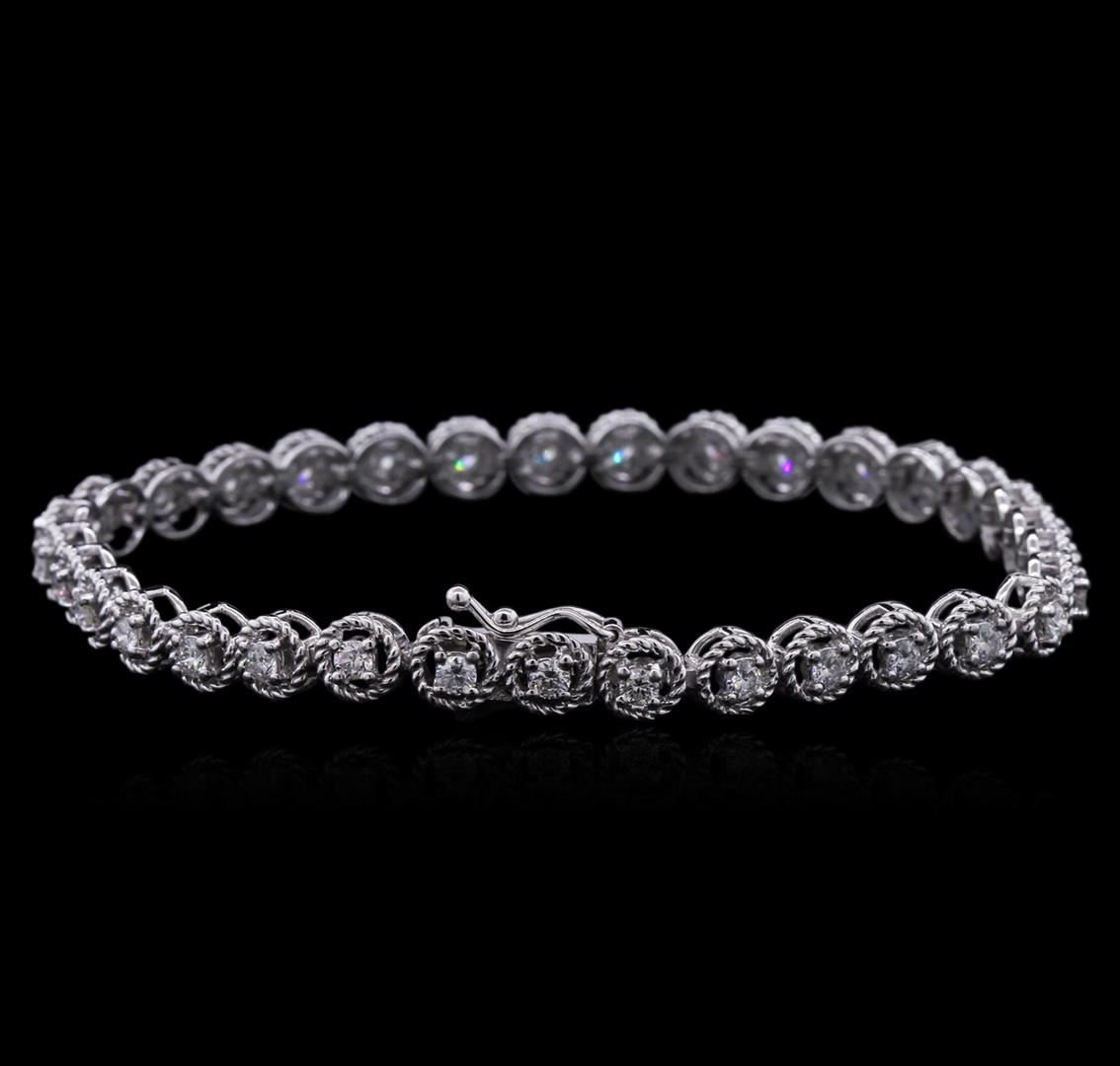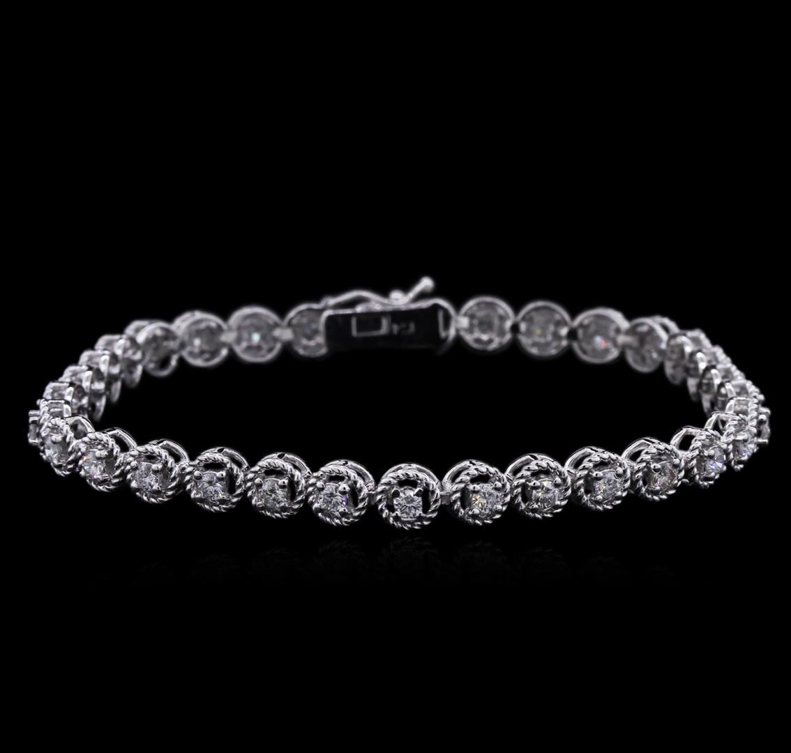 One electronically tested 14KT white gold lady's combination cast & assembled straight line bracelet with a tongue clasp with foldover safety with a bright polish finish. The featured lady's bracelet measures 7 inches in length. Identified with markings of "K14". Condition is new, good workmanship. Containing: Thirty-Three prong set round brilliant cut diamonds, measuring 2.40 - 2.30 x 1.43mm (depth est.) approximate total weight of 33 Stones = 1.60ct. Graded in the setting. Clarity: SI-1 to SI-2 . Color: H - I. Cut Very Good. Total Weight of Diamonds 1.60ct.. Total Weight of Bracelet 12.10gm at $ 5960.00 GAS Appraised.