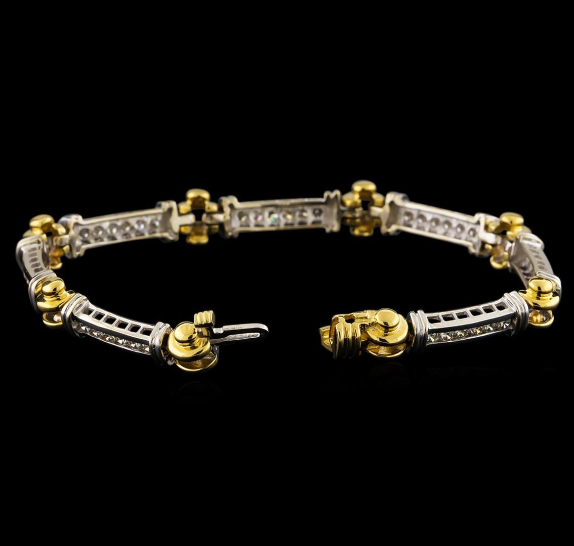 One electronically tested 14KT white and yellow gold lady's combination cast & assembled fashion bar bracelet with a tongue clasp with foldover safety with a bright polish finish. The featured lady's bracelet measures 7 inches in length. Condition is new, good workmanship. Containing: Forty-Two channel set round brilliant cut diamonds, measuring 2.20 - 2.10 x 1.33mm (depth est.) approximate total weight of 42 Stones = 1.60ct. Graded in the setting. Clarity: VS-1 to VS-2. Color: H - I. Cut Good. Total Weight of Diamonds 1.60ct. Total Weight of Bar Bracelet 23.00gm. GAS Appraised.