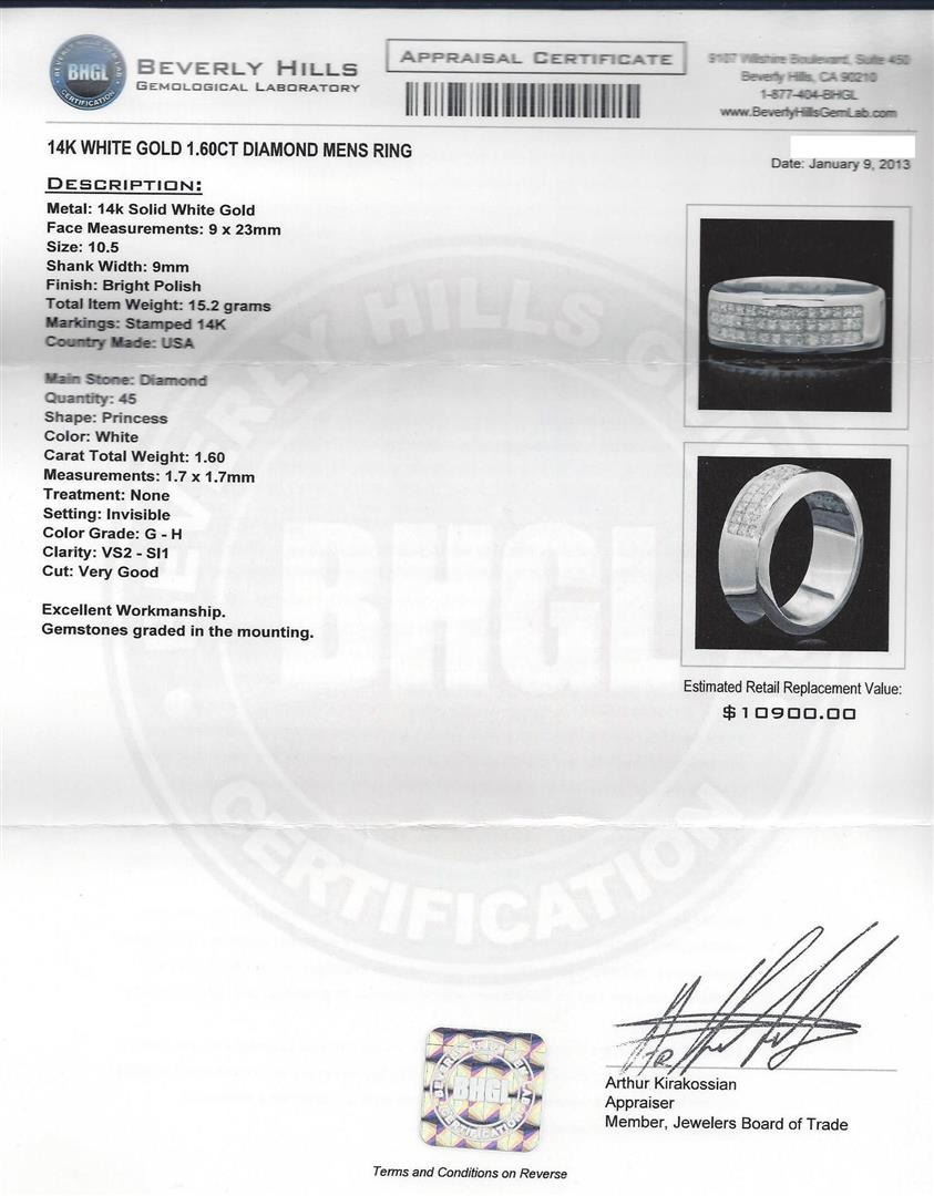 14K White Gold 1.60 ct Diamond Mens Ring. Description: Metal: 14k solid white gold. Face Measurements: 9 x 23mm. Size: 10.5. Shank Width: 9mm. Finish: bright polish. Total Item Weight: 15.2 grams. Markings: stamped 14K. Country Made: USA. Main Stone: diamond. Quantity: 45. Shape: princess Color: white. Carat Total Weight: 1.60. Measurements: 1.7 x 1.7mm. Treatment: none. Setting: invisible. Color Grade: G-H. Clarity: VS2-SI1. Cut: very good. Excellent Workmanship. Gemstones graded in the mounting. BHGL Appraised.