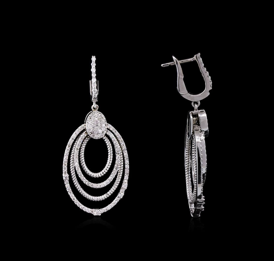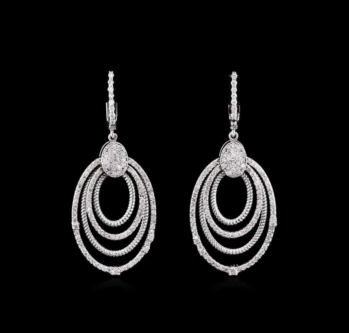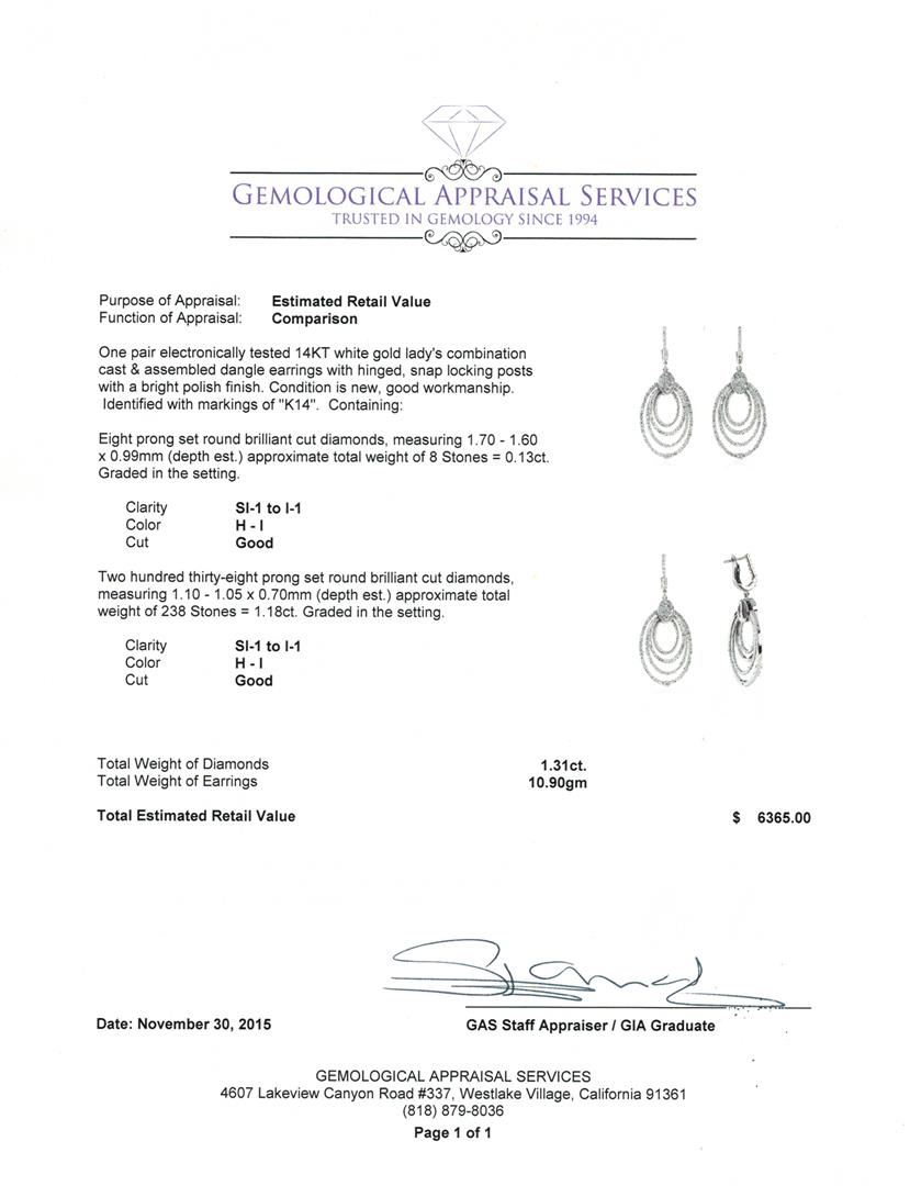 One pair electronically tested 14KT white gold lady's combination cast & assembled dangle earrings with hinged, snap locking posts with a bright polish finish. Identified with markings of "K14". Condition is new, good workmanship. Containing: Eight prong set round brilliant cut diamonds, measuring 1.70 - 1.60 x 0.99mm (depth est.) approximate total weight of 8 Stones = 0.13ct. Graded in the setting. Clarity: SI-1 to I-1 . Color: H - I. Cut Good Two Hundred Thirty-Eight prong set round brilliant cut diamonds, measuring 1.10 - 1.05 x 0.70mm (depth est.) approximate total weight of 238 Stones = 1.18ct. Graded in the setting. Clarity: SI-1 to I-1 . Color: H - I. Cut Good. Total Weight of Diamonds 1.31ct.. Total Weight of Earrings 10.90gm at $ 6365.00 GAS Appraised.