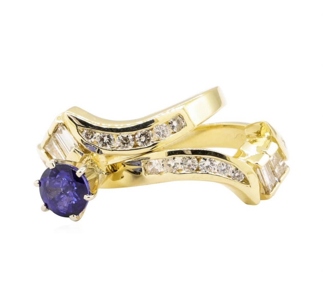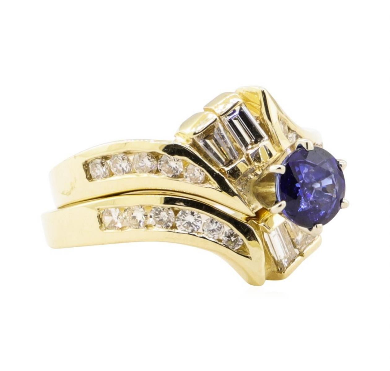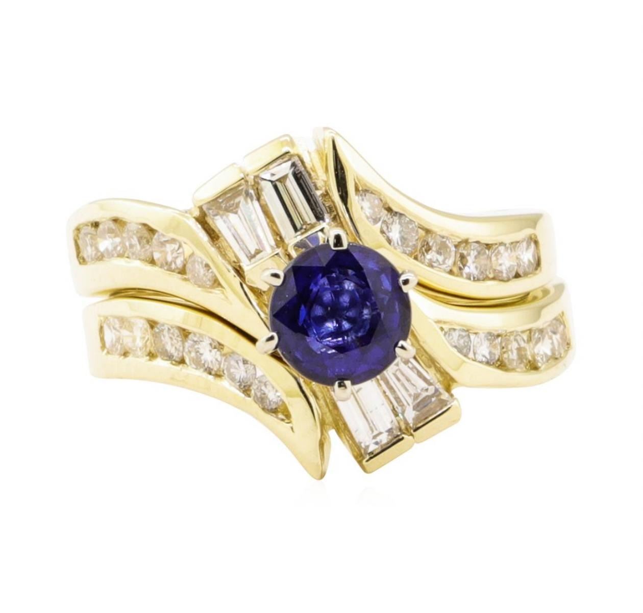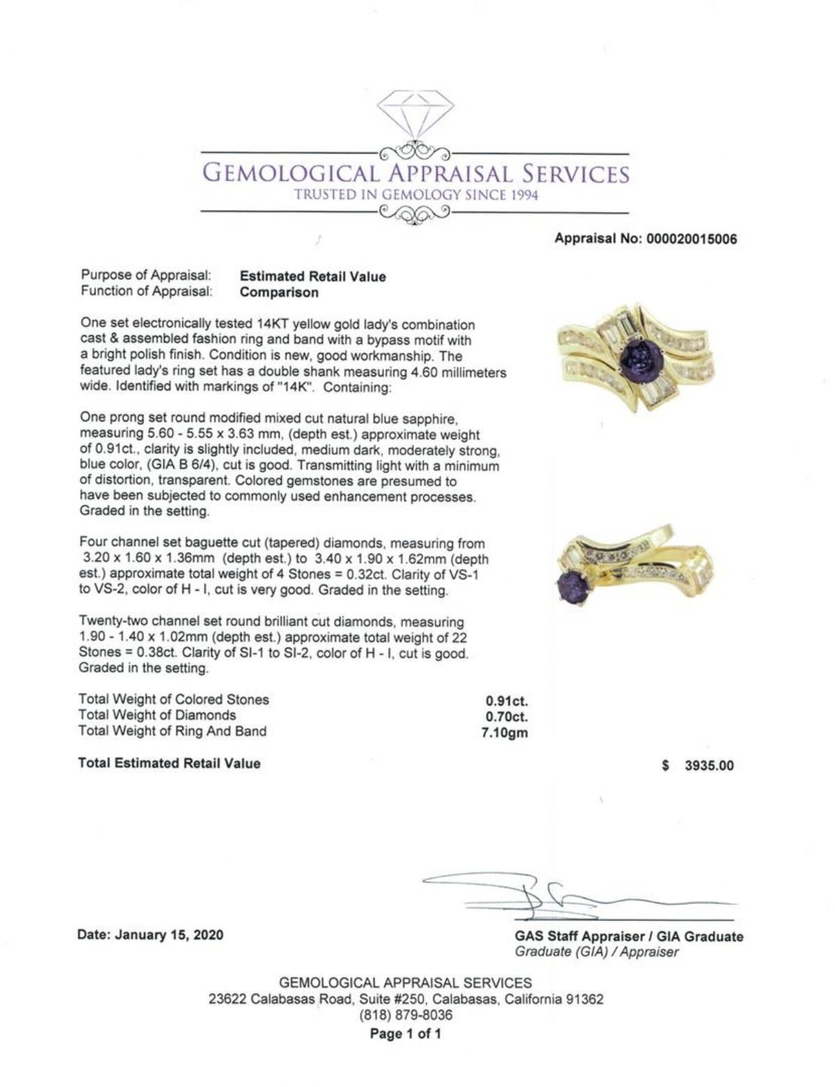 One set electronically tested 14KT yellow gold lady's combination cast & assembled fashion ring and band with a bypass motif with a bright polish finish. The featured lady's ring set has a double shank measuring 4.60 millimeters wide. Identified with markings of '14K'. Condition is new, good workmanship. Containing: One prong set round modified mixed cut natural blue sapphire, measuring 5.60 - 5.55 x 3.63 mm, (depth est.) approximate weight of 0.91ct., clarity is slightly included, medium dark, moderately strong, blue color, (GIA B 6/4), cut is good. Transmitting light with a minimum of distortion, transparent. Colored gemstones are presumed to have been subjected to commonly used enhancement processes. Graded in the setting. Four channel set baguette cut (tapered) diamonds, measuring from 3.20 x 1.60 x 1.36mm (depth est.) to 3.40 x 1.90 x 1.62mm (depth est.) approximate total weight of 4 Stones = 0.32ct. Graded in the setting. Color H - I Clarity VS-1 to VS-2 Cut Very Good Twenty-Two channel set round brilliant cut diamonds, measuring 1.90 - 1.40 x 1.02mm (depth est.) approximate total weight of 22 Stones = 0.38ct. Graded in the setting. Color H - I Clarity SI-1 to SI-2 Cut Good. Total Weight of Colored Stones 0.91ct.. Total Weight of Diamonds 0.70ct.. Total Weight of Ring And Band 7.10gm GAS Appraised at $3935.00. GAS Appraised.