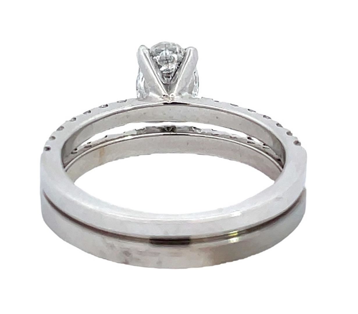 One electronically tested 14KT white gold lady's combination cast & assembled wedding set with a double straight line motif with a bright polish finish. The featured lady's wedding set has a double shank measuring 3.80 millimeters wide. Identified with markings of "14K". Condition is new, good workmanship. Containing: One prong set oval shaped cut diamond, measuring 7.85 x 5.40 x 3.70mm (depth est.) approximate weight of 1.00ct. Graded in the setting. Color G Clarity I-1 Cut Very Good Thirty-Four prong set round brilliant cut diamonds, measuring 1.70 - 1.65 x 1.01mm (depth est.) approximate total weight of 34 Stones = 0.61ct. Graded in the setting. Color G - H Clarity VS-2 to SI-1 Cut Very Good Total Weight of Diamonds 1.61ct. Total Weight of Wedding Set 4.30gm