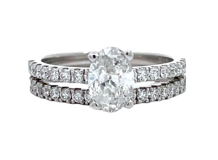 One electronically tested 14KT white gold lady's combination cast & assembled wedding set with a double straight line motif with a bright polish finish. The featured lady's wedding set has a double shank measuring 3.80 millimeters wide. Identified with markings of "14K". Condition is new, good workmanship. Containing: One prong set oval shaped cut diamond, measuring 7.85 x 5.40 x 3.70mm (depth est.) approximate weight of 1.00ct. Graded in the setting. Color G Clarity I-1 Cut Very Good Thirty-Four prong set round brilliant cut diamonds, measuring 1.70 - 1.65 x 1.01mm (depth est.) approximate total weight of 34 Stones = 0.61ct. Graded in the setting. Color G - H Clarity VS-2 to SI-1 Cut Very Good Total Weight of Diamonds 1.61ct. Total Weight of Wedding Set 4.30gm