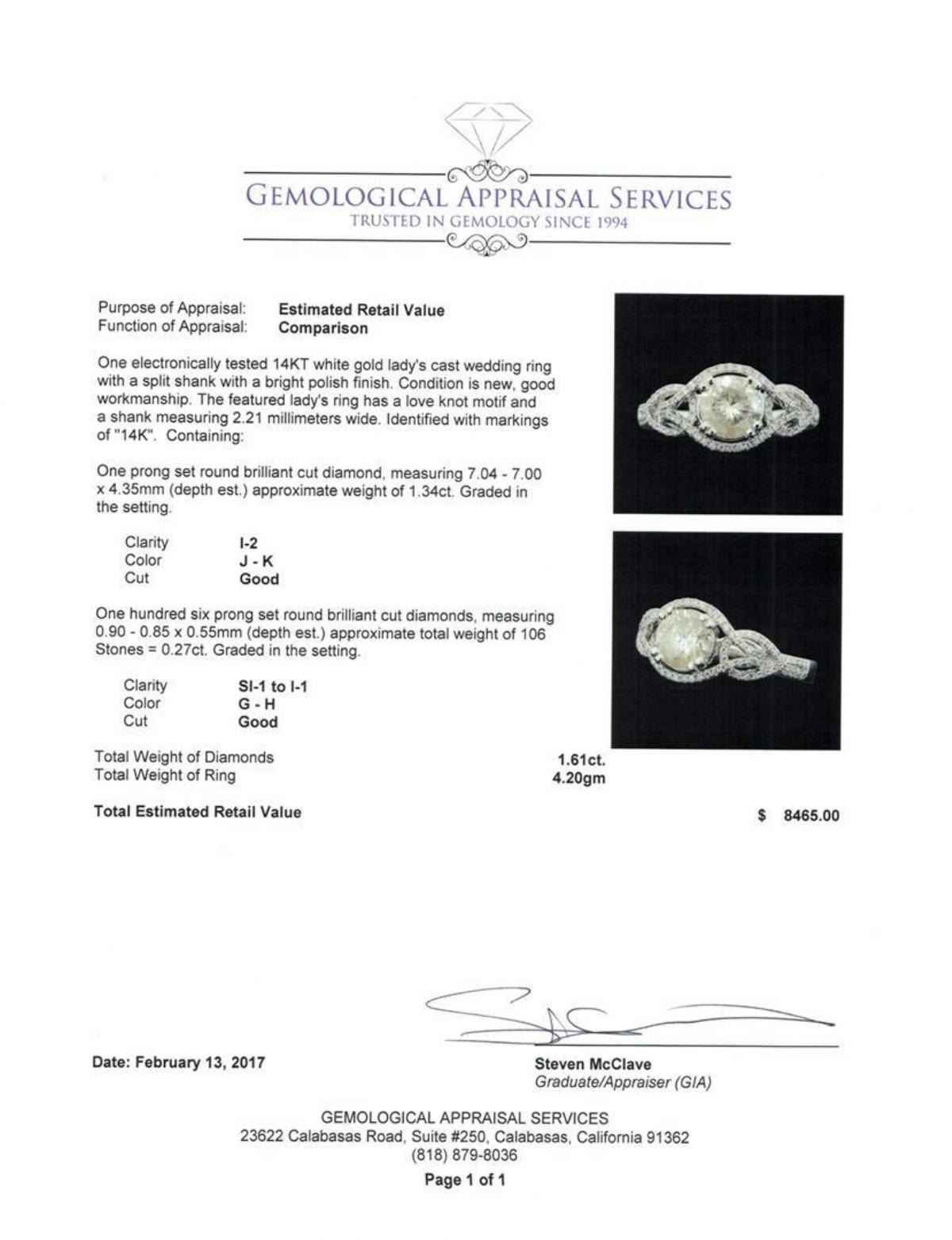 One electronically tested 14KT white gold lady's cast wedding ring with a split shank with a bright polish finish. The featured lady's ring has a love knot motif and a shank measuring 2.21 millimeters wide. Identified with markings of '14K'. Condition is new, good workmanship. Containing: One prong set round brilliant cut diamond, measuring 7.04 - 7.00 x 4.35mm (depth est.) approximate weight of 1.34ct. Graded in the setting. Clarity I-2. Color: J - K Cut Good One Hundred Six prong set round brilliant cut diamonds, measuring 0.90 - 0.85 x 0.55mm (depth est.) approximate total weight of 106 Stones = 0.27ct. Graded in the setting. Clarity SI-1 to I-1. Color: G - H Cut Good. Total Weight of Diamonds 1.61ct.. Total Weight of Ring 4.20gm. GAS Appraised.