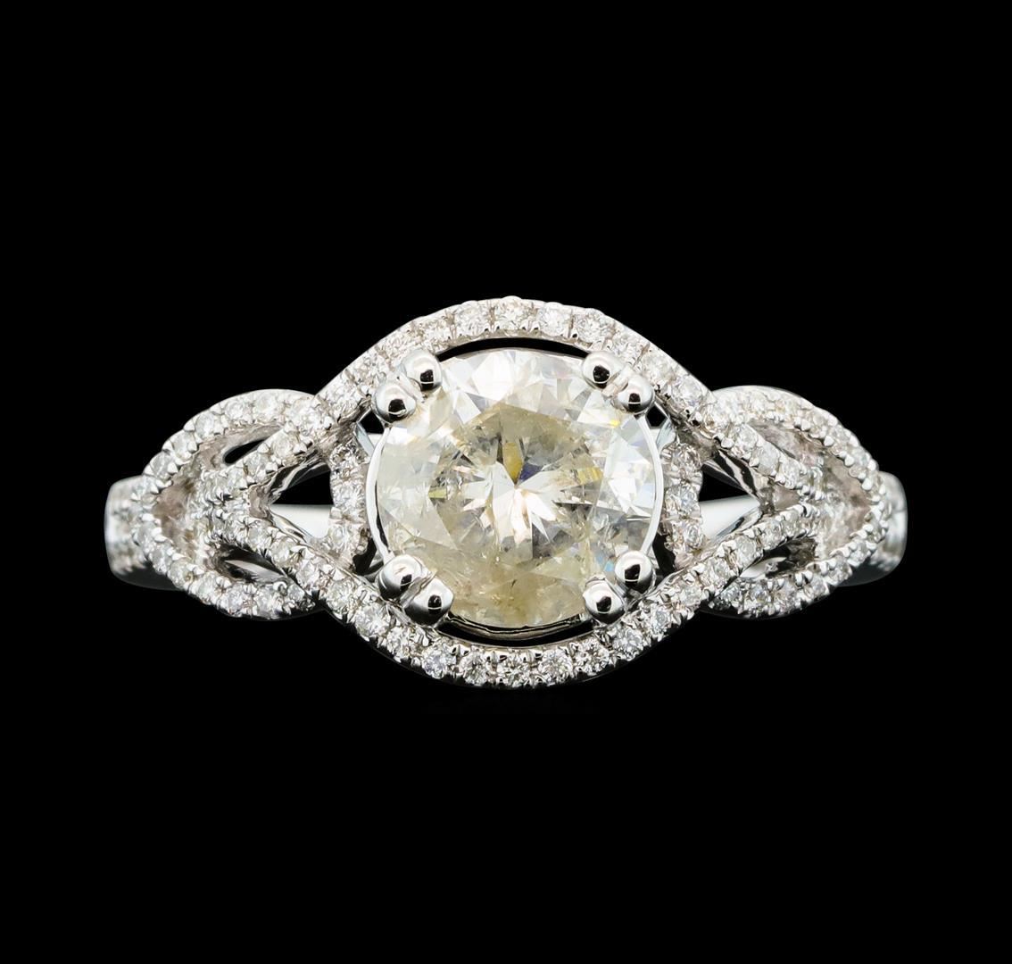 One electronically tested 14KT white gold lady's cast wedding ring with a split shank with a bright polish finish. The featured lady's ring has a love knot motif and a shank measuring 2.21 millimeters wide. Identified with markings of '14K'. Condition is new, good workmanship. Containing: One prong set round brilliant cut diamond, measuring 7.04 - 7.00 x 4.35mm (depth est.) approximate weight of 1.34ct. Graded in the setting. Clarity I-2. Color: J - K Cut Good One Hundred Six prong set round brilliant cut diamonds, measuring 0.90 - 0.85 x 0.55mm (depth est.) approximate total weight of 106 Stones = 0.27ct. Graded in the setting. Clarity SI-1 to I-1. Color: G - H Cut Good. Total Weight of Diamonds 1.61ct.. Total Weight of Ring 4.20gm. GAS Appraised.