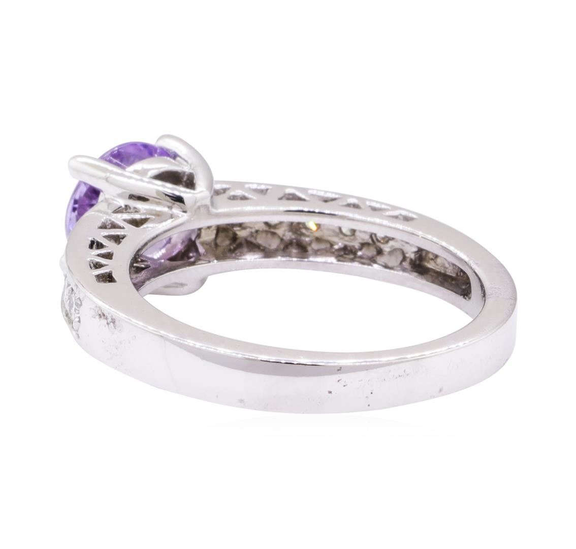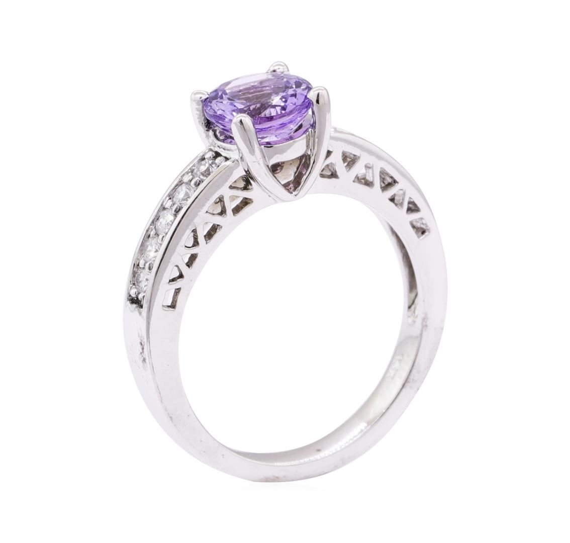 One electronically tested 14KT white gold lady's cast fashion ring with a straight line cathedral shank with a bright polish finish. The featured lady's ring has a lattice cathedral motif and a shank measuring 2.80 millimeters wide. Identified with markings of '14K'. Condition is new, good workmanship. Containing: One prong set round modified mixed cut natural tanzanite, measuring 7.00 - 6.95 x 4.31 mm, (depth est.) approximate weight of 1.39ct., clarity is eye clean, medium light, moderately strong, violet color, (GIA V 4/4), cut is very good. Transmitting light with no distortion, transparent. Colored gemstones are presumed to have been subjected to commonly used enhancement processes. Graded in the setting. Ten prong set round brilliant cut diamonds, measuring 1.80 - 1.75 x 1.10mm (depth est.) approximate total weight of 10 Stones = 0.22ct. Graded in the setting. Color G - H Clarity SI-1 to SI-2 Cut Good. Total Weight of Colored Stones 1.39ct.. Total Weight of Diamonds 0.22ct.. Total Weight of Ring 4.90gm GAS Appraised at $2470.00. GAS Appraised.