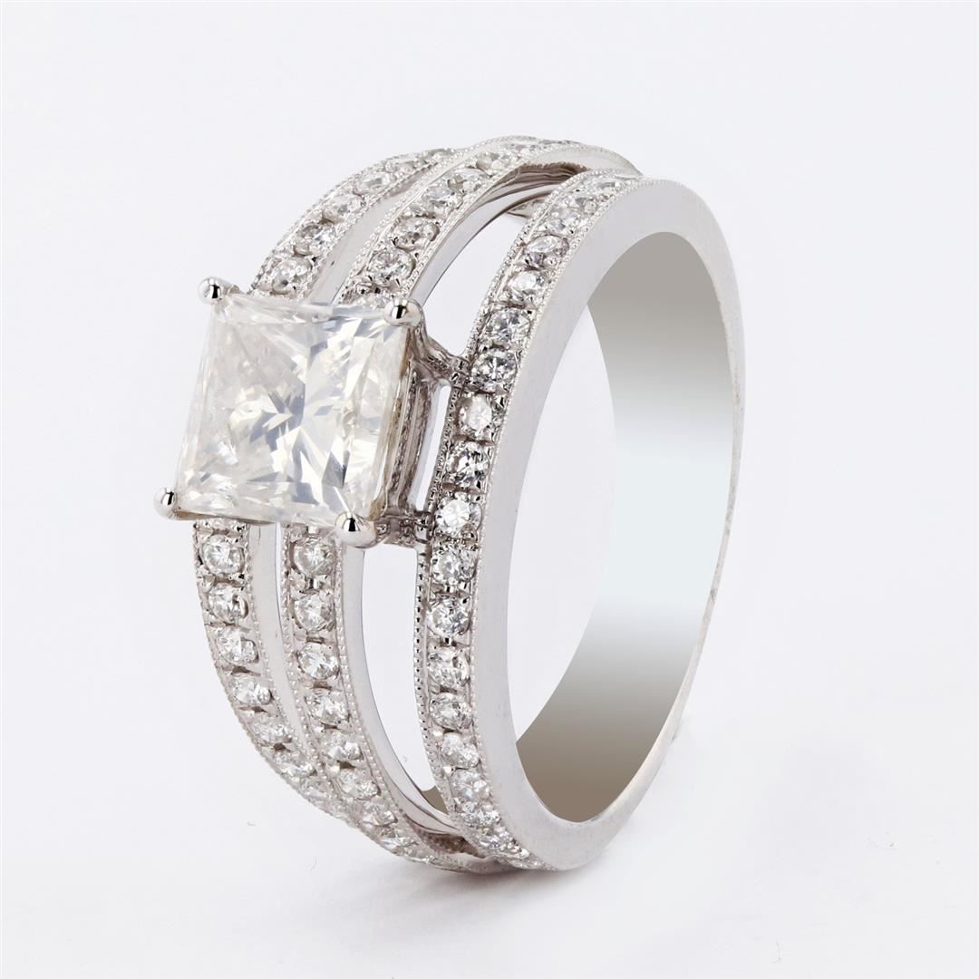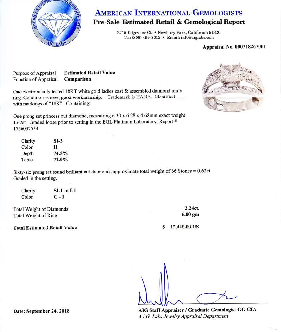 One electronically tested 18KT white gold ladies cast & assembled diamond unity ring. Condition is new, good workmanship. Trademark is HANA. Identified with markings of "18K". Containing: One prong set princess cut diamond, measuring 6.30 x 6.28 x 4.68mm exact weight 1.62ct. Graded loose prior to setting in the EGL Platinum Laboratory, Report # 1756037534. Clarity SI3 Color H Depth 74.5% Table 72.0% Sixty-six prong set round brilliant cut diamonds approximate total weight of 66 Stones = 0.62ctw. Graded in the setting. Clarity SI1 to I1 Color G - I Total Weight of Diamonds 2.24ctw. Total Weight of Ring 6.00 gm