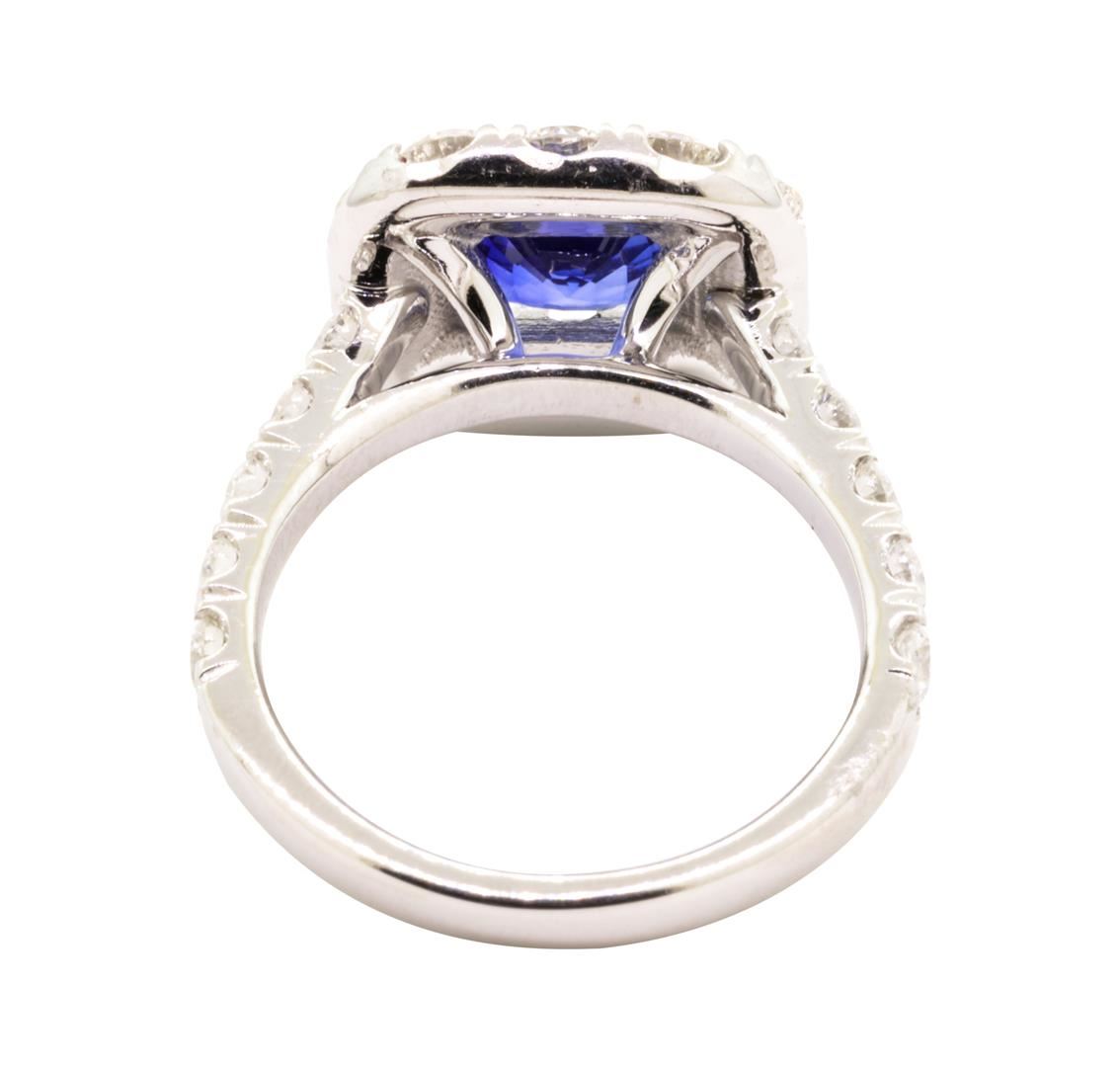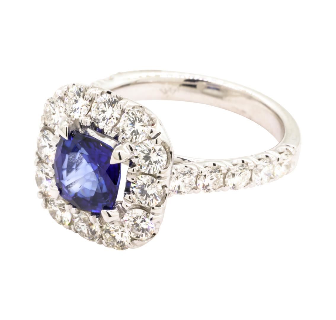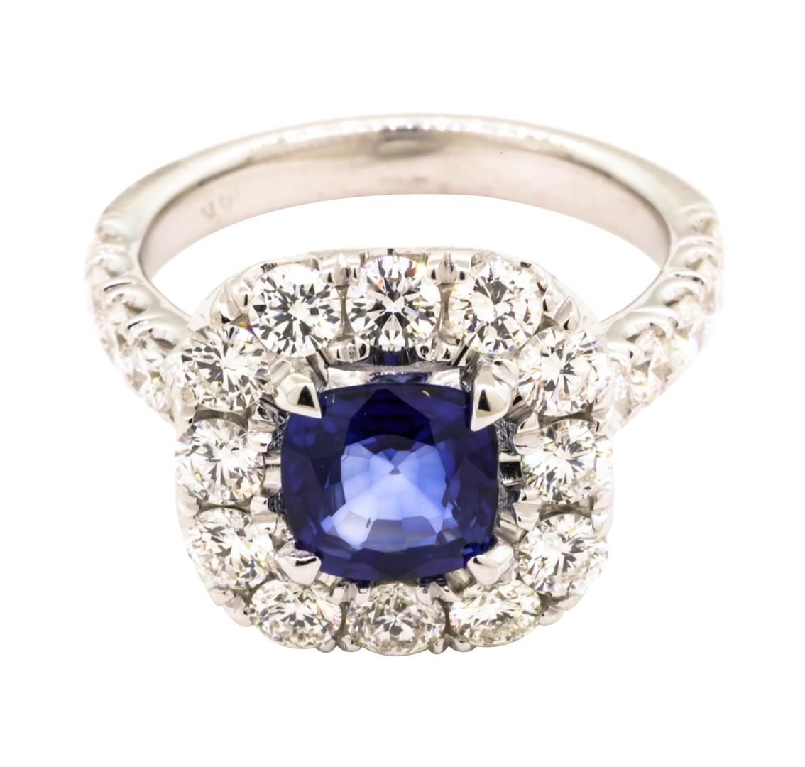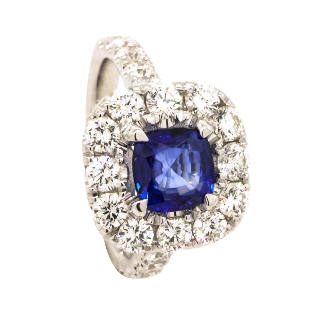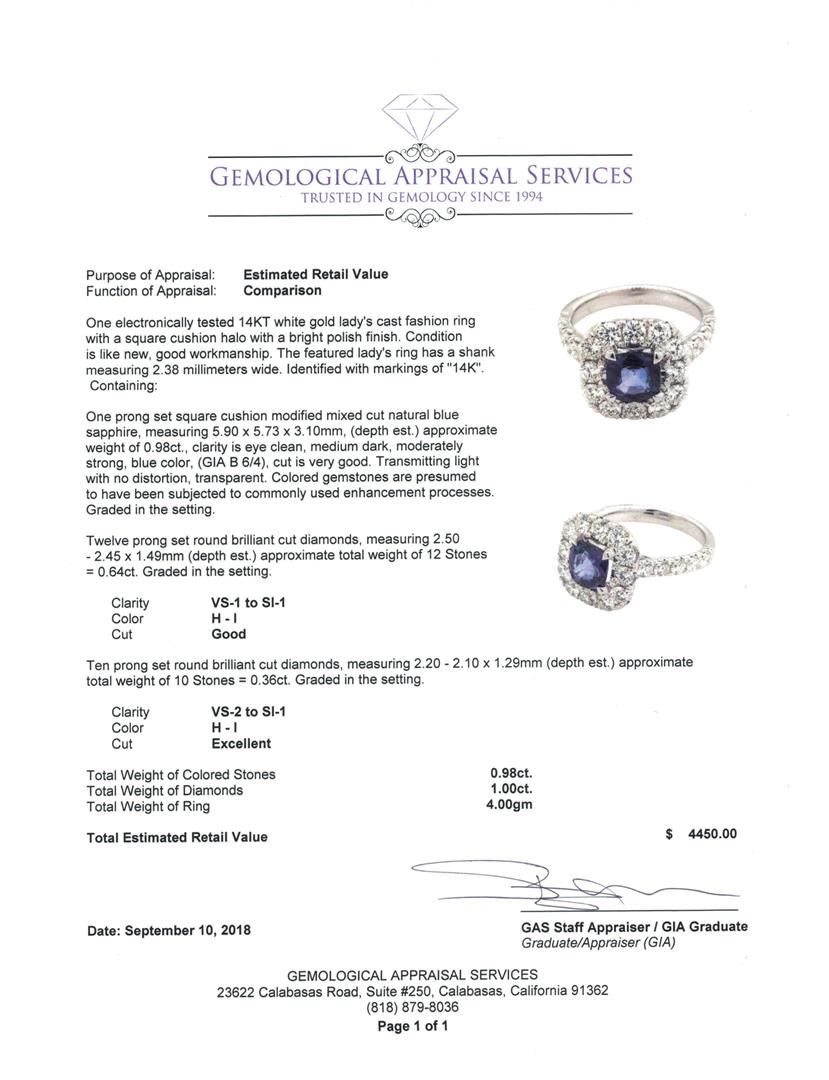 One electronically tested 14KT white gold lady's cast fashion ring with a square cushion halo with a bright polish finish. The featured lady's ring has a shank measuring 2.38 millimeters wide. Identified with markings of '14K'. Condition is like new, good workmanship. Containing: One prong set square cushion modified mixed cut natural blue sapphire, measuring 5.90 x 5.73 x 3.10mm, (depth est.) approximate weight of 0.98ct., clarity is eye clean, medium dark, moderately strong, blue color, (GIA B 6/4), cut is very good. Transmitting light with no distortion, transparent. Colored gemstones are presumed to have been subjected to commonly used enhancement processes. Graded in the setting. Twelve prong set round brilliant cut diamonds, measuring 2.50 - 2.45 x 1.49mm (depth est.) approximate total weight of 12 Stones = 0.64ct. Graded in the setting. Color H - I Clarity VS-1 to SI-1 Cut Good Ten prong set round brilliant cut diamonds, measuring 2.20 - 2.10 x 1.29mm (depth est.) approximate total weight of 10 Stones = 0.36ct. Graded in the setting. Color H - I Clarity VS-2 to SI-1 Cut Excellent. Total Weight of Colored Stones 0.98ct.. Total Weight of Diamonds 1.00ct.. Total Weight of Ring 4.00gm GAS Appraised at $4450.00. GAS Appraised.