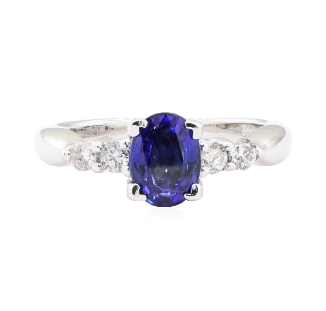 One electronically tested 14KT white gold lady's cast fashion ring with a five stone motif with a bright polish finish. The featured lady's ring has a shank measuring 1.70 millimeters wide. Identified with markings of '14K'. Condition is new, good workmanship. Containing: One prong set oval modified mixed cut natural blue sapphire, measuring 7.74 x 5.85 x 3.60mm, (depth est.) approximate weight of 1.38ct., clarity is eye clean, medium dark, very slightly grayish, blue color, (GIA B 6/3), cut is very good. Transmitting light with no distortion, transparent. Colored gemstones are presumed to have been subjected to commonly used enhancement processes. Graded in the setting. Four prong set round brilliant cut diamonds, measuring 2.60 - 2.50 x 1.58mm (depth est.) approximate total weight of 4 Stones = 0.25ct. Graded in the setting. Color G - H Clarity SI-1 to SI-2 Cut Good. Total Weight of Colored Stones 1.38ct.. Total Weight of Diamonds 0.25ct.. Total Weight of Ring 4.30gm GAS Appraised at $2630.00. GAS Appraised.