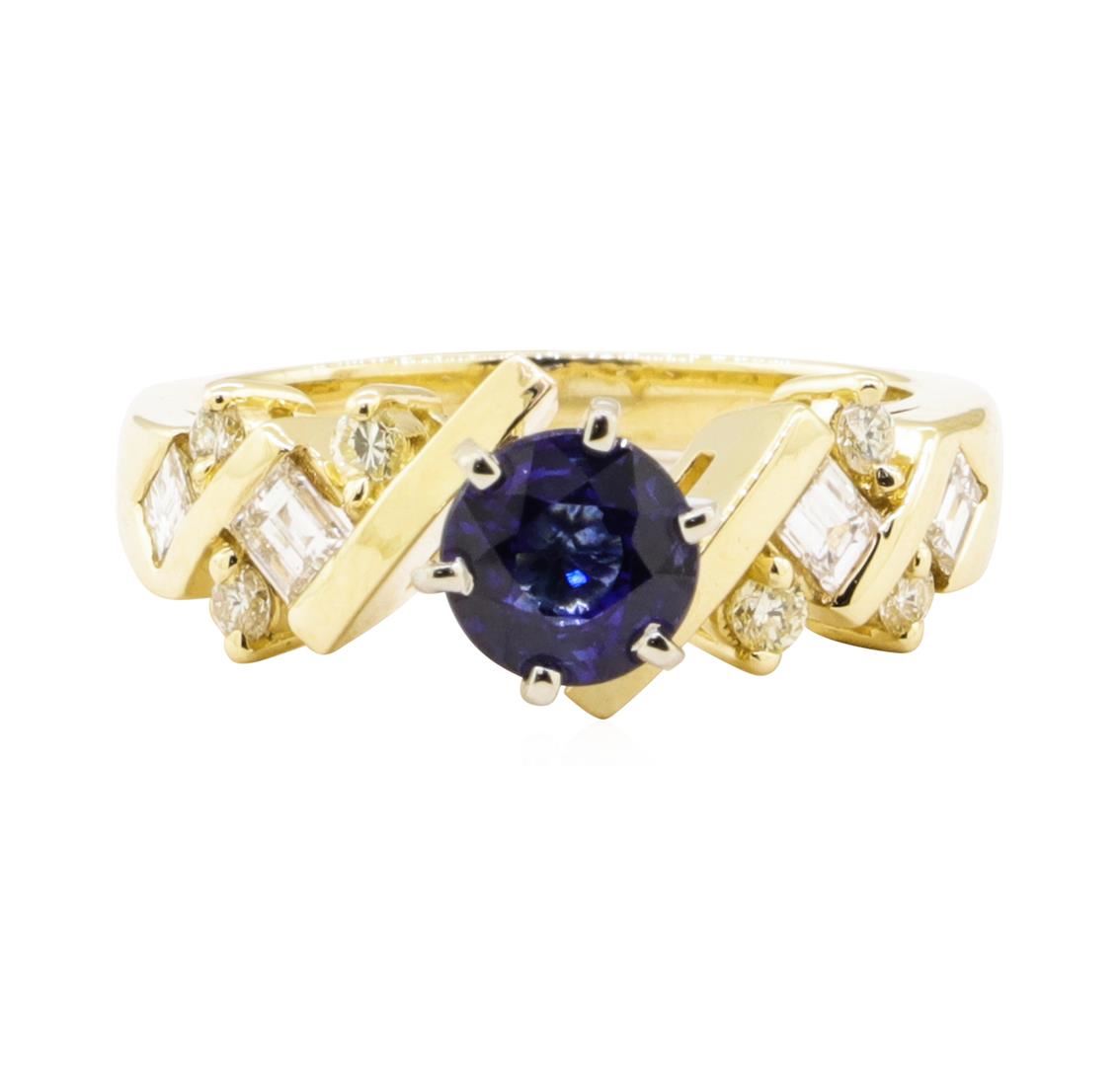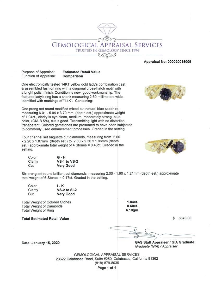 One electronically tested 14KT yellow gold lady's combination cast & assembled fashion ring with a diagonal cross-hatch motif with a bright polish finish. The featured lady's ring has a shank measuring 2.60 millimeters wide. Identified with markings of '14K'. Condition is new, good workmanship. Containing: One prong set round modified mixed cut natural blue sapphire, measuring 6.01 - 5.94 x 3.70 mm, (depth est.) approximate weight of 1.04ct., clarity is eye clean, medium, moderately strong, blue color, (GIA B 5/4), cut is good. Transmitting light with no distortion, transparent. Colored gemstones are presumed to have been subjected to commonly used enhancement processes. Graded in the setting. Four channel set baguette cut diamonds, measuring from 2.60 x 2.20 x 1.87mm (depth est.) to 2.80 x 2.30 x 1.96mm (depth est.) approximate total weight of 4 Stones = 0.43ct. Graded in the setting. Color G - H Clarity VS-1 to VS-2 Cut Very Good Six prong set round brilliant cut diamonds, measuring 2.00 - 1.90 x 1.21mm (depth est.) approximate total weight of 6 Stones = 0.17ct. Graded in the setting. Color I - K Clarity VS-2 to SI-2 Cut Very Good. Total Weight of Colored Stones 1.04ct.. Total Weight of Diamonds 0.60ct.. Total Weight of Ring 6.10gm GAS Appraised at $3370.00. GAS Appraised.