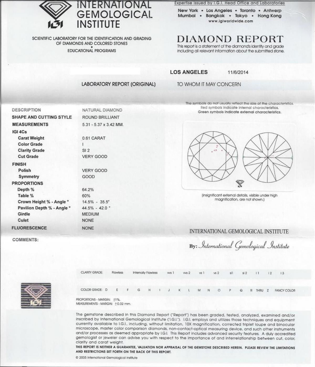 One ring featuring: 14KT white gold weighing 5.17 grams containing one center diamond with a total weight of 0.61c and side diamonds with a total weight of 1.03ct. The appraisal for the rings center diamond includes: Shape and Cutting Style: Natural Brilliant. Measurements: 5.31 - 5.37 x 3.42 MM. Color Grade: I. Clarity: SI 2. Cut Grade: Very Good. Polish: Very Good. Symmetry: Good. IGI Appraised.