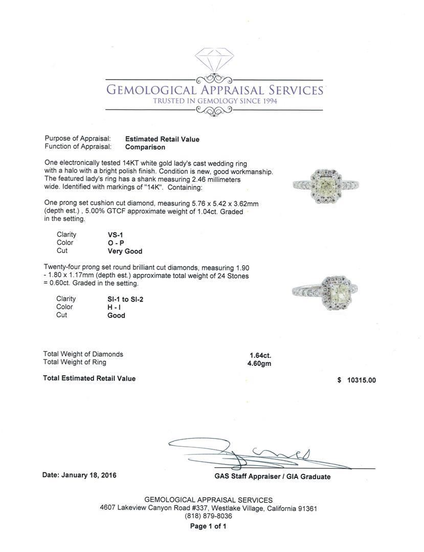 One electronically tested 14KT white gold lady's cast wedding ring with a halo with a bright polish finish. The featured lady's ring has a shank measuring 2.46 millimeters wide. Identified with markings of "14K". Condition is new, good workmanship. Containing: One prong set cushion cut diamond, measuring 5.76 x 5.42 x 3.62mm (depth est.) , 5.00.%. GTCF approximate weight of 1.04ct. Graded in the setting. Clarity: VS-1. Color: O - P. Cut Very Good Twenty-Four prong set round brilliant cut diamonds, measuring 1.90 - 1.80 x 1.17mm (depth est.) approximate total weight of 24 Stones = 0.60ct. Graded in the setting. Clarity: SI-1 to SI-2. Color: H - I. Cut Good. Total Weight of Diamonds 1.64ct. Total Weight of Ring 4.60gm. GAS Appraised.