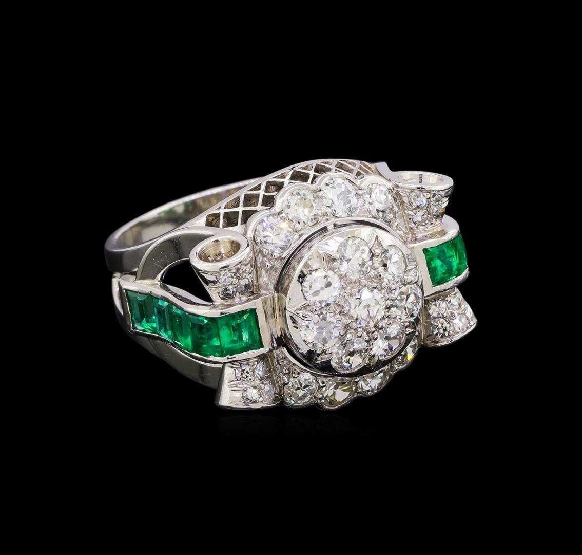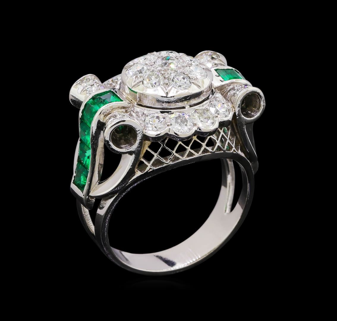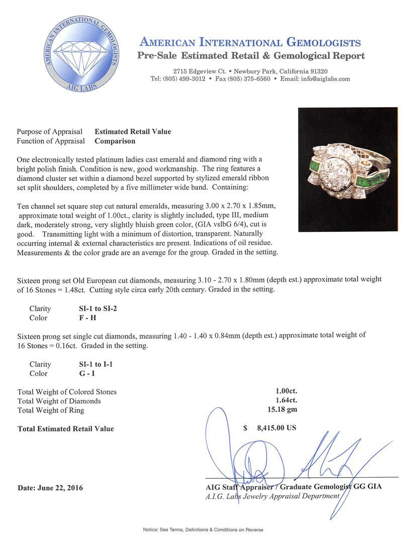 One electronically tested platinum ladies cast emerald and diamond ring with a bright polish finish. The ring features a diamond cluster set within a diamond bezel supported by stylized emerald ribbon set split shoulders, completed by a five millimeter wide band. Condition is new, good workmanship. Containing: Ten channel set square step cut natural emeralds, measuring 3.00. x 2.70 x 1.85mm, approximate total weight of 1.00ct., clarity is slightly included, type III, medium dark, moderately strong, very slightly bluish green color, (GIA vslbG 6/4), cut is good. Transmitting light with a minimum of distortion, transparent. Naturally occurring internal & external characteristics are present. Indications of oil residue. Measurements & the color grade are an average for the group. Graded in the setting. Sixteen prong set Old European cut diamonds, measuring 3.10 - 2.70 x 1.80mm (depth est.) approximate total weight of 16 Stones = 1.48ct. Cutting style circa early 20th century. Graded in the setting. Clarity: SI-1 to SI-2 . Color: F - H Sixteen prong set single cut diamonds, measuring 1.40 - 1.40 x 0.84mm (depth est.) approximate total weight of 16 Stones = 0.16ct. Graded in the setting. Clarity: SI-1 to I-1 . Color: G - I. Total Weight of Colored Stones 1.00ct.. Total Weight of Diamonds 1.64ct.. Total Weight of Ring 15.18gm. AIG Appraised.