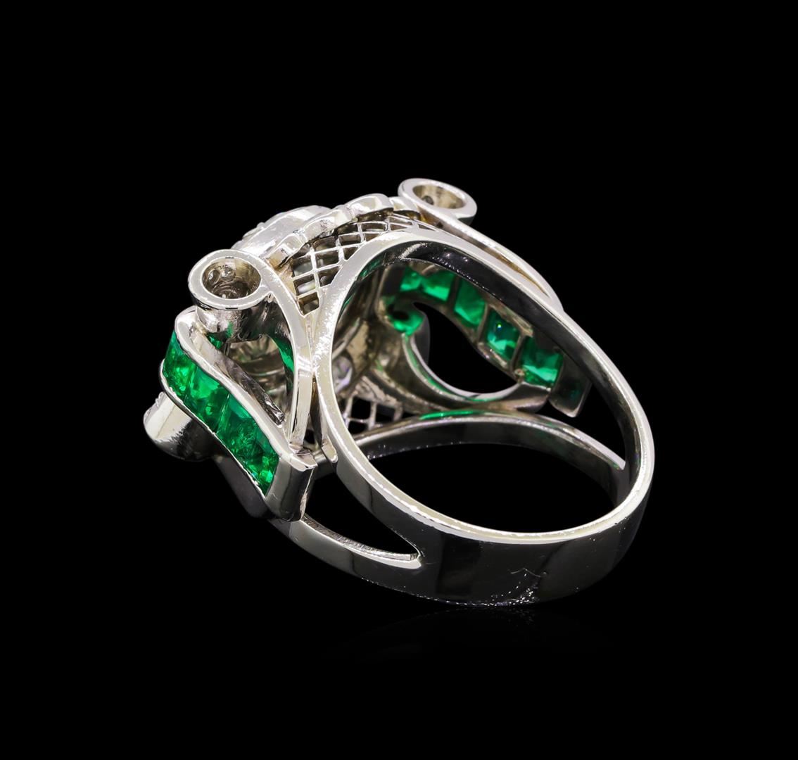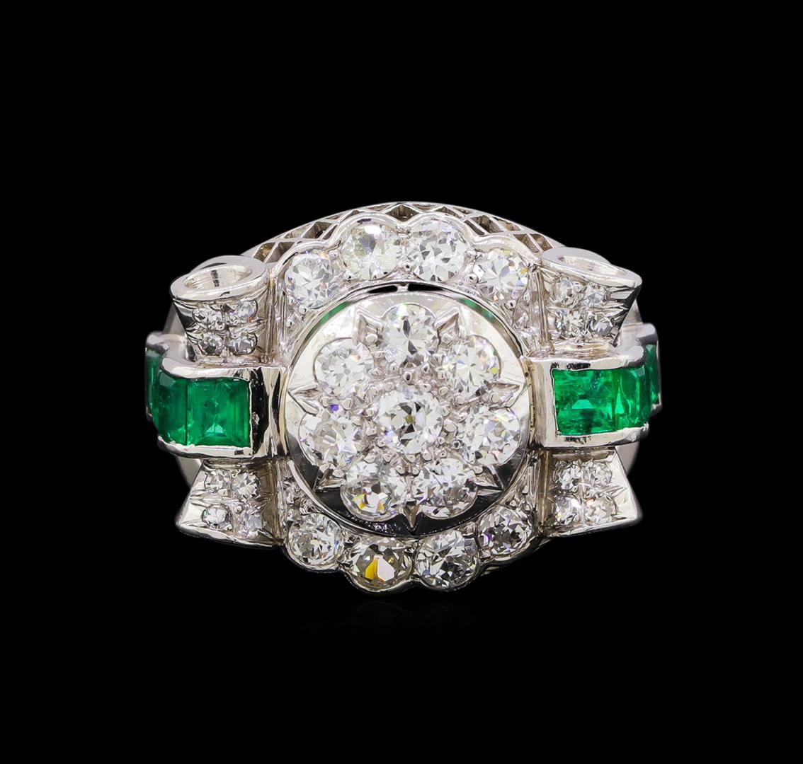 One electronically tested platinum ladies cast emerald and diamond ring with a bright polish finish. The ring features a diamond cluster set within a diamond bezel supported by stylized emerald ribbon set split shoulders, completed by a five millimeter wide band. Condition is new, good workmanship. Containing: Ten channel set square step cut natural emeralds, measuring 3.00. x 2.70 x 1.85mm, approximate total weight of 1.00ct., clarity is slightly included, type III, medium dark, moderately strong, very slightly bluish green color, (GIA vslbG 6/4), cut is good. Transmitting light with a minimum of distortion, transparent. Naturally occurring internal & external characteristics are present. Indications of oil residue. Measurements & the color grade are an average for the group. Graded in the setting. Sixteen prong set Old European cut diamonds, measuring 3.10 - 2.70 x 1.80mm (depth est.) approximate total weight of 16 Stones = 1.48ct. Cutting style circa early 20th century. Graded in the setting. Clarity: SI-1 to SI-2 . Color: F - H Sixteen prong set single cut diamonds, measuring 1.40 - 1.40 x 0.84mm (depth est.) approximate total weight of 16 Stones = 0.16ct. Graded in the setting. Clarity: SI-1 to I-1 . Color: G - I. Total Weight of Colored Stones 1.00ct.. Total Weight of Diamonds 1.64ct.. Total Weight of Ring 15.18gm. AIG Appraised.