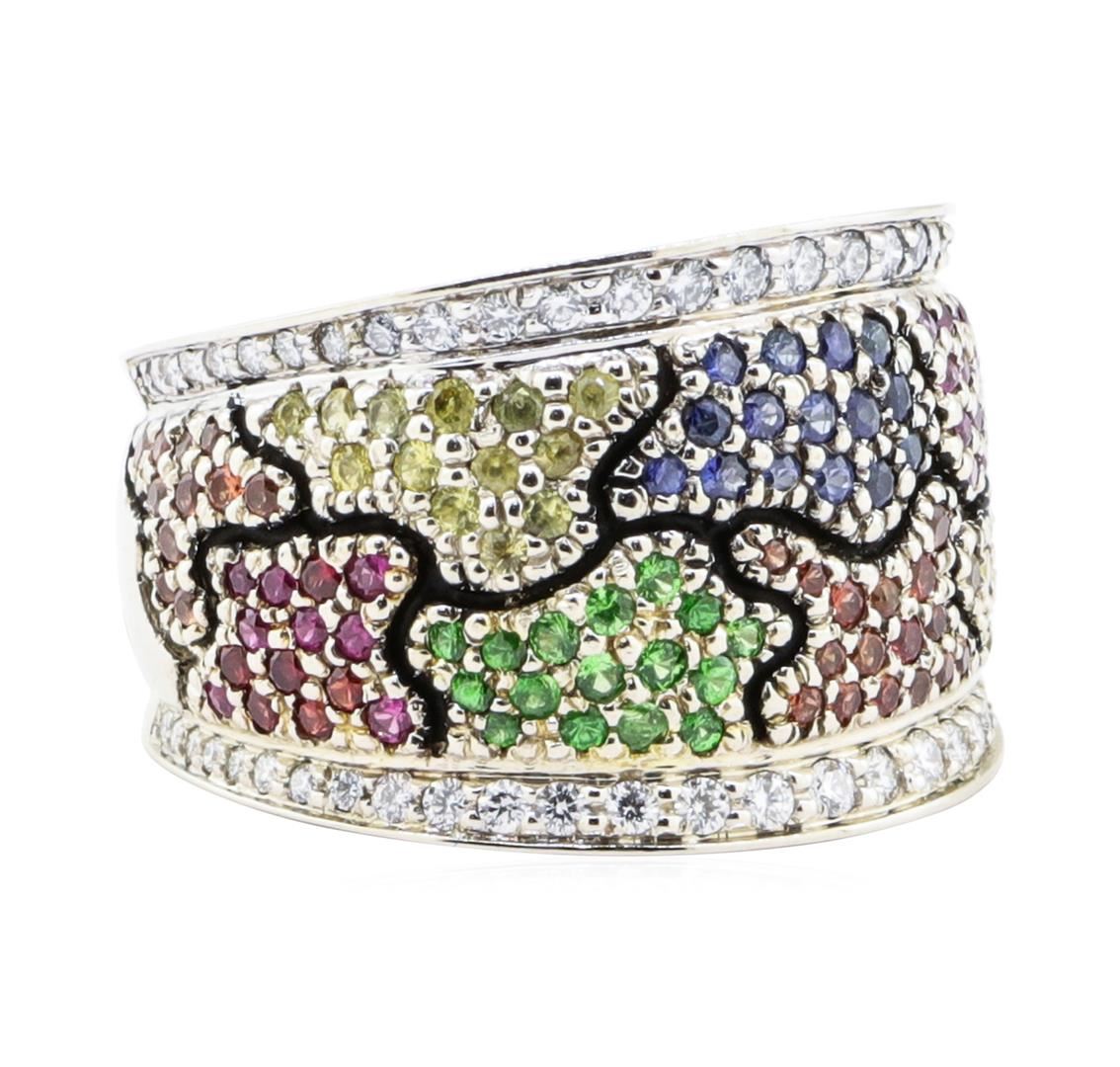 One electronically tested 18KT yellow and white gold lady's combination cast & assembled fashion designer wide band with a tapered shank with a bright polish finish. The featured lady's ring has a mixed color Lily Pad motif separated by black enamel, with diamond borders, and has a shank measuring 8.30 millimeters in width. Trademark is Tolle 2010. Condition is new, good workmanship. Containing: Fifteen prong set round modified brilliant cut natural blue sapphires, measuring 1.35 - 1.30 x 0.86 mm, (depth est.) approximate total weight of 0.15ct., clarity is eye clean, medium, strong, blue color, (GIA B 5/5), cut is very good. Colored gemstones are presumed to have been subjected to commonly used enhancement processes. Transmitting light with no distortion, transparent. Graded in the setting. Twenty-four prong set round modified brilliant cut natural yellow sapphires, measuring 1.30 - 1.25 x 0.83 mm, (depth est.) approximate total weight of 0.24ct., clarity is eye clean, medium, strong, yellow color, (GIA Y 5/5), cut is very good. Colored gemstones are presumed to have been subjected to commonly used enhancement processes. Transmitting light with no distortion, transparent. Graded in the setting. Twenty-seven prong set round modified brilliant cut natural orange sapphires, measuring 1.30 - 1.25 x 0.83 mm, (depth est.) approximate total weight of 0.27ct., clarity is eye clean, medium, strong, reddish orange color, (GIA rO 5/5), cut is very good. Colored gemstones are presumed to have been subjected to commonly used enhancement processes. Transmitting light with no distortion, transparent. Graded in the setting. Thirty-two prong set round modified brilliant cut natural pink sapphires, measuring 1.30 - 1.25 x 0.83 mm, (depth est.) approximate total weight of 0.32ct., clarity is eye clean, medium light, strong, strongly purplish red color, (GIA stpR 4/5), cut is very good. Colored gemstones are presumed to have been subjected to commonly used enhancement processes. Transmitting light with no distortion, transparent. Graded in the setting. Twenty-six prong set round modified brilliant cut natural tsavorite garnets, measuring 1.35 - 1.25 x 0.85 mm, (depth est.) approximate total weight of 0.26ct., clarity is eye clean, medium, strong, slightly yellowish green color, (GIA slyG 5/5), cut is very good. Colored gemstones are presumed to have been subjected to commonly used enhancement processes. Transmitting light with no distortion, transparent. Graded in the setting. Sixty prong set round brilliant cut diamonds, measuring 1.40 - 1.00 x 0.74mm (depth est.) approximate total weight of 60 Stones = 0.40 ct. Graded in the setting. Color F - G Clarity VVS-2 to VS-2 Cut Excellent. Total Weight of Colored Stones 1.24ct.. Total Weight of Diamonds 0.40 ct.. Total Weight of Wide Band 8.90gm GAS Appraised at $3600.00. GAS Appraised.