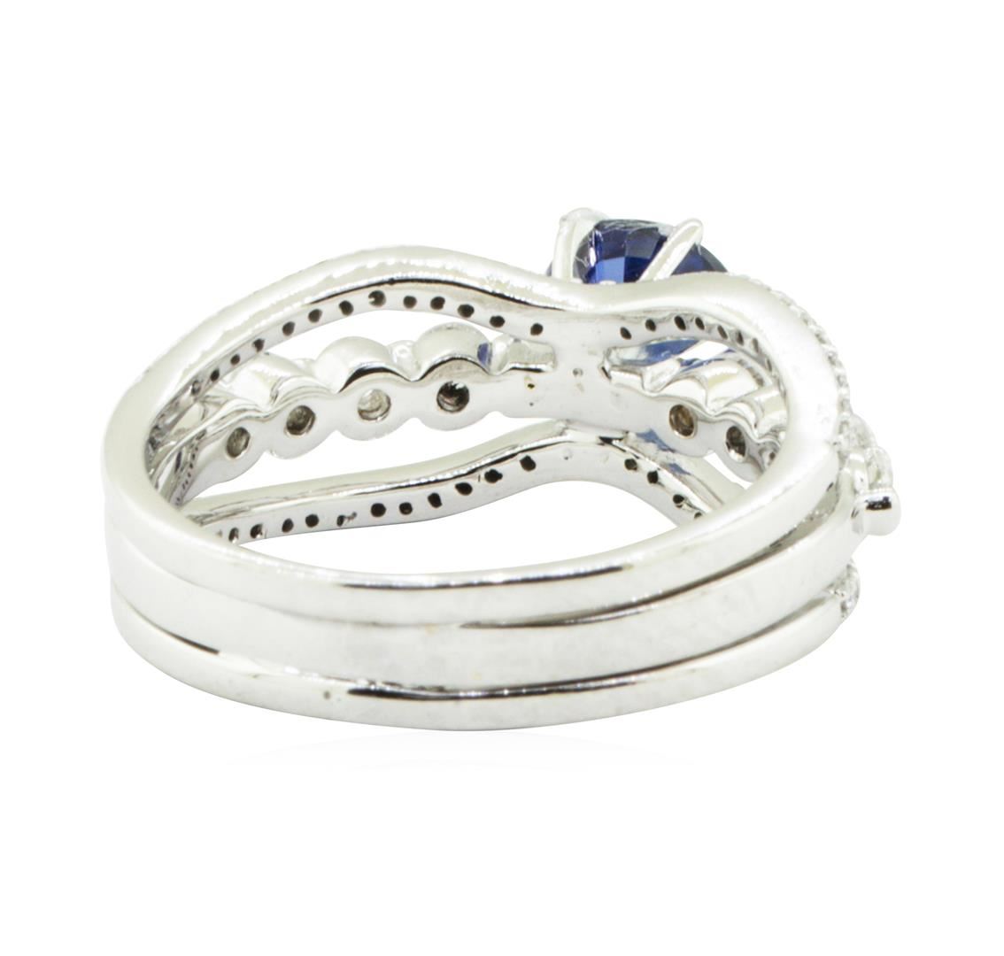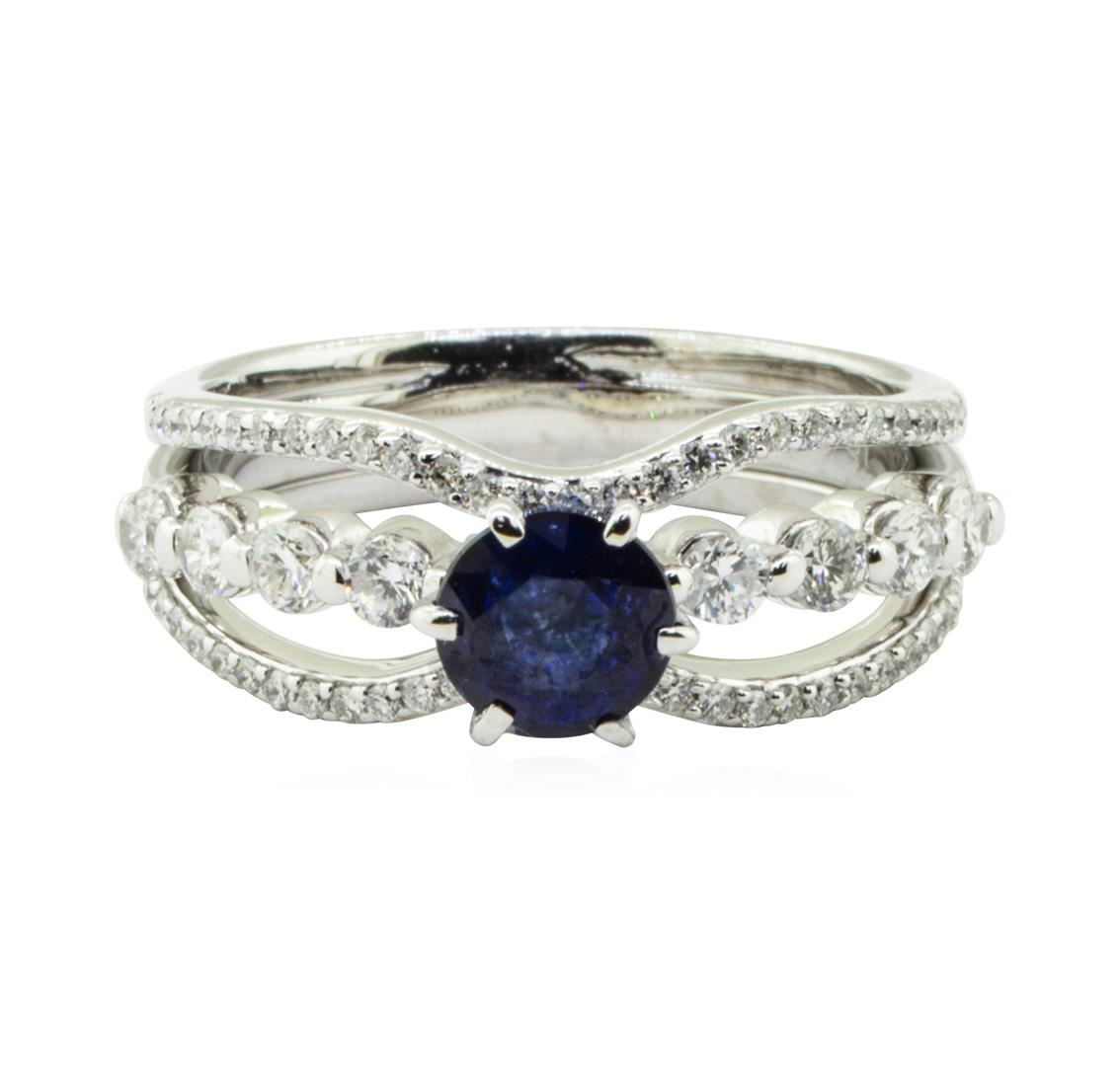 One electronically tested 18KT white gold lady's combination cast & assembled fashion three row ring with a scalloped side bands with a bright polish finish. The featured lady's ring has a triple shank measuring 4.50 millimeters in width. Identified with markings of '18K'. Condition is like new, good workmanship. Containing: One prong set round modified brilliant cut natural blue sapphire, measuring 5.98 - 5.89 x 3.27 mm, (depth est.) approximate weight of 0.95ct., clarity is eye clean, dark, moderately strong, blue color, (GIA B 7/4), cut is very good. Transmitting light with a minimum of distortion, transparent. Colored gemstones are presumed to have been subjected to commonly used enhancement processes. Graded in the setting. Eight prong set round brilliant cut diamonds, measuring 2.40 - 2.35 x 1.48mm (depth est.) approximate total weight of 8 Stones = 0.42ct. Graded in the setting. Color G - H Clarity SI-1 to SI-2 Cut Very Good Fifty-Four prong set round brilliant cut diamonds, measuring 1.10 - 1.10 x 0.68mm (depth est.) approximate total weight of 54 Stones = 0.27ct. Graded in the setting. Color G - H Clarity VS-2 to SI-1 Cut Very Good. Total Weight of Colored Stones 0.95ct.. Total Weight of Diamonds 0.69ct.. Total Weight of Ring 5.90gm GAS Appraised at $4350.00. GAS Appraised.