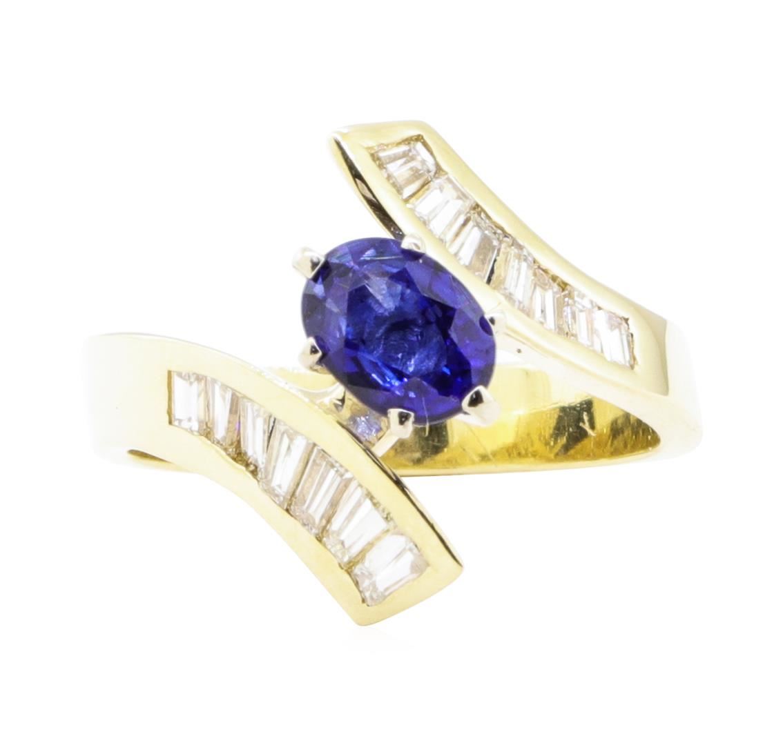 One electronically tested 14KT yellow gold lady's combination cast & assembled fashion ring with a bypass shank with a bright polish finish. The featured lady's ring has a shank measuring 3.60 millimeters wide. Identified with markings of '14K'. Condition is Good. Containing: One prong set oval modified mixed cut natural blue sapphire, measuring 6.90 x 5.07 x 3.30mm, (depth est.) approximate weight of 0.94ct., clarity is slightly included, medium dark, moderately strong, blue color, (GIA B 6/4), cut is good. Transmitting light with a minimum of distortion, transparent. Colored gemstones are presumed to have been subjected to commonly used enhancement processes. Graded in the setting. Fourteen channel set baguette cut (tapered) diamonds, measuring from 2.00 x 1.40 x 1.19mm (depth est.) to 3.30 x 1.70 x 1.45mm (depth est.) approximate total weight of 14 Stones = 0.70ct. Graded in the setting. Color H - I Clarity VS-1 to VS-2 Cut Good. Total Weight of Colored Stones 0.94ct.. Total Weight of Diamonds 0.70ct.. Total Weight of Ring 5.10gm GAS Appraised at $3875.00. GAS Appraised.