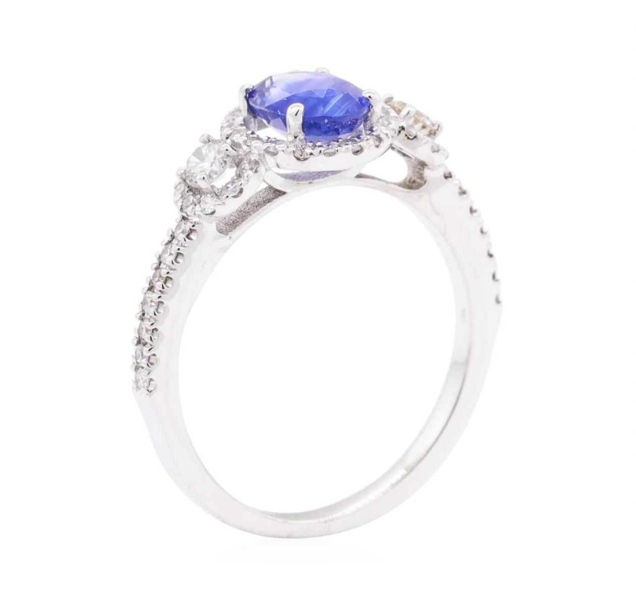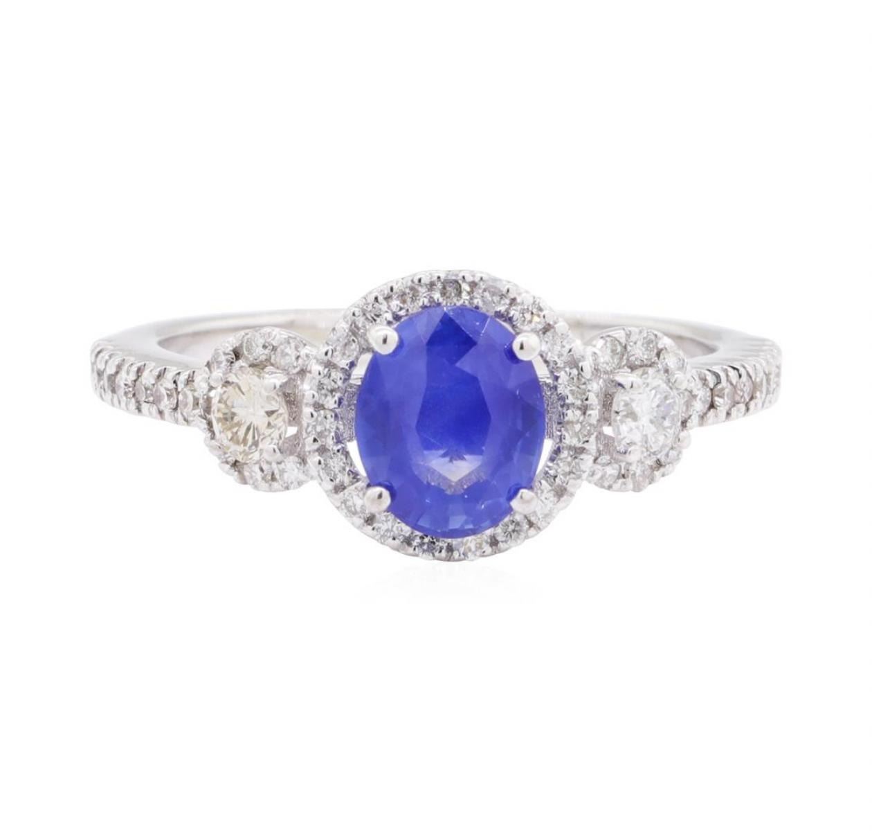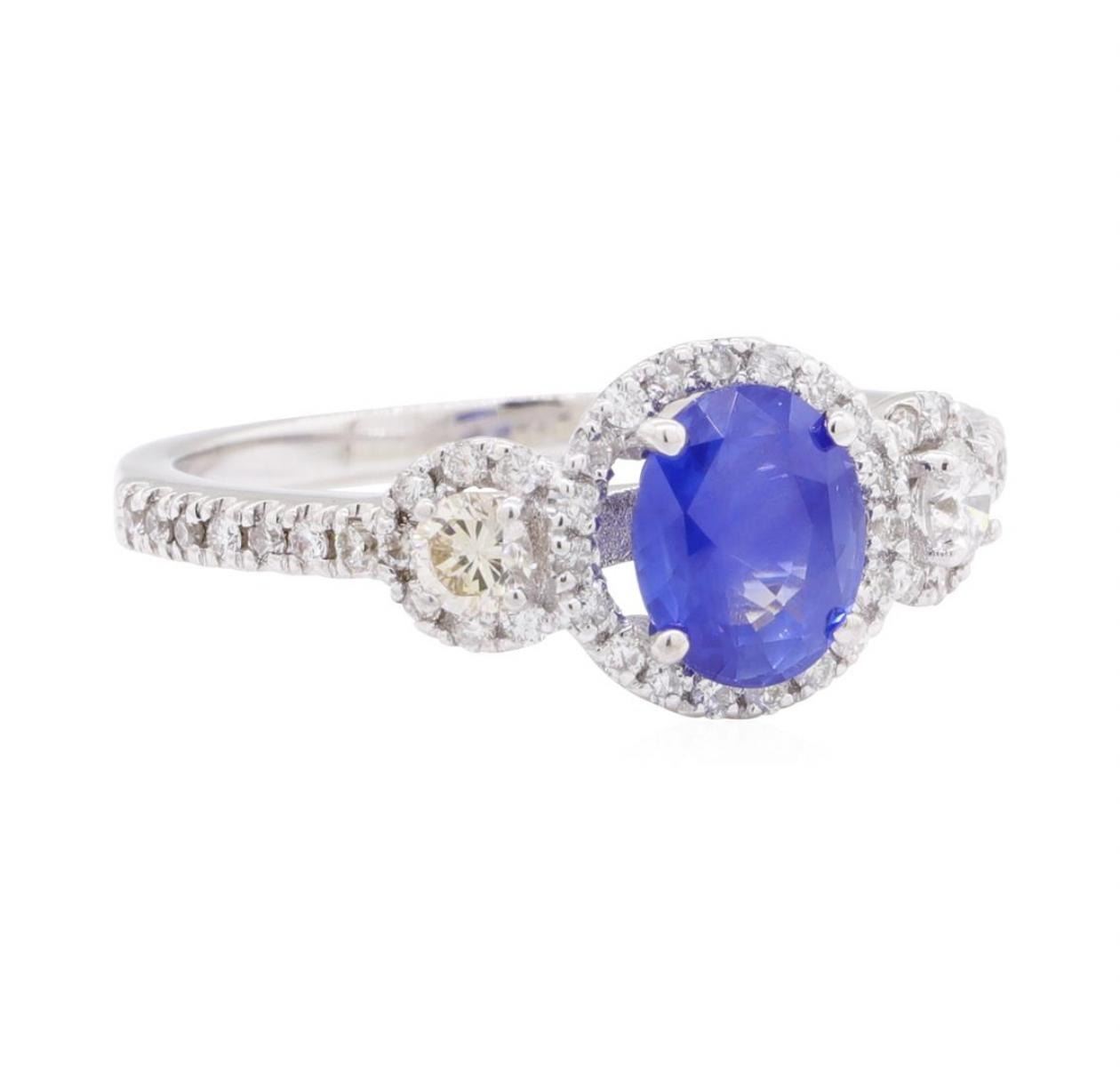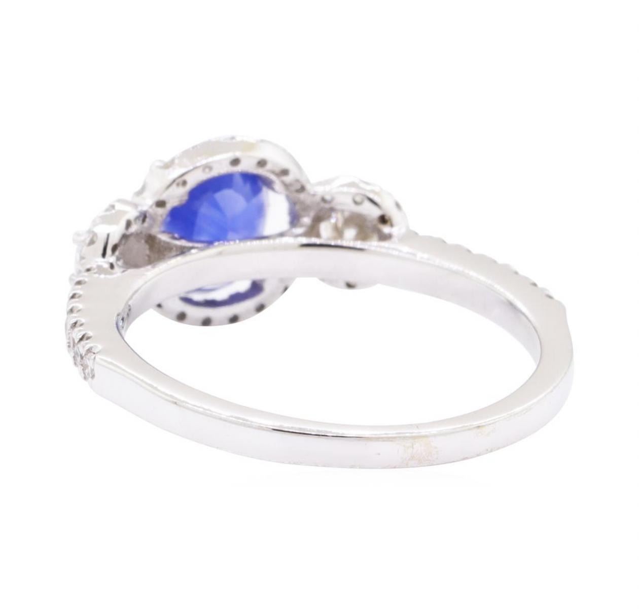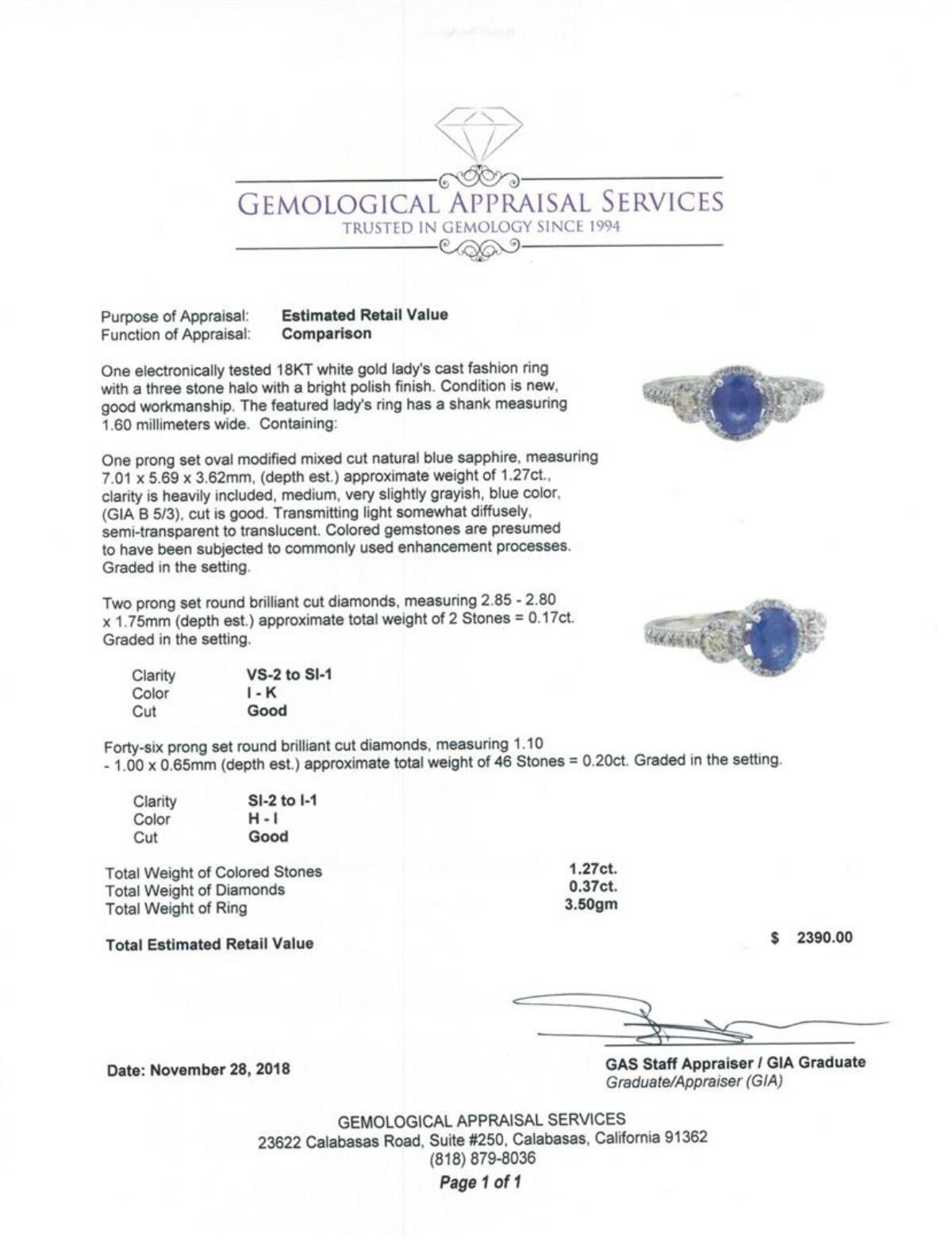 One electronically tested 18KT white gold lady's cast fashion ring with a three stone halo with a bright polish finish. The featured lady's ring has a shank measuring 1.60 millimeters wide. Condition is new, good workmanship. Containing: One prong set oval modified mixed cut natural blue sapphire, measuring 7.01 x 5.69 x 3.62mm, (depth est.) approximate weight of 1.27ct., clarity is heavily included, medium, very slightly grayish, blue color, (GIA B 5/3), cut is good. Transmitting light somewhat diffusely, semi-transparent to translucent. Colored gemstones are presumed to have been subjected to commonly used enhancement processes. Graded in the setting. Two prong set round brilliant cut diamonds, measuring 2.85 - 2.80 x 1.75mm (depth est.) approximate total weight of 2 Stones = 0.17ct. Graded in the setting. Color I - K Clarity VS-2 to SI-1 Cut Good Forty-Six prong set round brilliant cut diamonds, measuring 1.10 - 1.00 x 0.65mm (depth est.) approximate total weight of 46 Stones = 0.20ct. Graded in the setting. Color H - I Clarity SI-2 to I-1 Cut Good. Total Weight of Colored Stones 1.27ct.. Total Weight of Diamonds 0.37ct.. Total Weight of Ring 3.50gm GAS Appraised at $2390.00. GAS Appraised at $2,390.00.
