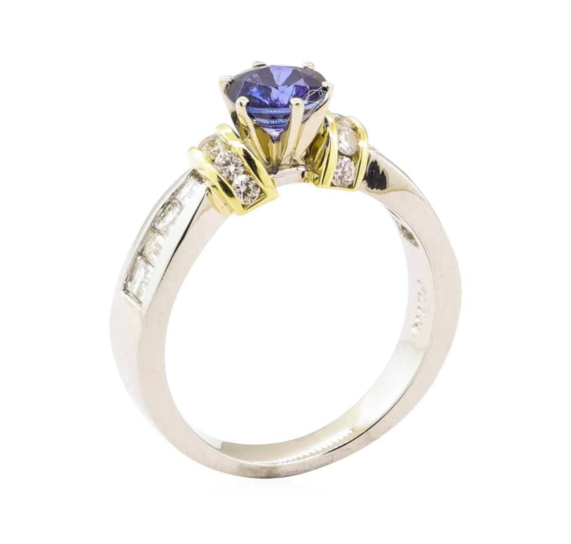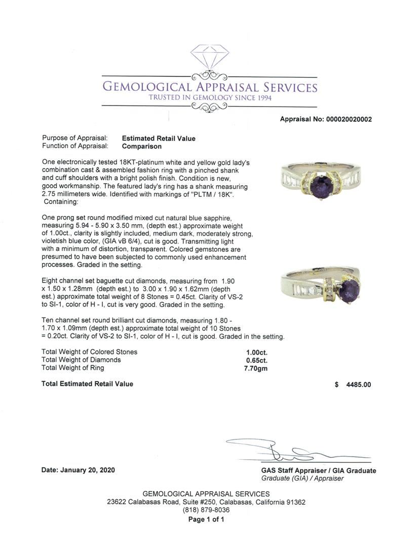 One electronically tested 18KT-platinum white and yellow gold lady's combination cast & assembled fashion ring with a pinched shank and cuff shoulders with a bright polish finish. The featured lady's ring has a shank measuring 2.75 millimeters wide. Identified with markings of 'PLTM / 18K'. Condition is new, good workmanship. Containing: One prong set round modified mixed cut natural blue sapphire, measuring 5.94 - 5.90 x 3.50 mm, (depth est.) approximate weight of 1.00ct., clarity is slightly included, medium dark, moderately strong, violetish blue color, (GIA vB 6/4), cut is good. Transmitting light with a minimum of distortion, transparent. Colored gemstones are presumed to have been subjected to commonly used enhancement processes. Graded in the setting. Eight channel set baguette cut diamonds, measuring from 1.90 x 1.50 x 1.28mm (depth est.) to 3.00 x 1.90 x 1.62mm (depth est.) approximate total weight of 8 Stones = 0.45ct. Graded in the setting. Color H - I Clarity VS-2 to SI-1 Cut Very Good Ten channel set round brilliant cut diamonds, measuring 1.80 - 1.70 x 1.09mm (depth est.) approximate total weight of 10 Stones = 0.20ct. Graded in the setting. Color H - I Clarity VS-2 to SI-1 Cut Good. Total Weight of Colored Stones 1.00ct.. Total Weight of Diamonds 0.65ct.. Total Weight of Ring 7.70gm GAS Appraised at $4485.00. GAS Appraised.