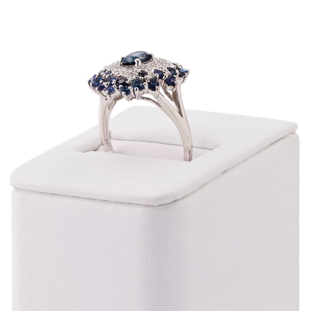 14K Gold Sapphire Diamond Ring One polished, stamped, and tested 14K white gold ring with a bright finish. The ring is mounted with 33 genuine sapphires weighing approximately 1.65 carats, and 66 genuine round diamonds weighing approximately 0.14 carats. This item weighs 4.2 grams, condition is new, excellent workmanship. MAIN GEMSTONES Species: Natural Corundum Variety: Sapphire Shape: Oval / Round Quantity: 33 Sapphires Measurements: 6 x 4 mm (1 oval) 1.5 - 2.0 mm (32 round) Total Weight: 1.65 carats Color: Blue Cut Grade: Good - Very Good Refractive Index: 1.762 - 1.770 DR Birefringence: 0.008 - 0.010 Hardness: 9 ADJACENT GEMSTONES ON RING Identity: Natural Diamond Shape: Round Quantity: 66 Diamonds Measurements: 0.8 - 1.0 mm Total Weight: 0.14 carats Clarity Grade: SI1 - SI2 Color Grade: G - H Refractive Index: 2.418 Hardness: 10 TOTAL SAPPHIRE WEIGHT: 1.65ctw TOTAL DIAMOND WEIGHT: 0.14ctw WEIGHT OF ITEM: 4.2 grams GOLD CONTENT: 14K White Gold