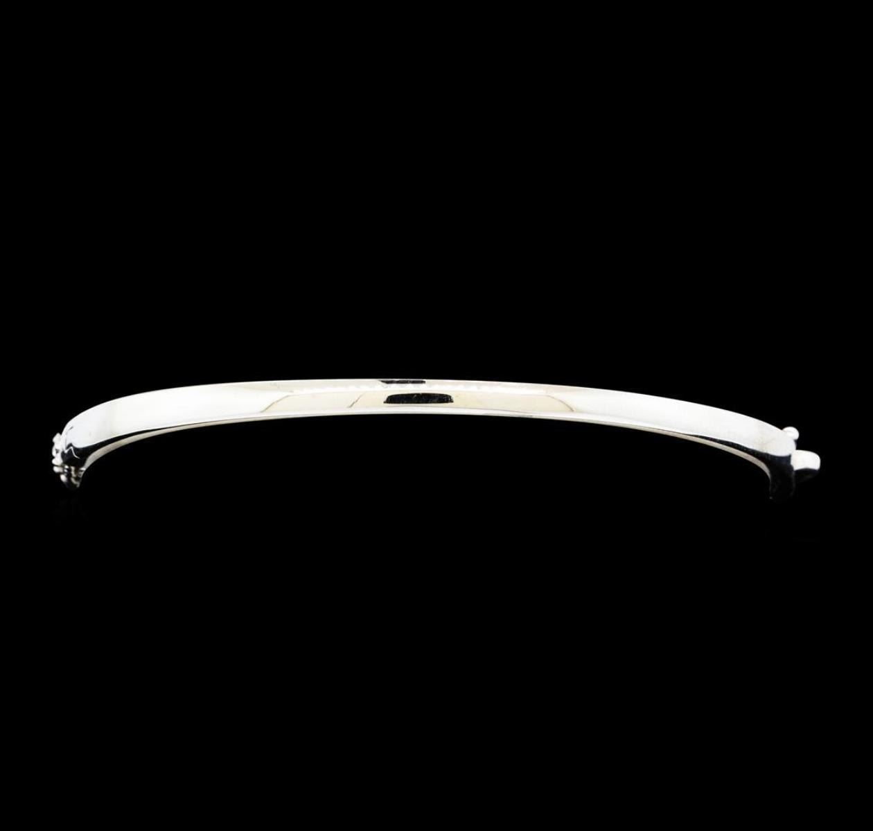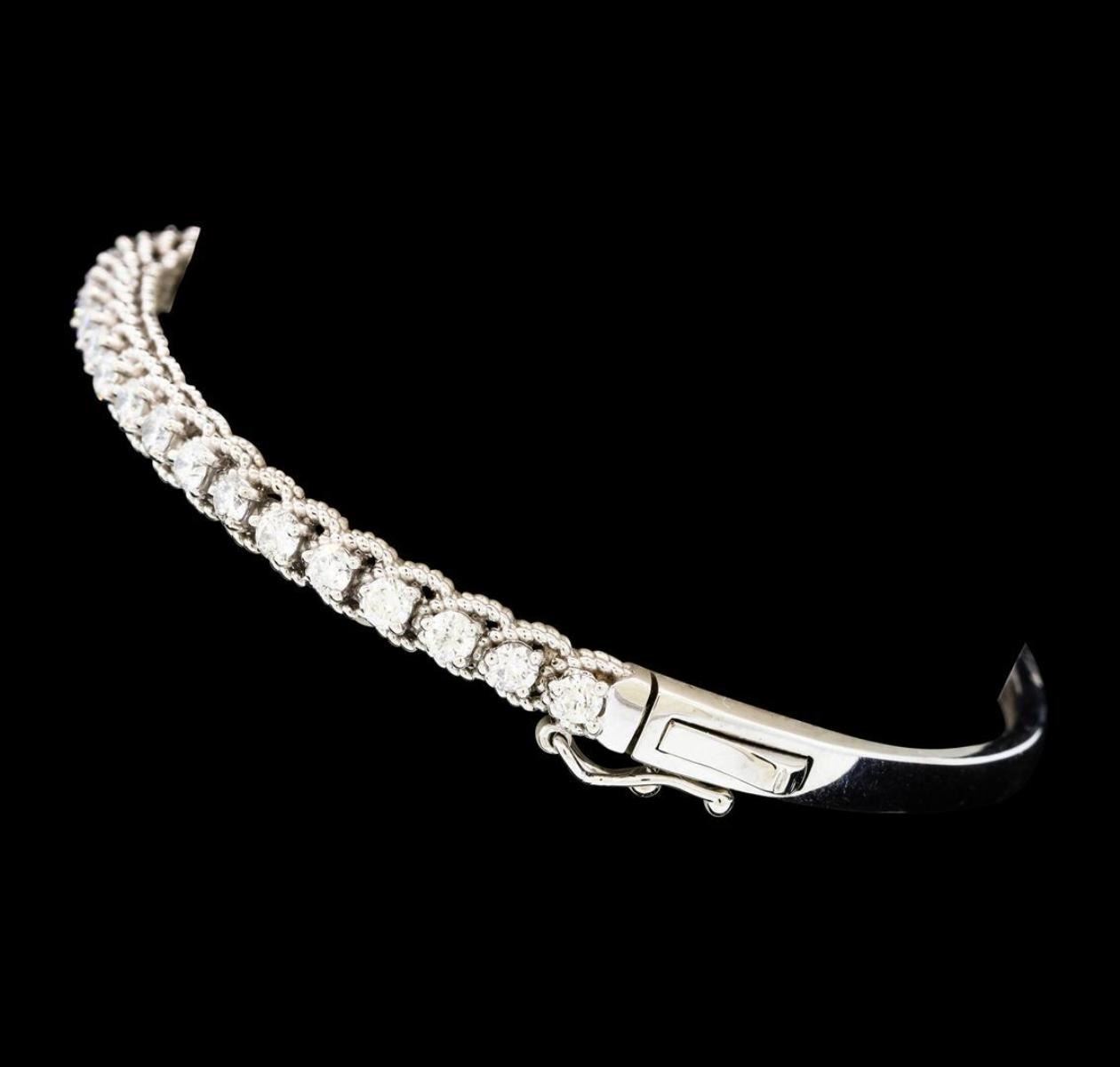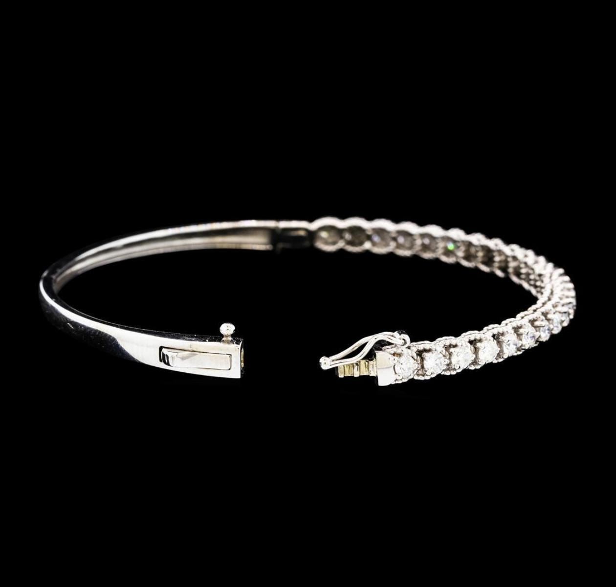 One electronically tested 14KT white gold lady's combination cast & assembled fashion bangle bracelet with a tongue clasp with foldover safety with a bright polish with milgrain detailing finish. The featured lady's bracelet measures approximately 7 inches in length. Identified with markings of 'K14'. Condition is new, good workmanship. Containing: Twenty-Five prong set round brilliant cut diamonds, measuring 2.60 - 2.55 x 1.60mm (depth est.) approximate total weight of 25 Stones = 1.65ct. Graded in the setting. Clarity SI-1 to I-1. Color: G - H Cut Good. Total Weight of Diamonds 1.65ct.. Total Weight of Bangle Bracelet 10.60gm. GAS Appraised.