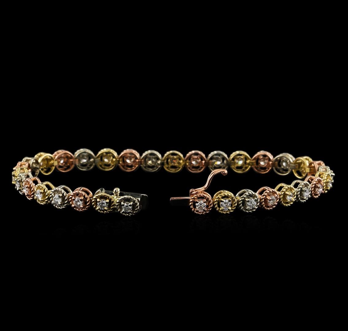 One electronically tested 14KT rose, yellow and white gold ladies cast & assembled diamond bracelet. Seven inch length bracelet composed of a flexible ribbon of diamonds set within tri-colored rope detailed bezels, terminating in a concealed clasp with safety. Bright polish finish. Identified with markings of "K14". Condition is new, good workmanship. Containing: Thirty-Three prong set round brilliant cut diamonds, measuring 2.40 - 2.30 x 1.41mm exact total weight 33 Stones = 1.65ct. Graded in the setting. Clarity: SI-2 to I-1. Color: G - I. Total Weight of Diamonds 1.65ct. Total Weight of Bracelet 12.00gm. AIG Appraised.