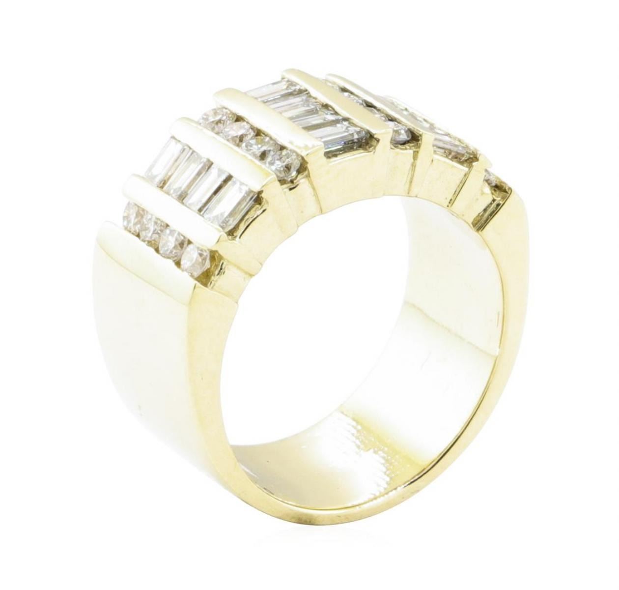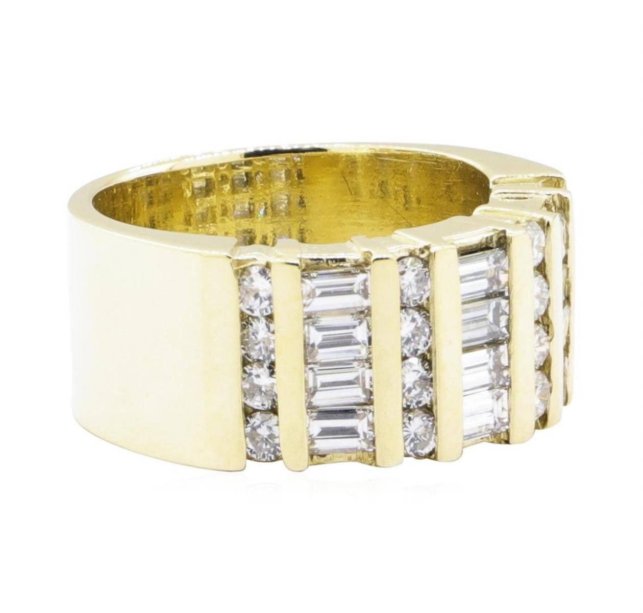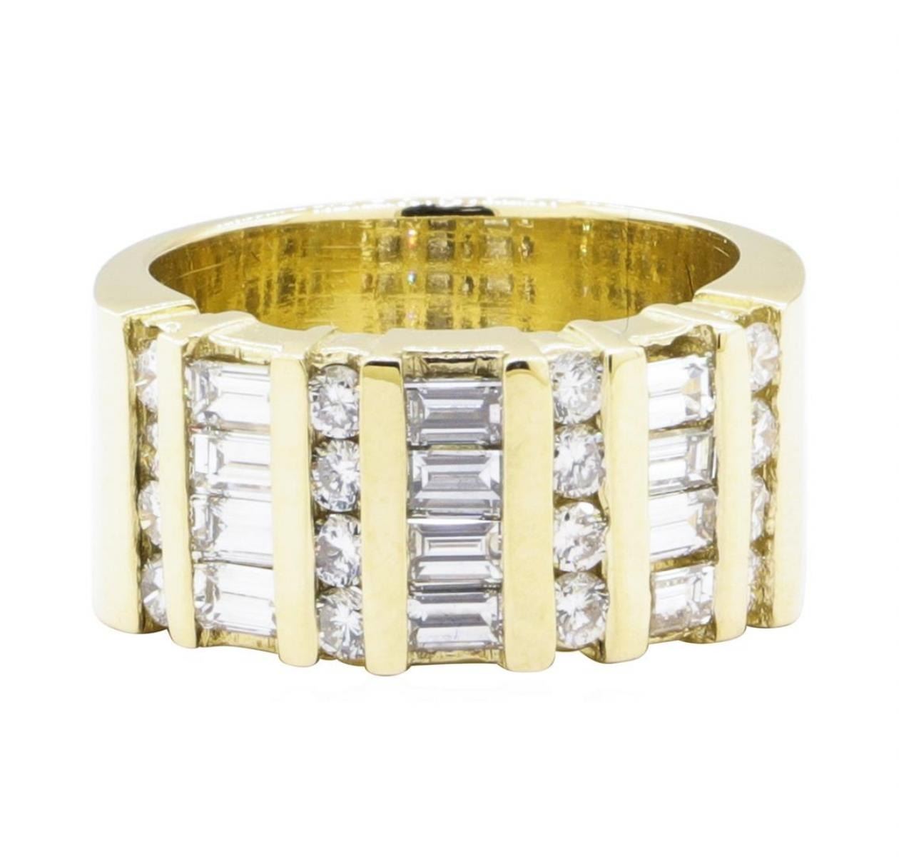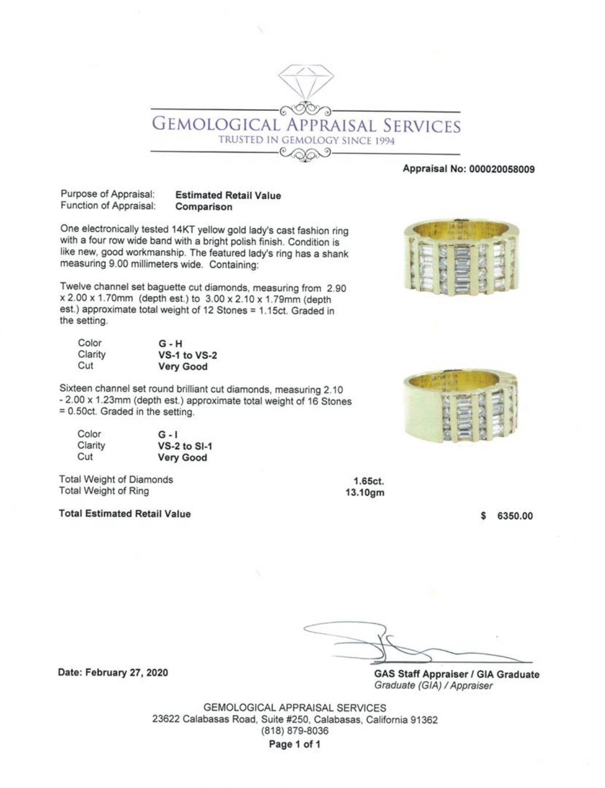 One electronically tested 14KT yellow gold lady's cast fashion ring with a four row wide band with a bright polish finish. The featured lady's ring has a shank measuring 9.00 millimeters wide. Condition is Good. Containing: Twelve channel set baguette cut diamonds, measuring from 2.90 x 2.00 x 1.70mm (depth est.) to 3.00 x 2.10 x 1.79mm (depth est.) approximate total weight of 12 Stones = 1.15ct. Graded in the setting. Color G - H Clarity VS-1 to VS-2 Cut Very Good Sixteen channel set round brilliant cut diamonds, measuring 2.10 - 2.00 x 1.23mm (depth est.) approximate total weight of 16 Stones = 0.50ct. Graded in the setting. Color G - I Clarity VS-2 to SI-1 Cut Very Good. Total Weight of Diamonds 1.65ct.. Total Weight of Ring 13.10gm GAS Appraised at $6350.00. GAS Appraised.