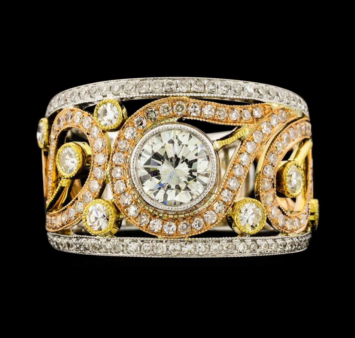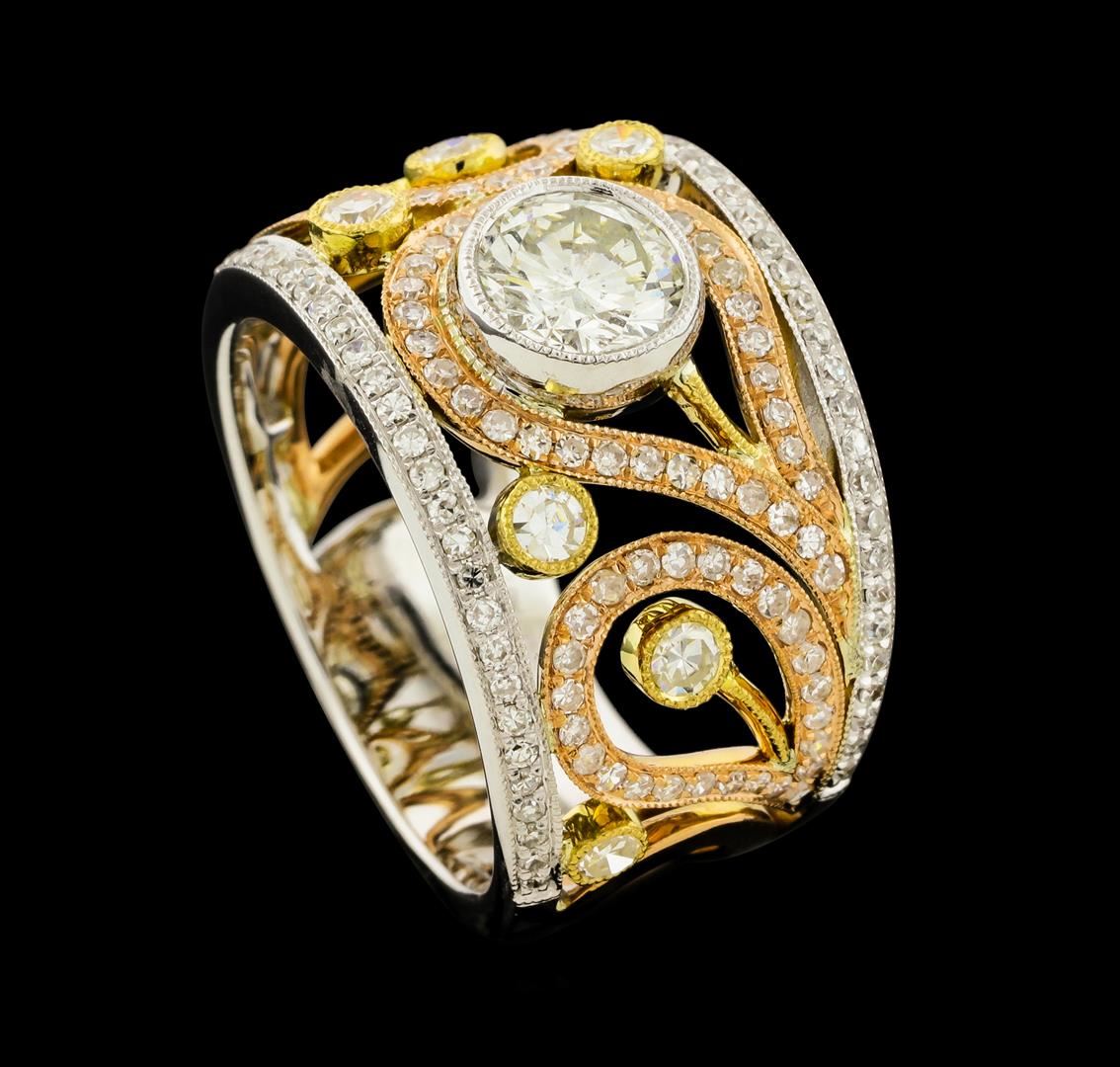 One electronically tested 18KT yellow, white, and rose gold lady's combination cast & assembled wide band fashion ring with a tapered shank with a bright polish with milgrain detailing finish. The featured lady's ring has a shank measuring 7.92 millimeters wide. Trademark is MICHA. Identified with markings of '18K 750'. Condition is new, good workmanship. Containing: One bezel set round brilliant cut diamond, measuring 6.10 - 6.00 x 3.45mm (depth est.) approximate weight of 0.77ct. Graded in the setting. Clarity SI-2. Color: I Cut Good Seven prong set single cut diamonds, measuring 2.30 - 2.00 x 1.33mm (depth est.) approximate total weight of 7 Stones = 0.27ct. Graded in the setting. Clarity VS-2 to SI-1. Color: G - H Cut Very Good One Hundred Forty-Three prong set single cut diamonds, measuring 1.10 - 0.95 x 0.64mm (depth est.) approximate total weight of 143 Stones = 0.61ct. Graded in the setting. Clarity SI-1 to I-1. Color: H - I Cut Good. Total Weight of Diamonds 1.65ct.. Total Weight of Ring 9.80gm. GAS Appraised.