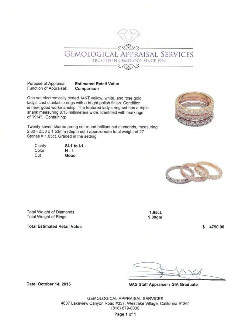 One set electronically tested 14KT yellow, white, and rose gold lady's cast stackable rings with a bright polish finish. The featured lady's ring set has a triple shank measuring 8.15 millimeters wide. Identified with markings of "K14". Condition is new, good workmanship. Containing: Twenty-Seven shared prong set round brilliant cut diamonds, measuring 2.60 - 2.50 x 1.53mm (depth est.) approximate total weight of 27 Stones = 1.65ct. Graded in the setting. Clarity: SI-1 to I-1. Color: H - I. Cut Good. Total Weight of Diamonds 1.65ct. Total Weight of Rings 9.00gm. GAS Appraised.