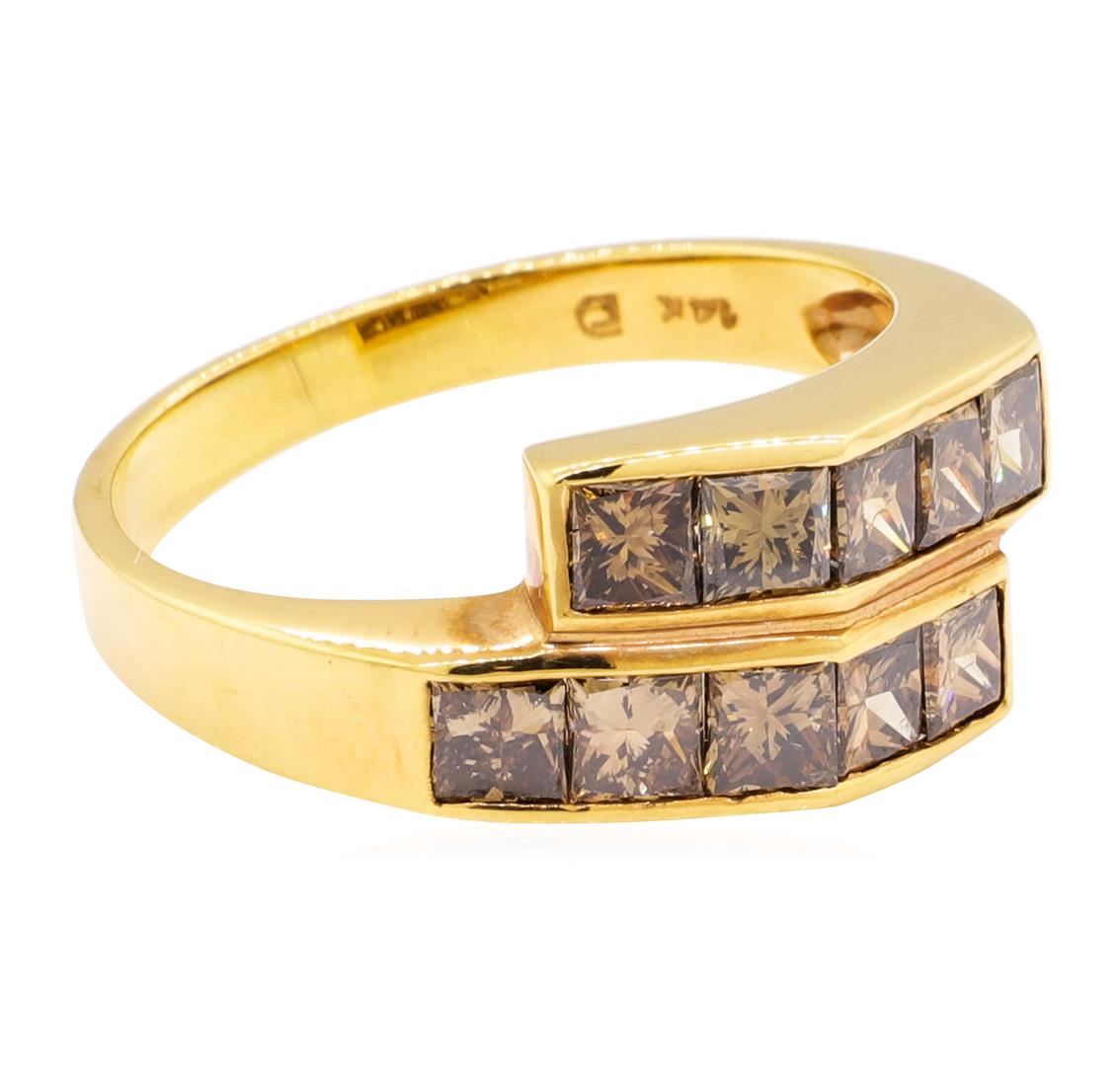 One electronically tested 14KT rose gold lady's cast fashion ring with a bypass shank with a bright polish finish. The featured lady's ring has a shank measuring 2.60 millimeters wide. Identified with markings of '14K'. Condition is new, good workmanship. Containing: Ten channel set princess cut treated diamonds, measuring 3.00 x 3.00 x 2.25mm (depth est.) approximate total weight of 10 Stones = 1.65ct. Colored gemstones are presumed to have been subjected to commonly used enhancement processes. Graded in the setting. Color Fancy Dark Brown Clarity VS-2 to SI-1 Cut Very Good. Total Weight of Diamonds 1.65ct.. Total Weight of Ring 4.40gm GAS Appraised at $3150.00. GAS Appraised.