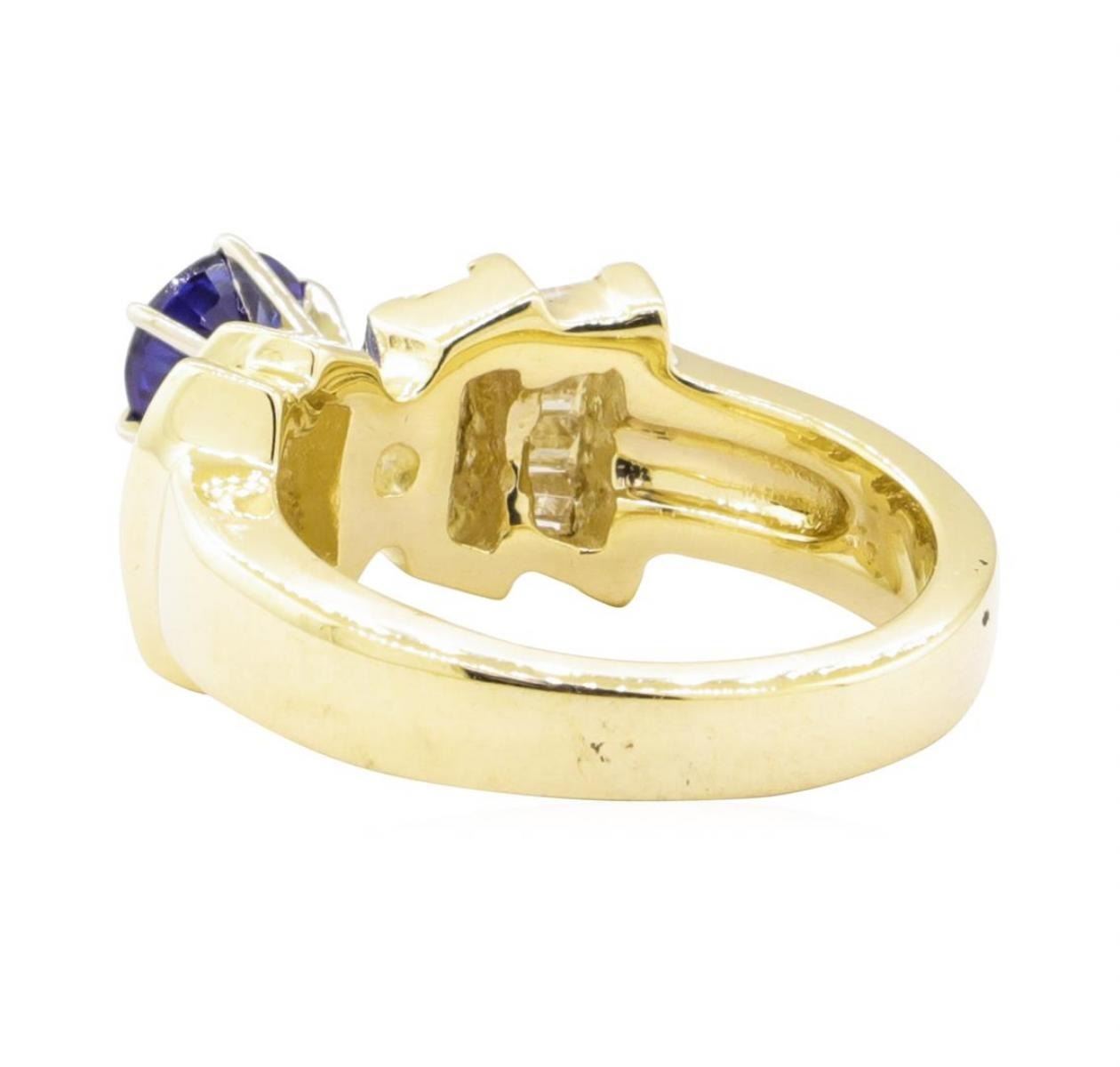 One electronically tested 14KT yellow gold lady's combination cast & assembled fashion ring with a bow motif with a bright polish finish. The featured lady's ring has a shank measuring 3.50 millimeters wide. Identified with markings of '14K'. Condition is new, good workmanship. Containing: One prong set round modified mixed cut natural blue sapphire, measuring 5.81 - 5.77 x 3.60 mm, (depth est.) approximate weight of 0.95ct., clarity is slightly included, medium dark, moderately strong, blue color, (GIA B 6/4), cut is good. Transmitting light with a minimum of distortion, transparent. Colored gemstones are presumed to have been subjected to commonly used enhancement processes. Graded in the setting. Twenty channel set baguette cut diamonds, measuring from 1.80 x 1.50 x 1.28mm (depth est.) to 2.00 x 1.60 x 1.36mm (depth est.) approximate total weight of 20 Stones = 0.71ct. Graded in the setting. Color H - I Clarity VS-1 to VS-2 Cut Very Good. Total Weight of Colored Stones 0.95ct.. Total Weight of Diamonds 0.71ct.. Total Weight of Ring 8.60gm GAS Appraised at $4085.00. GAS Appraised.
