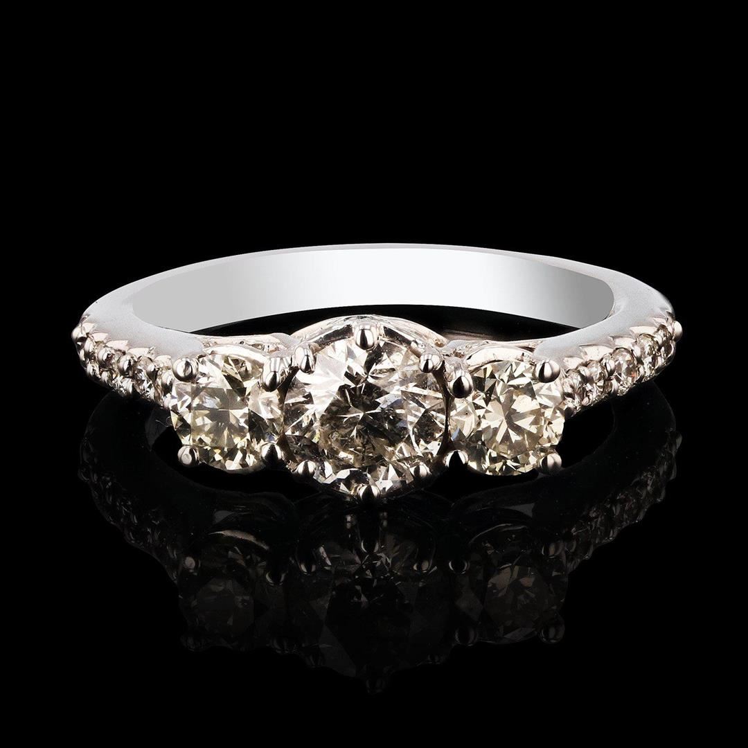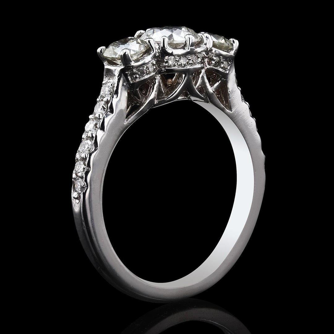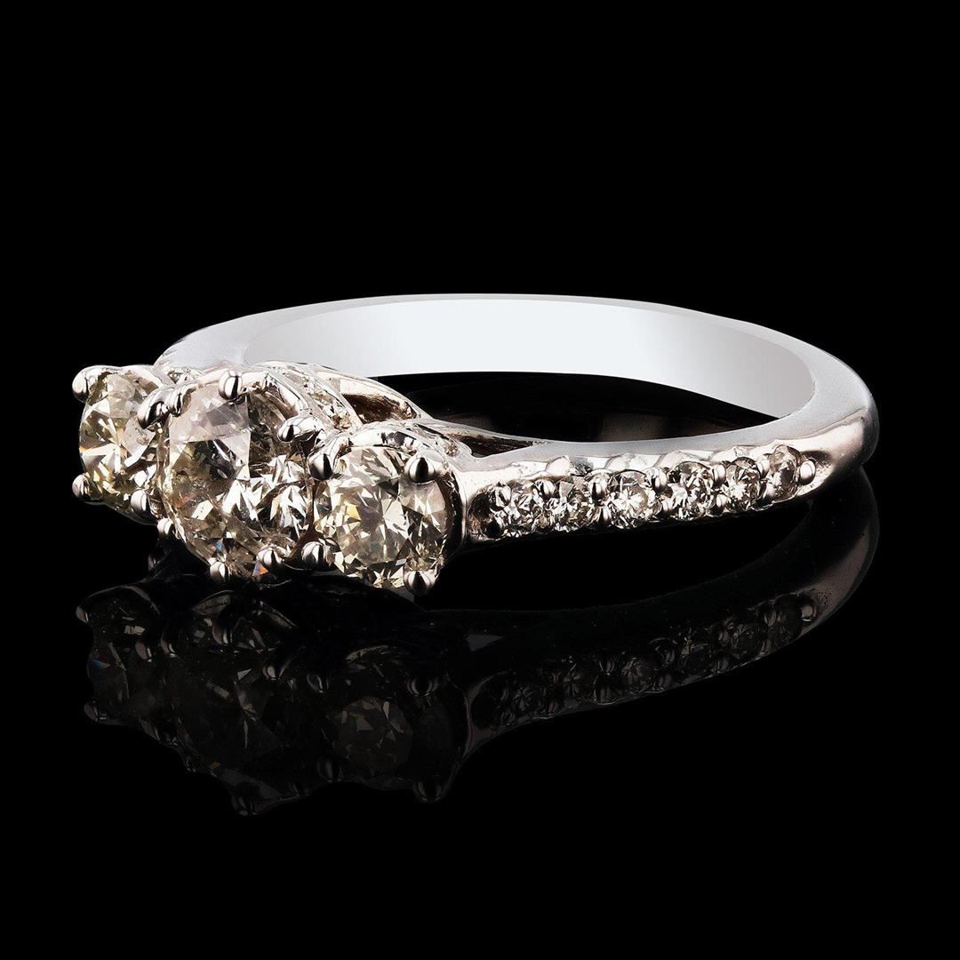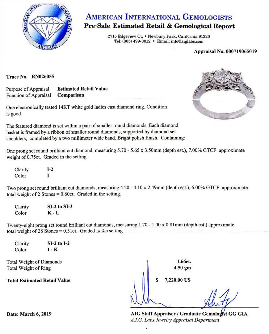 One electronically tested 14KT white gold ladies cast diamond ring. Condition is good. The featured diamond is set within a pair of smaller round diamonds. Each diamond basket is framed by a ribbon of smaller round diamonds, supported by diamond set shoulders, completed by a two millimeter wide band. Bright polish finish. Containing: One prong set round brilliant cut diamond, measuring 5.70mm to 5.65mm x 3.50mm (depth est.), 7.00% GTCF approximate weight of 0.75ct. Graded in the setting. Clarity I2 Color I Two prong set round brilliant cut diamonds, measuring 4.20mm to 4.10mm x 2.49mm (depth est.), 6.00% GTCF approximate total weight of 2 Stones = 0.60ct. Graded in the setting. Clarity SI2 to SI3 Color K - L Twenty-eight prong set round brilliant cut diamonds, measuring 1.70mm to 1.00mm x 0.81mm (depth est.) approximate total weight of 28 Stones = 0.31ct. Graded die suiting. Clarity SI2 to I2 Color I - K Total Weight of Diamonds 1.66ct. Total Weight of Ring 4.50 gm
