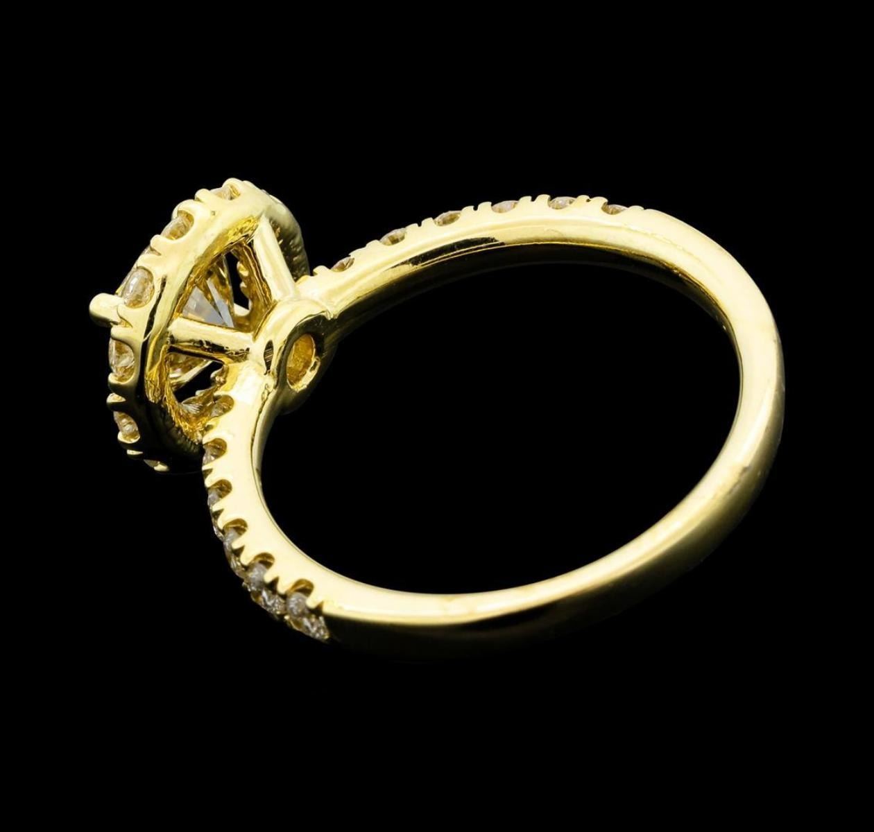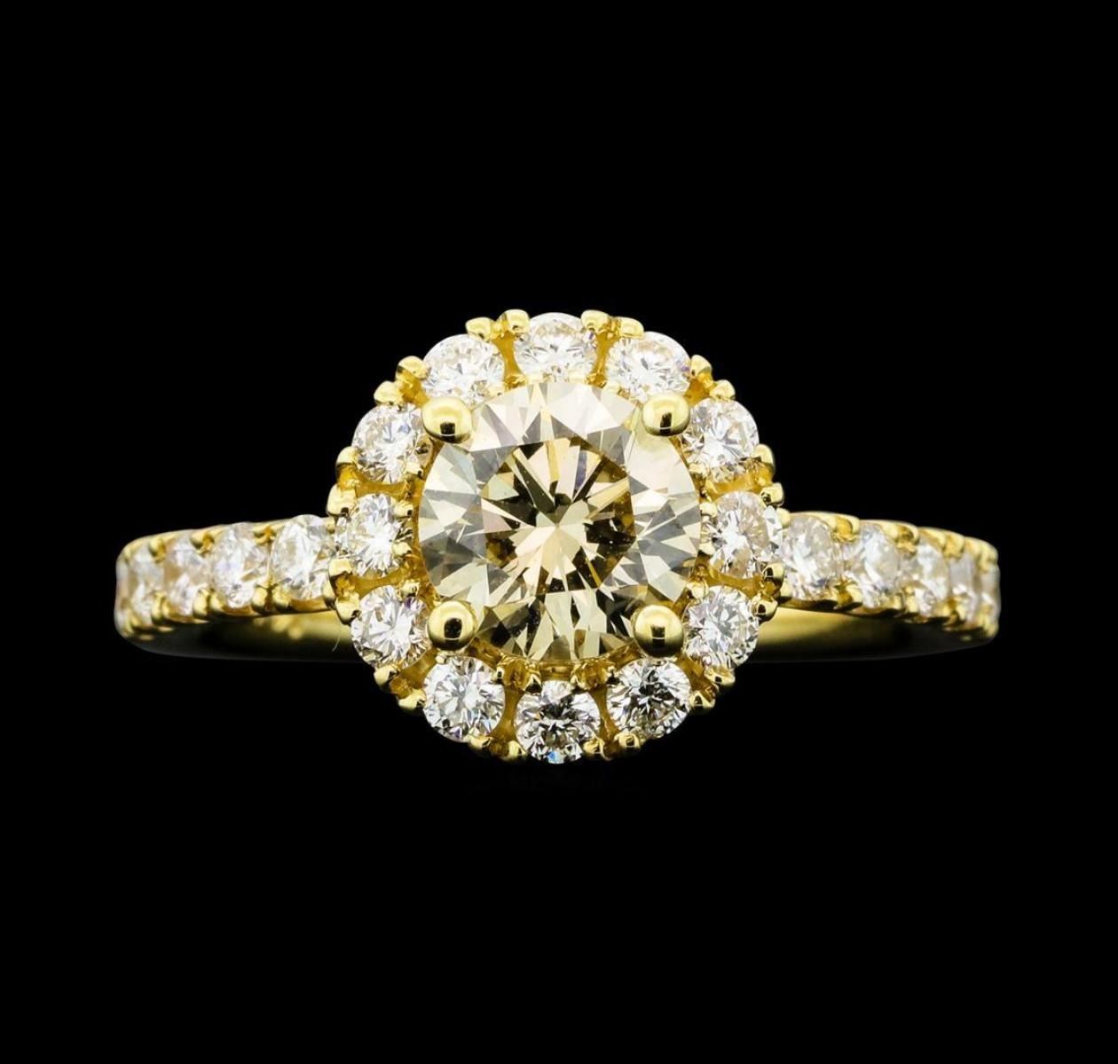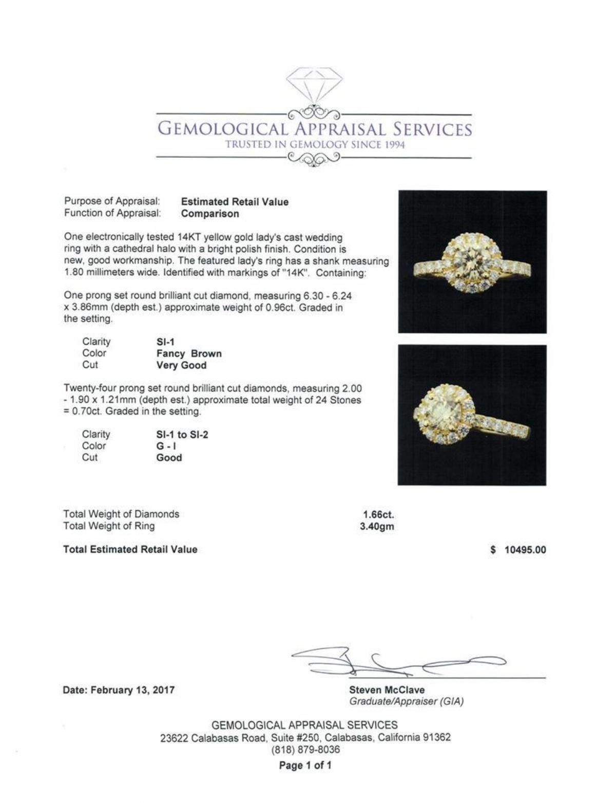 One electronically tested 14KT yellow gold lady's cast wedding ring with a cathedral halo with a bright polish finish. The featured lady's ring has a shank measuring 1.80 millimeters wide. Identified with markings of '14K'. Condition is new, good workmanship. Containing: One prong set round brilliant cut diamond, measuring 6.30 - 6.24 x 3.86mm (depth est.) approximate weight of 0.96ct. Graded in the setting. Clarity SI-1 Cut Very Good Twenty-Four prong set round brilliant cut diamonds, measuring 2.00 - 1.90 x 1.21mm (depth est.) approximate total weight of 24 Stones = 0.70ct. Graded in the setting. Clarity SI-1 to SI-2. Color: G - I Cut Good. Total Weight of Diamonds 1.66ct.. Total Weight of Ring 3.40gm. GAS Appraised.