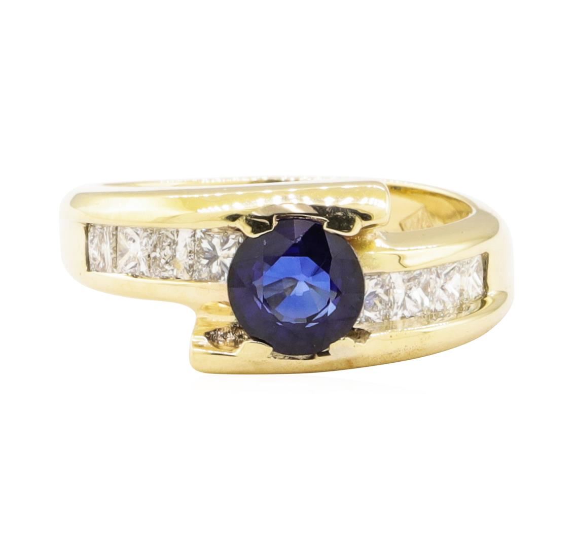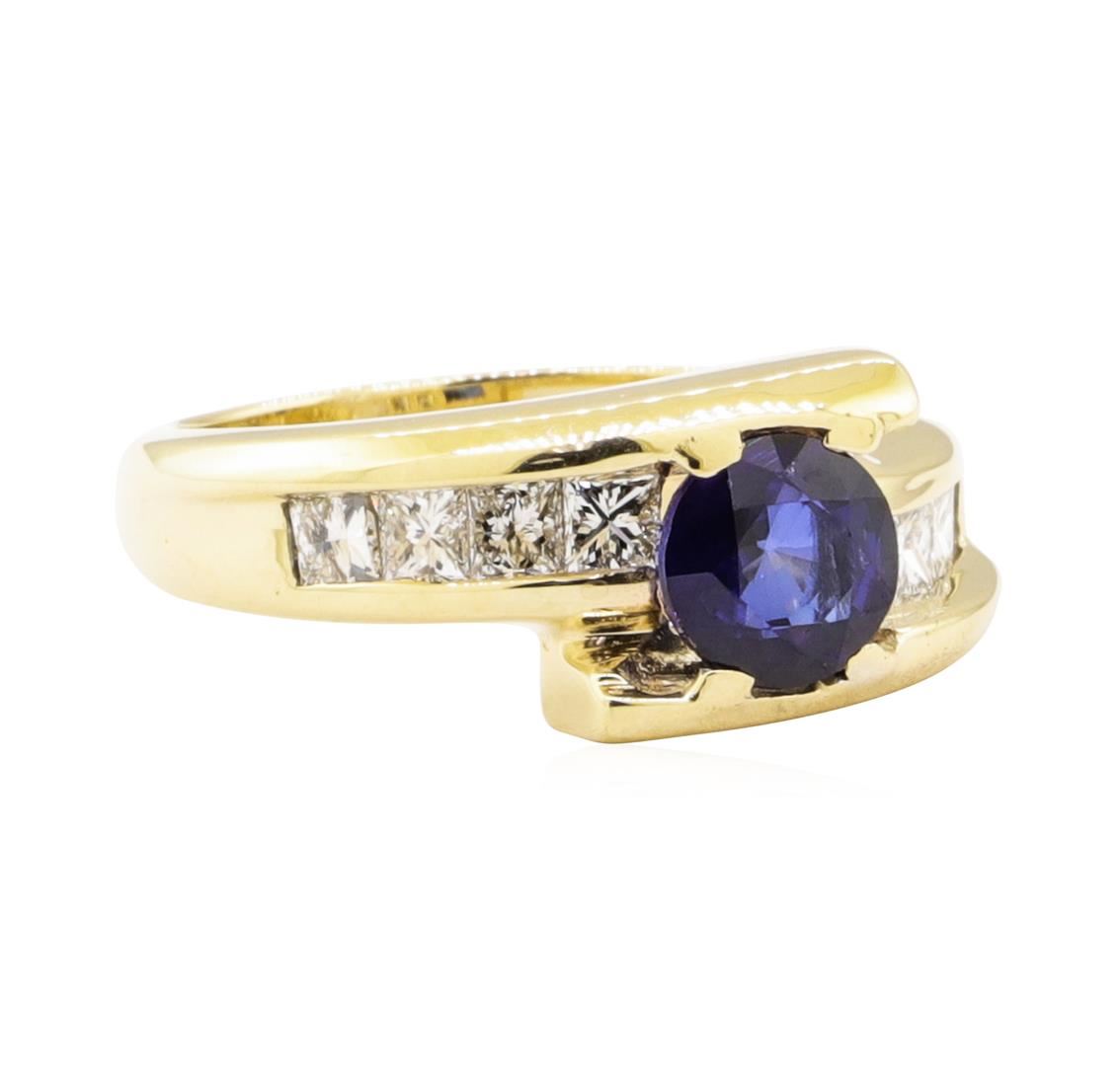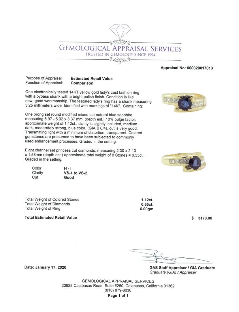 One electronically tested 14KT yellow gold lady's cast fashion ring with a bypass shank with a bright polish finish. The featured lady's ring has a shank measuring 3.25 millimeters wide. Identified with markings of '14K'. Condition is like new, good workmanship. Containing: One prong set round modified mixed cut natural blue sapphire, measuring 5.97 - 5.92 x 3.37 mm, (depth est.) 10%. bulge factor, approximate weight of 1.12ct., clarity is slightly included, medium dark, moderately strong, blue color, (GIA B 6/4), cut is very good. Transmitting light with a minimum of distortion, transparent. Colored gemstones are presumed to have been subjected to commonly used enhancement processes. Graded in the setting. Eight channel set princess cut diamonds, measuring 2.30 x 2.10 x 1.58mm (depth est.) approximate total weight of 8 Stones = 0.55ct. Graded in the setting. Color H - I Clarity VS-1 to VS-2 Cut Good. Total Weight of Colored Stones 1.12ct.. Total Weight of Diamonds 0.55ct.. Total Weight of Ring 6.00gm GAS Appraised at $3170.00. GAS Appraised.