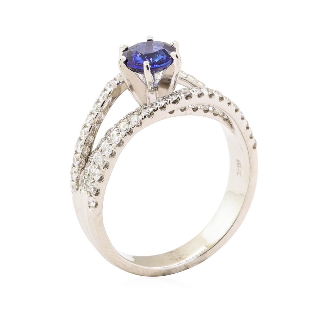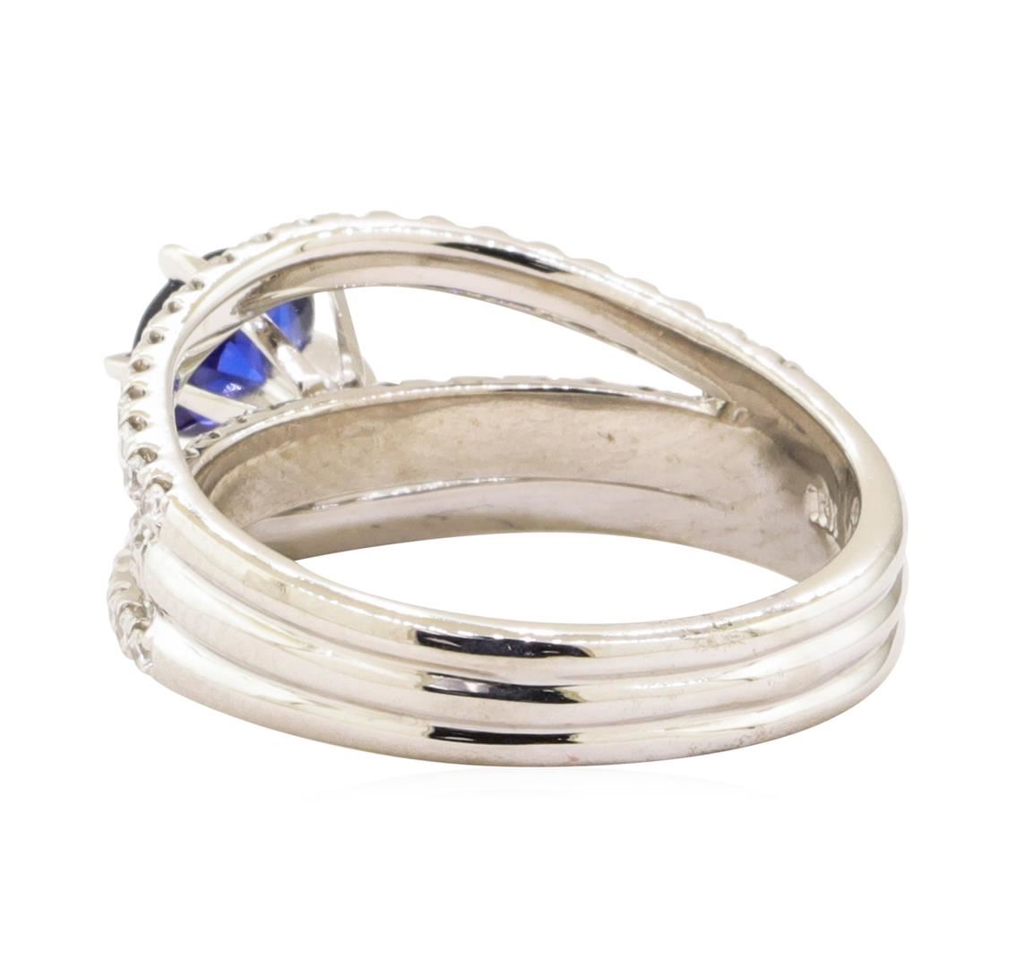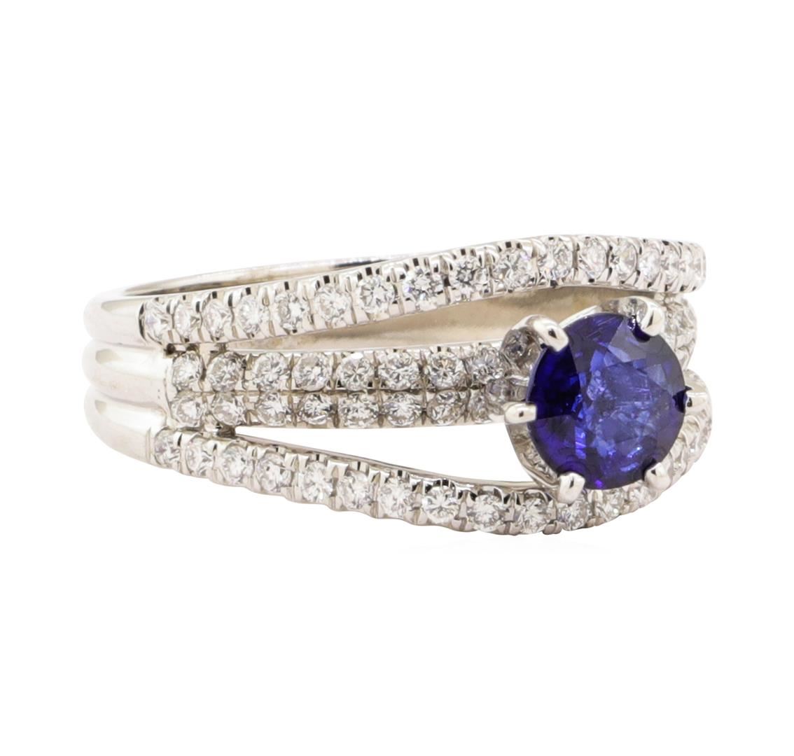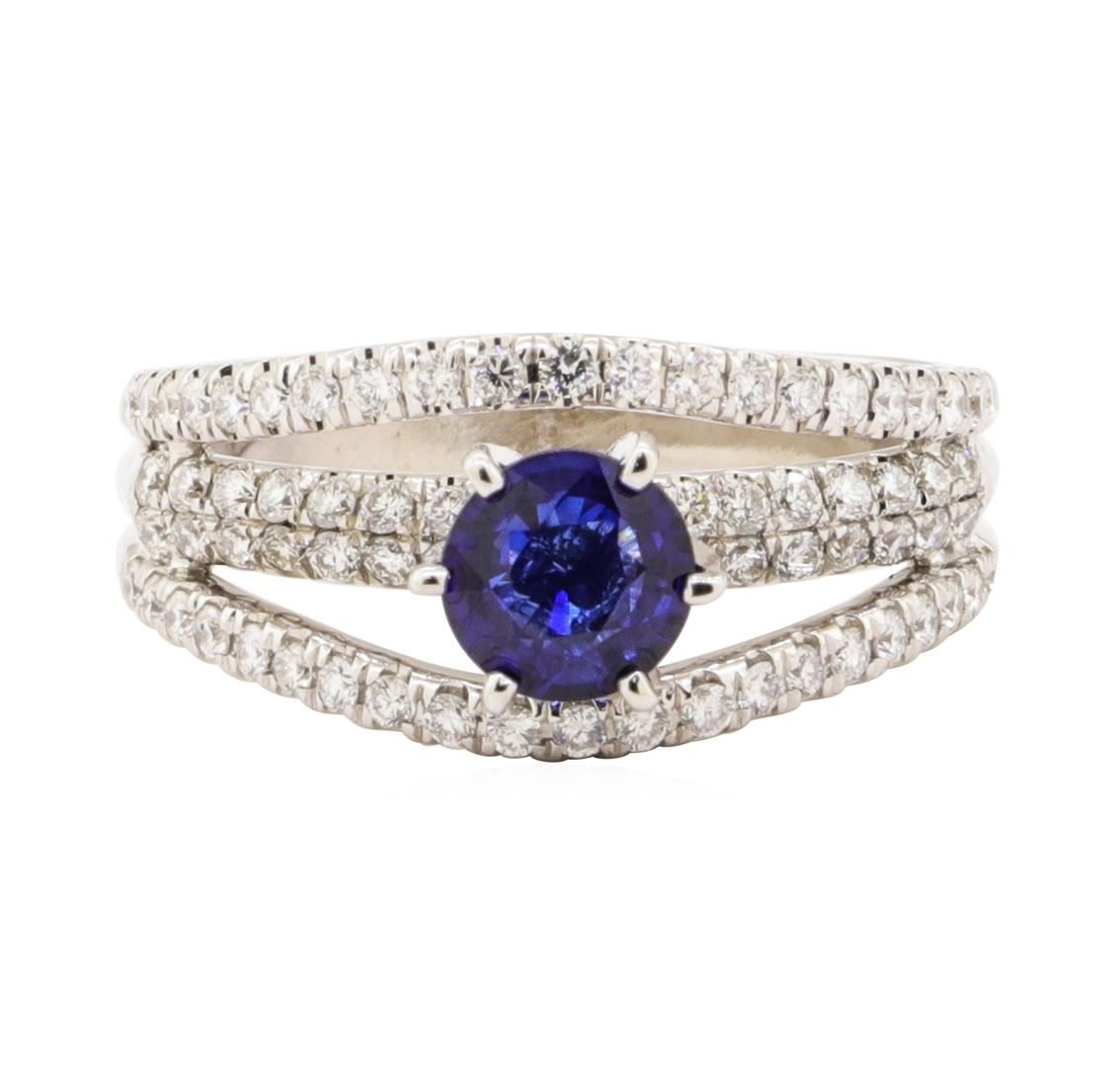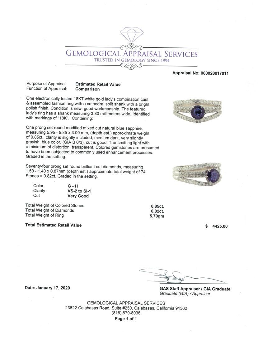 One electronically tested 18KT white gold lady's combination cast & assembled fashion ring with a cathedral split shank with a bright polish finish. The featured lady's ring has a shank measuring 3.80 millimeters wide. Identified with markings of '18K'. Condition is new, good workmanship. Containing: One prong set round modified mixed cut natural blue sapphire, measuring 5.95 - 5.85 x 3.00 mm, (depth est.) approximate weight of 0.85ct., clarity is slightly included, medium dark, very slightly grayish, blue color, (GIA B 6/3), cut is good. Transmitting light with a minimum of distortion, transparent. Colored gemstones are presumed to have been subjected to commonly used enhancement processes. Graded in the setting. Seventy-Four prong set round brilliant cut diamonds, measuring 1.50 - 1.40 x 0.87mm (depth est.) approximate total weight of 74 Stones = 0.82ct. Graded in the setting. Color G - H Clarity VS-2 to SI-1 Cut Very Good. Total Weight of Colored Stones 0.85ct.. Total Weight of Diamonds 0.82ct.. Total Weight of Ring 5.70gm GAS Appraised at $4425.00. GAS Appraised.