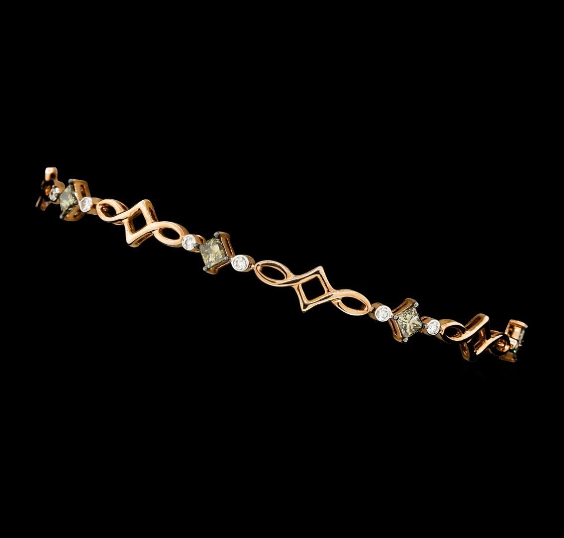 One electronically tested 14KT rose gold lady's combination cast & assembled fashion bracelet with a tongue clasp with double foldover safeties with a bright polish finish. The featured lady's bracelet measures approximately 7.5 inches in length. Identified with markings of '14K'. Condition is new, good workmanship. Containing: Seven prong set princess cut diamonds, measuring 3.30 x 3.00 x 2.25mm (depth est.) approximate total weight of 7 Stones = 1.38ct. Colored gemstones are presumed to have been subjected to commonly used enhancement processes. Graded in the setting. Color Fancy Light Brownish Greenish Yellow Clarity VS-2 to SI-2 Cut Good Fourteen bezel set round brilliant cut diamonds, measuring 1.80 - 1.70 x 1.09mm (depth est.) approximate total weight of 14 Stones = 0.29ct. Graded in the setting. Color H - I Clarity SI-1 to SI-2 Cut Very Good. Total Weight of Diamonds 1.67ct.. Total Weight of Bracelet 8.70gm GAS Appraised at $4215.00. GAS Appraised.