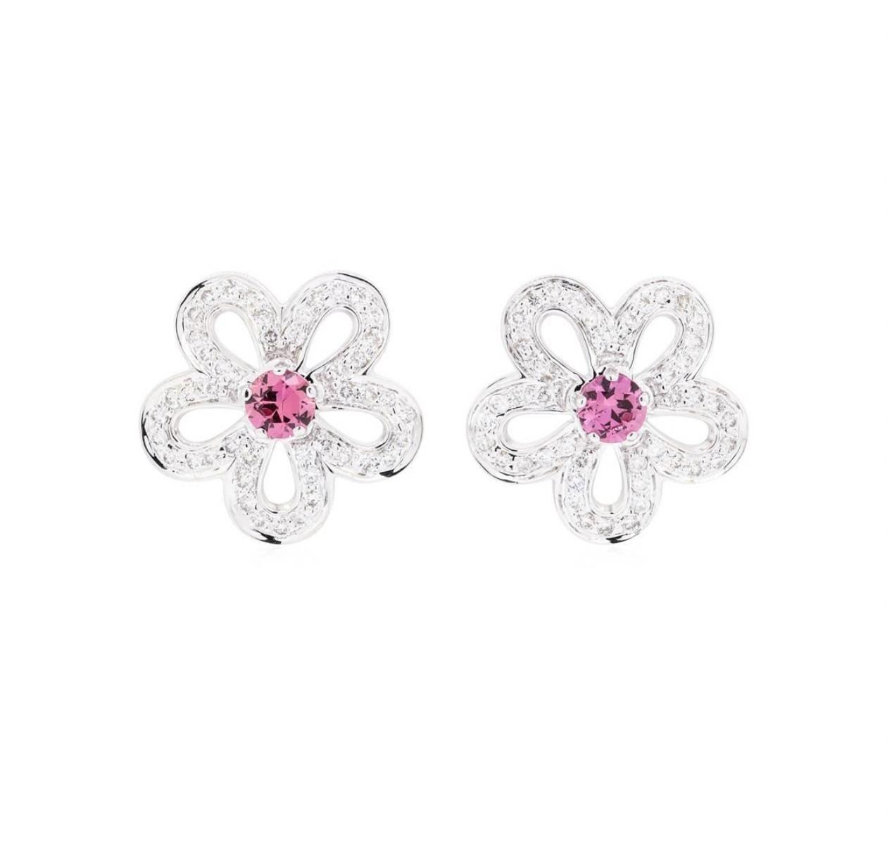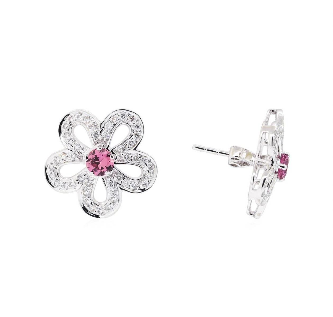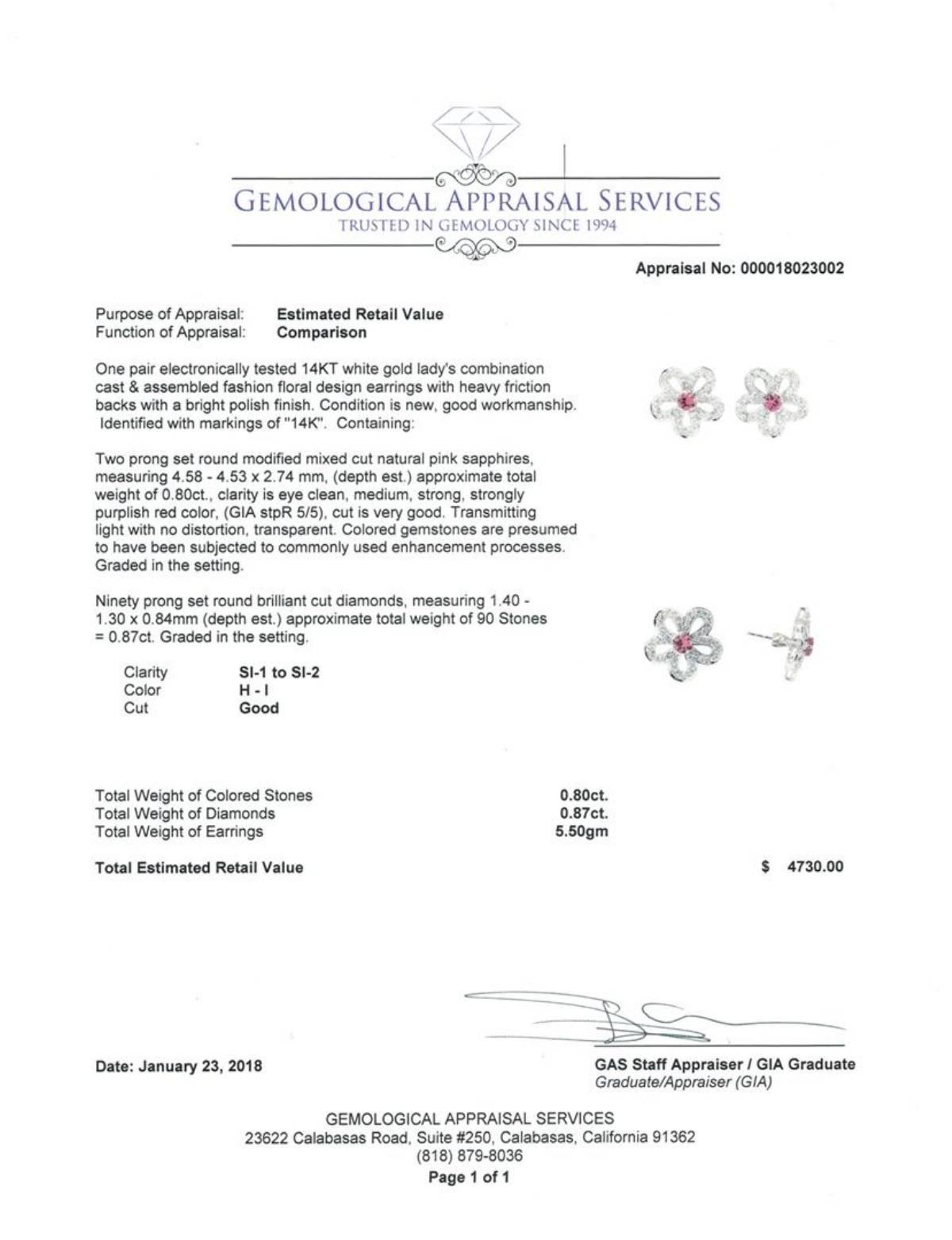 One pair electronically tested 14KT white gold lady's combination cast & assembled fashion floral design earrings with heavy friction backs with a bright polish finish. Identified with markings of '14K'. Condition is new, good workmanship. Containing: Two prong set round modified mixed cut natural pink sapphires, measuring 4.58 - 4.53 x 2.74 mm, (depth est.) approximate total weight of 0.80ct., clarity is eye clean, medium, strong, strongly purplish red color, (GIA stpR 5/5), cut is very good. Transmitting light with no distortion, transparent. Colored gemstones are presumed to have been subjected to commonly used enhancement processes. Graded in the setting. Ninety prong set round brilliant cut diamonds, measuring 1.40 - 1.30 x 0.84mm (depth est.) approximate total weight of 90 Stones = 0.87ct. Graded in the setting. Color H - I Clarity SI-1 to SI-2 Cut Good. Total Weight of Colored Stones 0.80ct.. Total Weight of Diamonds 0.87ct.. Total Weight of Earrings 5.50gm GAS Appraised at $4730.00. GAS Appraised.