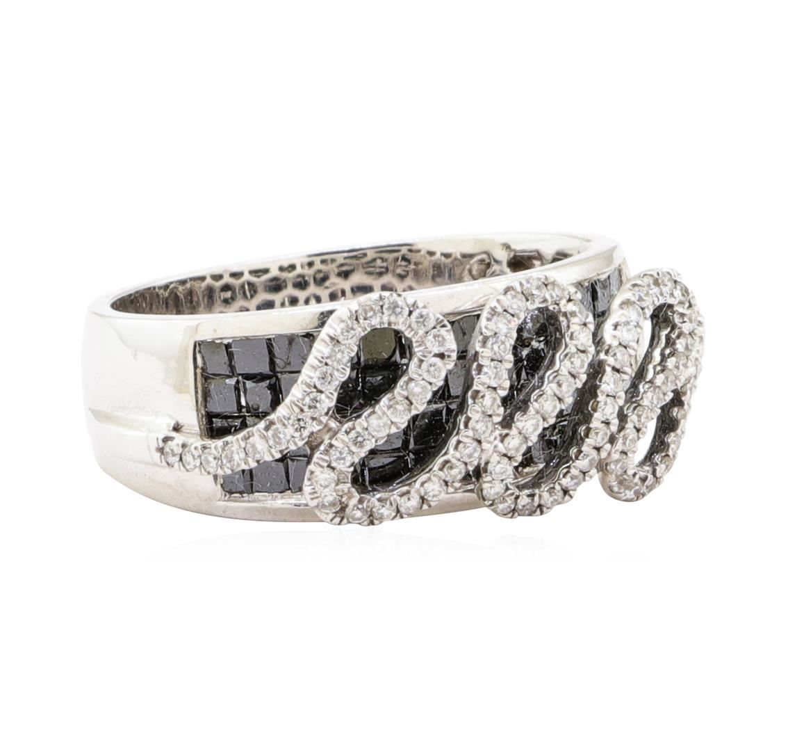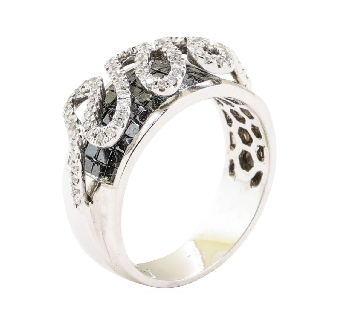 One electronically tested 14KT white gold lady's combination cast & assembled fashion ring with a wide band half dome with a bright polish finish. The featured lady's ring has wave accents and a shank measuring 5.00 millimeters wide. Identified with markings of '14K'. Condition is new, good workmanship. Containing: Fifty-Six invisible set princess cut treated diamonds, measuring 1.80 x 1.50 x 1.13mm (depth est.) approximate total weight of 56 Stones = 1.38ct. Colored gemstones are presumed to have been subjected to commonly used enhancement processes. Graded in the setting. Color Fancy Black Cut Good Eighty-Three prong set round brilliant cut diamonds, measuring 1.00 - 0.95 x 0.61mm (depth est.) approximate total weight of 83 Stones = 0.30ct. Graded in the setting. Color G - H Clarity SI-1 to I-1 Cut Good. Total Weight of Diamonds 1.68ct.. Total Weight of Ring 6.70gm GAS Appraised at $3955.00. GAS Appraised.