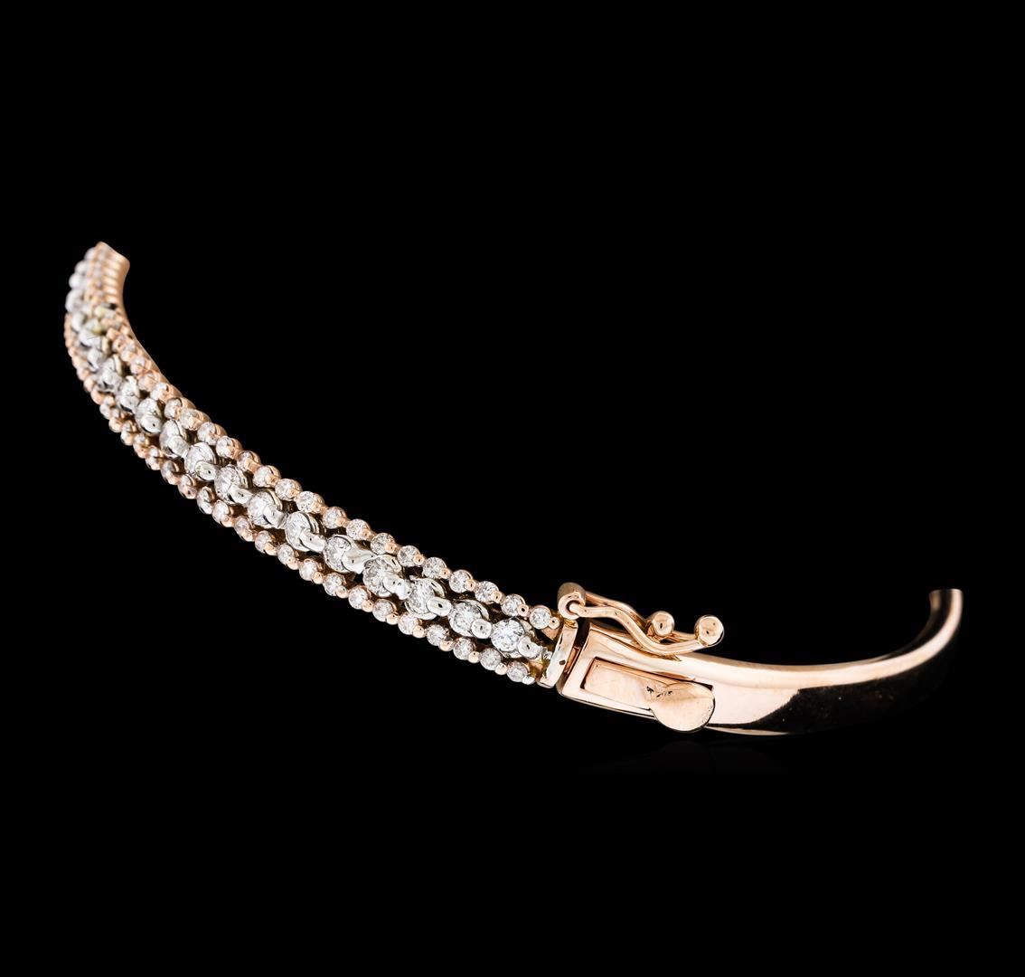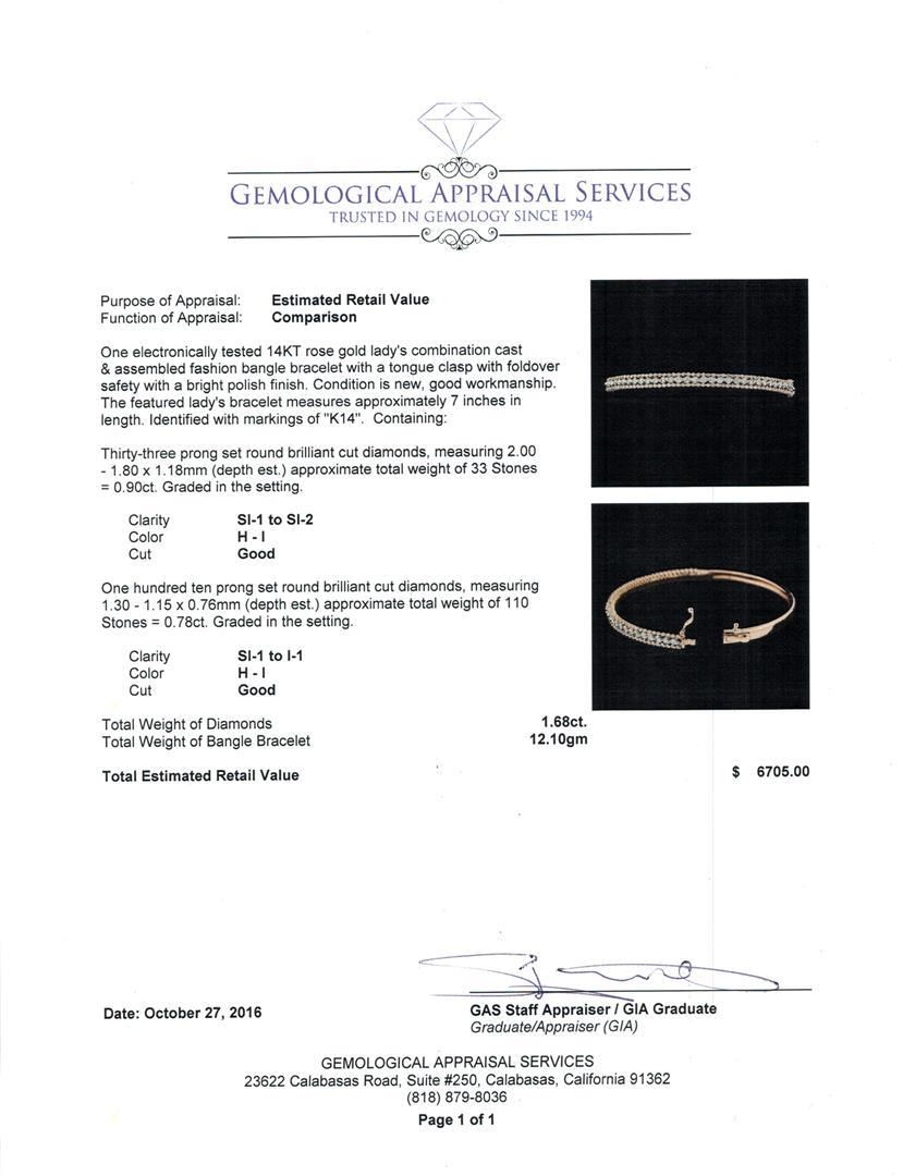 One electronically tested 14KT rose gold lady's combination cast & assembled fashion bangle bracelet with a tongue clasp with foldover safety with a bright polish finish. The featured lady's bracelet measures approximately 7 inches in length. Identified with markings of 'K14'. Condition is new, good workmanship. Containing: Thirty-Three prong set round brilliant cut diamonds, measuring 2.00 - 1.80 x 1.18mm (depth est.) approximate total weight of 33 Stones = 0.90ct. Graded in the setting. Clarity SI-1 to SI-2. Color: H - I Cut Good One Hundred Ten prong set round brilliant cut diamonds, measuring 1.30 - 1.15 x 0.76mm (depth est.) approximate total weight of 110 Stones = 0.78ct. Graded in the setting. Clarity SI-1 to I-1. Color: H - I Cut Good. Total Weight of Diamonds 1.68ct.. Total Weight of Bangle Bracelet 12.10gm. GAS Appraised.