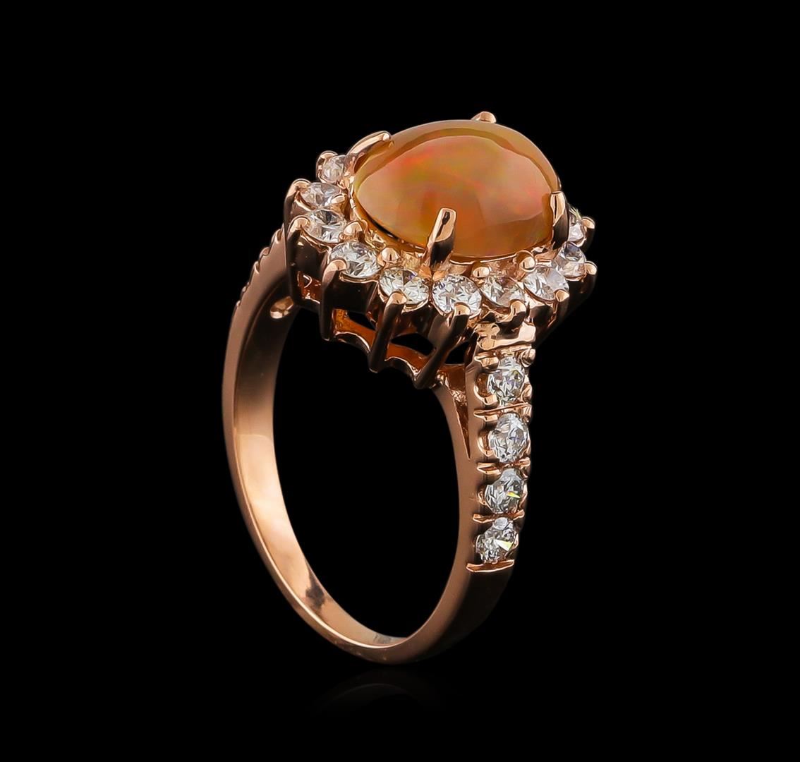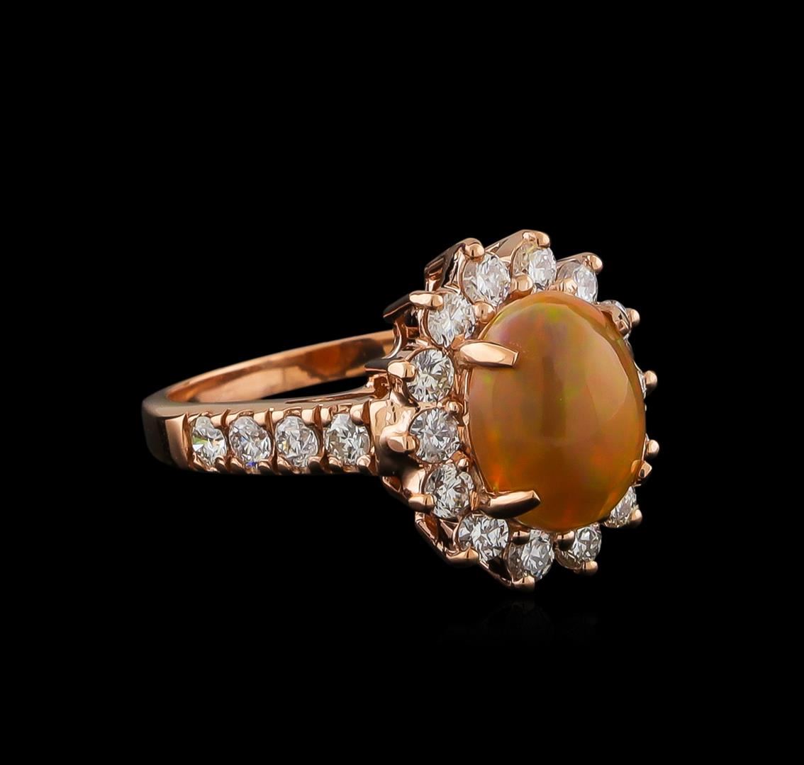 One electronically tested 14KT rose gold lady's cast fashion ring with a basket halo with a bright polish finish. The featured lady's ring has a shank measuring 1.85 millimeters wide. Identified with markings of "K14". Condition is new, good workmanship. Containing: One orange opal that is cut in a oval shaped cabochon and is prong set, measuring 10.08 mm long x 8.09 mm wide, and 4.49 mm thick and the approximate weight is 1.68 carats. The opal has a somewhat bright, orange-green play of color (fire) in a rolling flashfire pattern; a medium dome; a good cut; no inclusions; consistent in its brightness and pattern; and is not directional. Graded in the setting. Twenty-Two prong set round brilliant cut diamonds, measuring 2.30 - 2.25 x 1.41mm (depth est.) approximate total weight of 22 Stones = 0.98ct. Graded in the setting. Clarity: SI-1 to I-1. Color: G - Very Good. Total Weight of Diamonds 0.98ct. Total Weight of Opals 1.68ct. Total Weight of Ring 4.70gm. GAS Appraised.