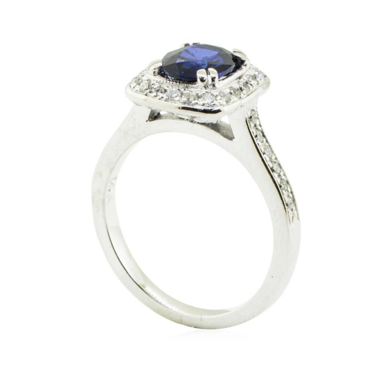 One electronically tested 14KT white gold lady's cast fashion straight line halo ring with a bright polish with milgrain detailing finish. The featured lady's ring has a shank measuring 2.00 millimeters in width. Identified with markings of '14K'. Condition is like new, good workmanship. One prong set oval modified brilliant cut natural blue sapphire, measuring 7.96 x 5.97 x 3.46mm, (depth est.) approximate weight of 1.34ct., clarity is slightly included, dark, moderately strong, blue color, (GIA B 7/4), cut is very good. Transmitting light with a minimum of distortion, transparent. Colored gemstones are presumed to have been subjected to commonly used enhancement processes. Graded in the setting. Thirty-Two bead set round brilliant cut diamonds, measuring 1.40 - 1.30 x 0.84mm (depth est.) approximate total weight of 32 Stones = 0.30 ct. Graded in the setting. Color G Clarity VS to SI-1 Cut Very Good Sixteen prong set round brilliant cut diamonds, measuring 0.90 - 0.85 x 0.53mm (depth est.) approximate total weight of 16 Stones = 0.04ct. Graded in the setting. Color G - H Clarity VS-2 to SI-2 Cut Good. Total Weight of Colored Stones 1.34ct.. Total Weight of Diamonds 0.34ct.. Total Weight of Ring 4.30gm GAS Appraised at $3415.00. GAS Appraised.